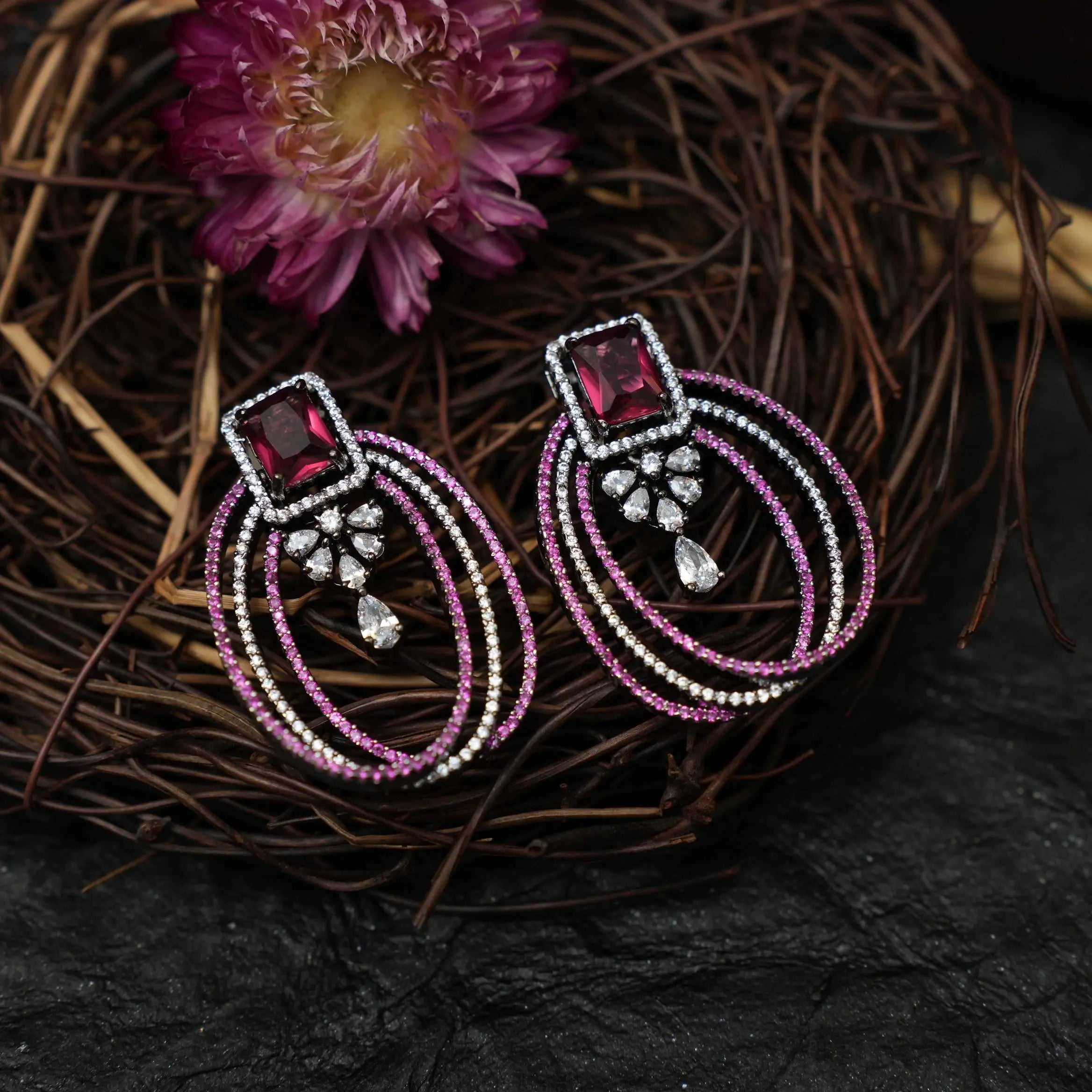 A simple and elegant designer earrings studded with reddish pink zircon stones and agate.