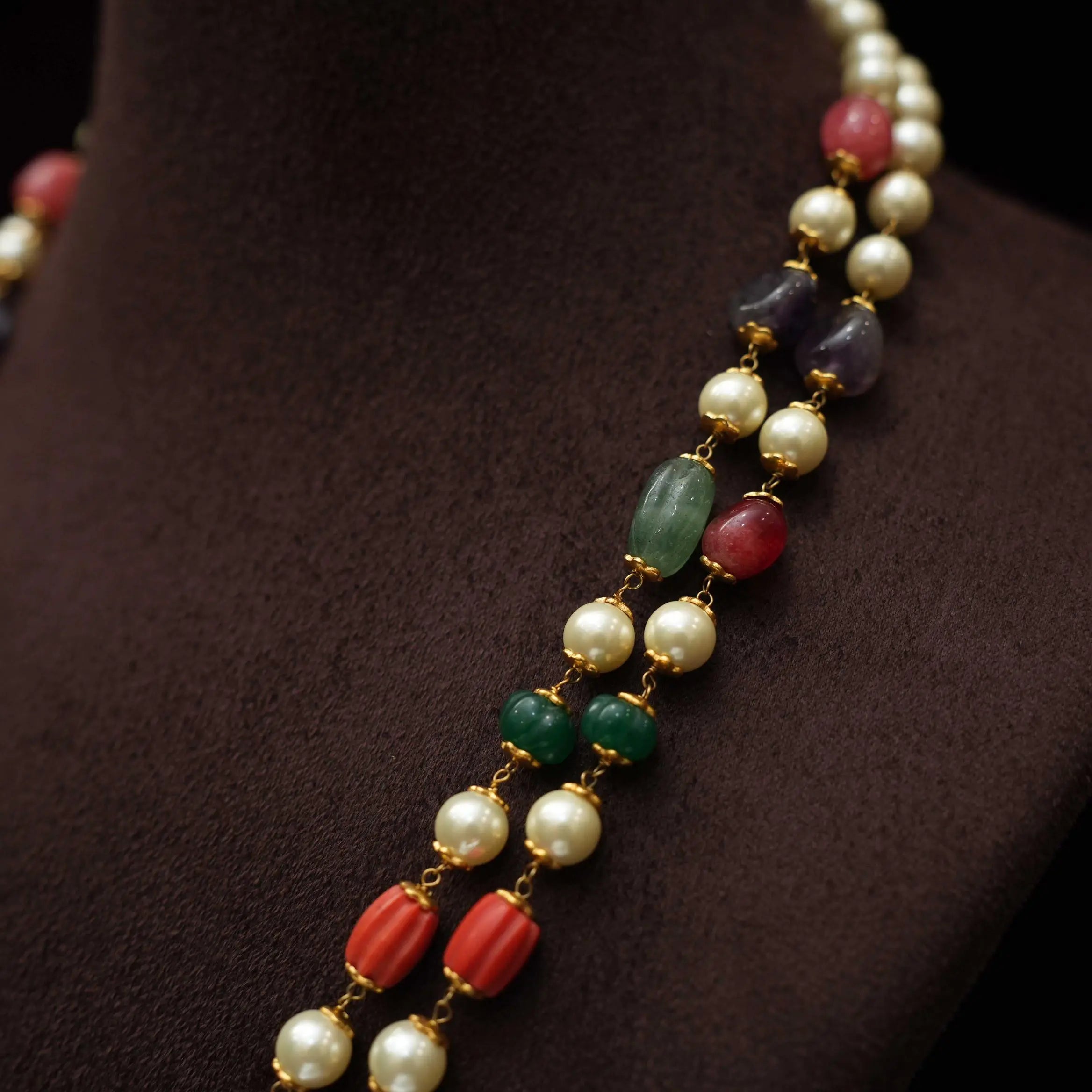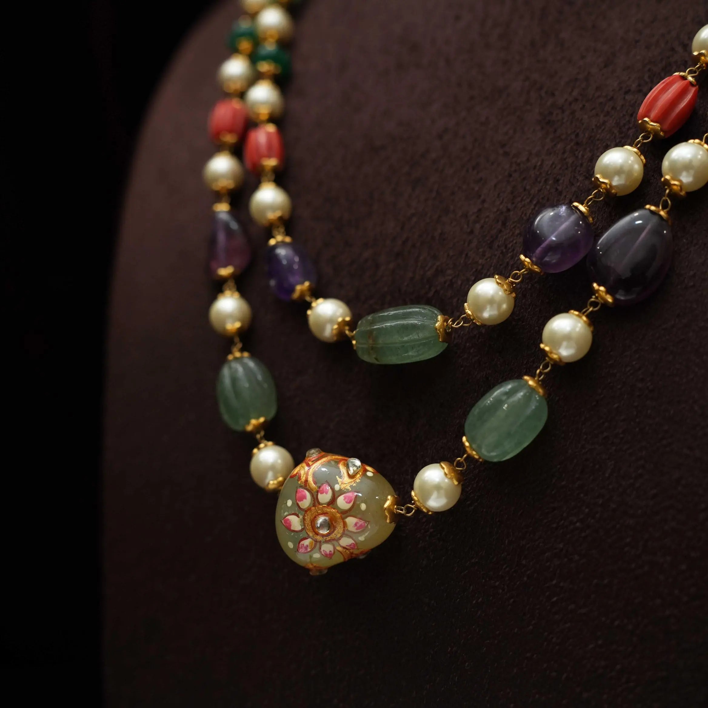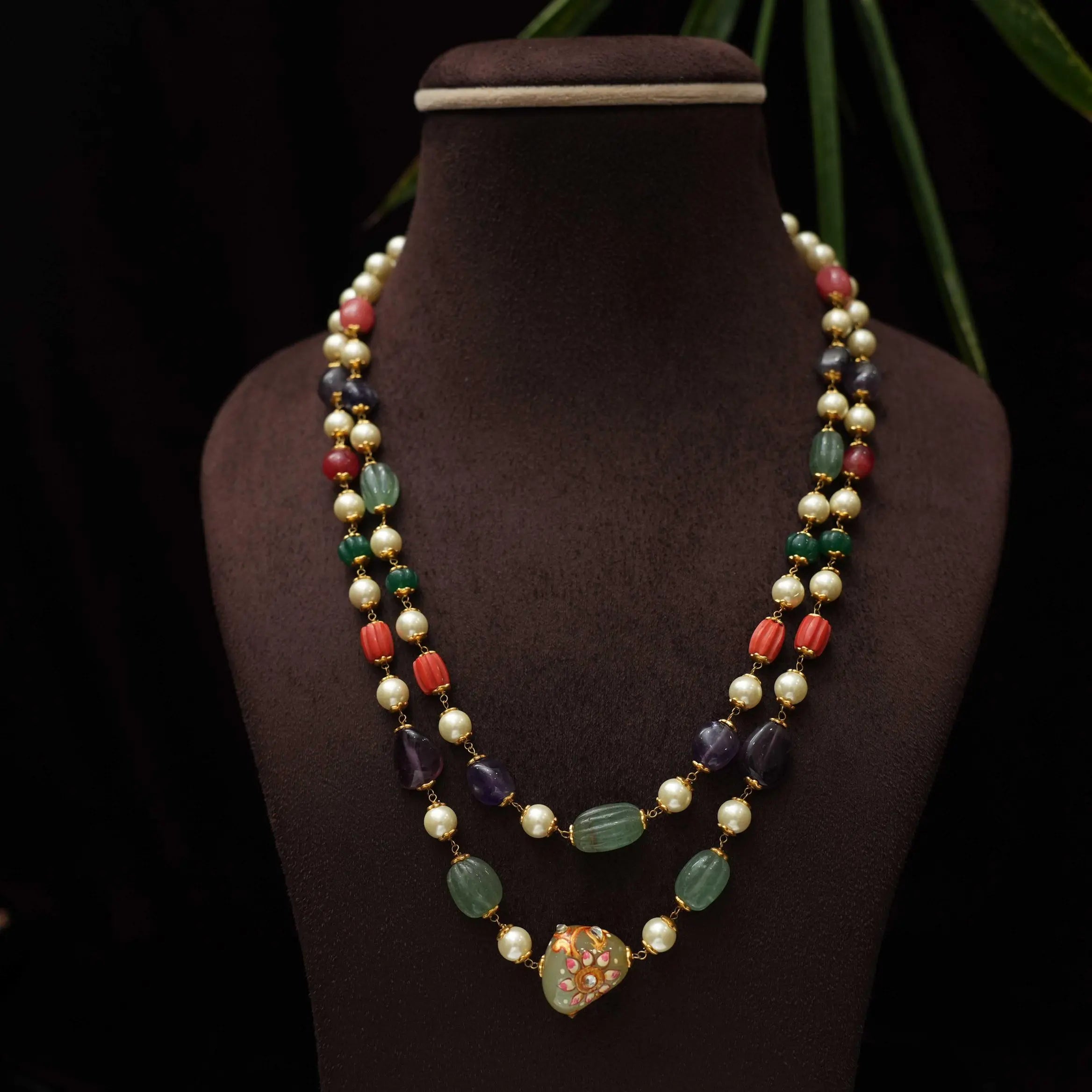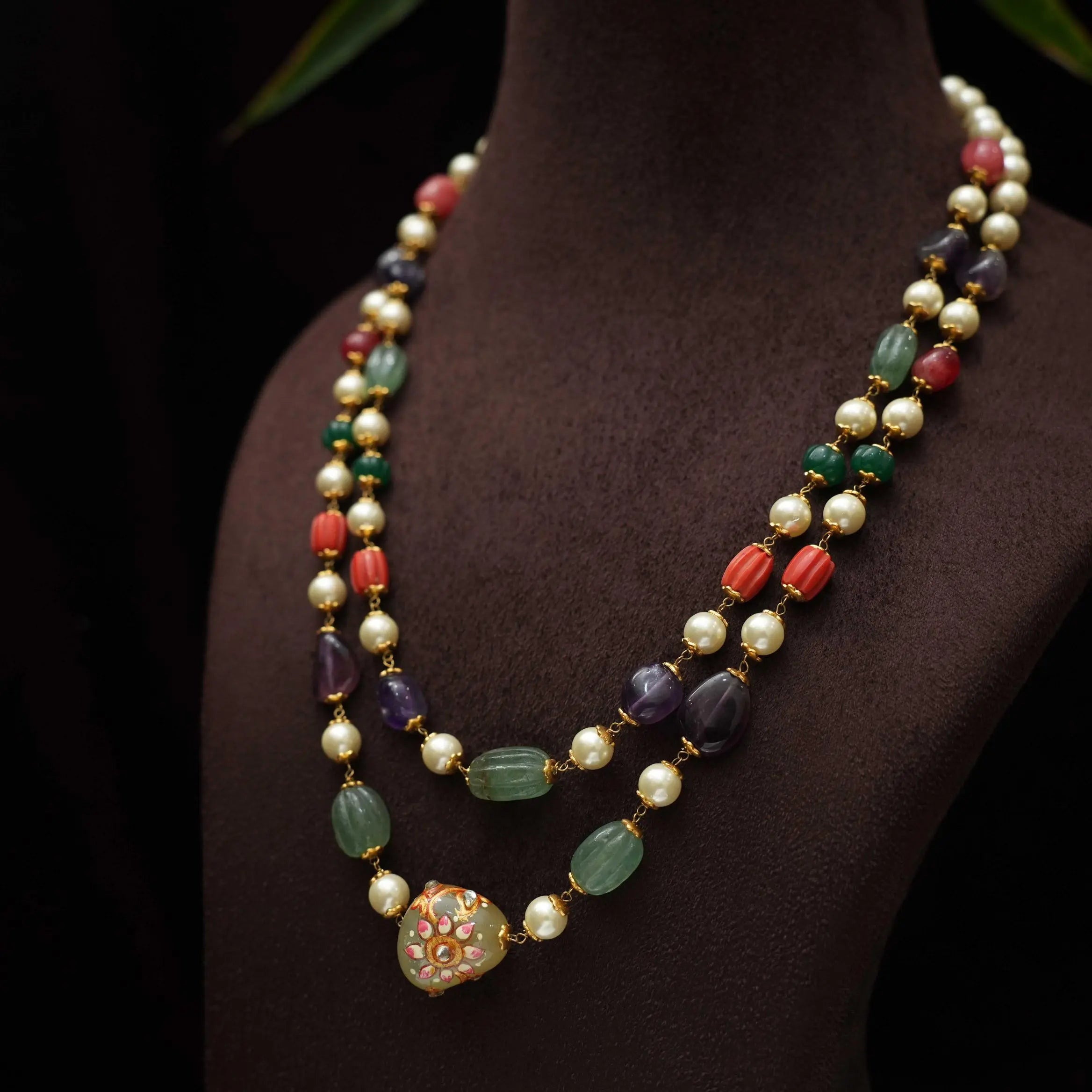 A classic layered beaded necklace in multicolor beads paired to meenakari pendant.