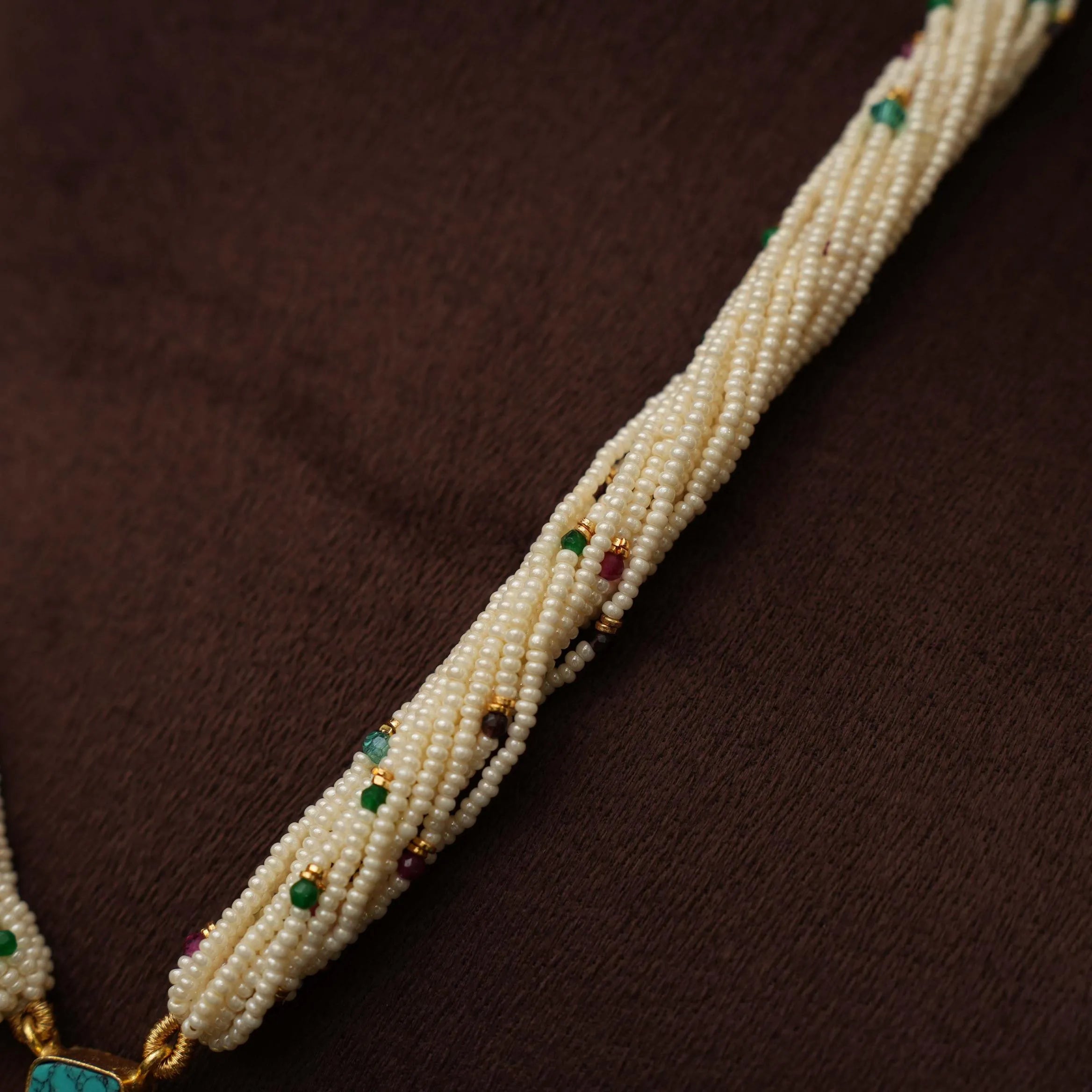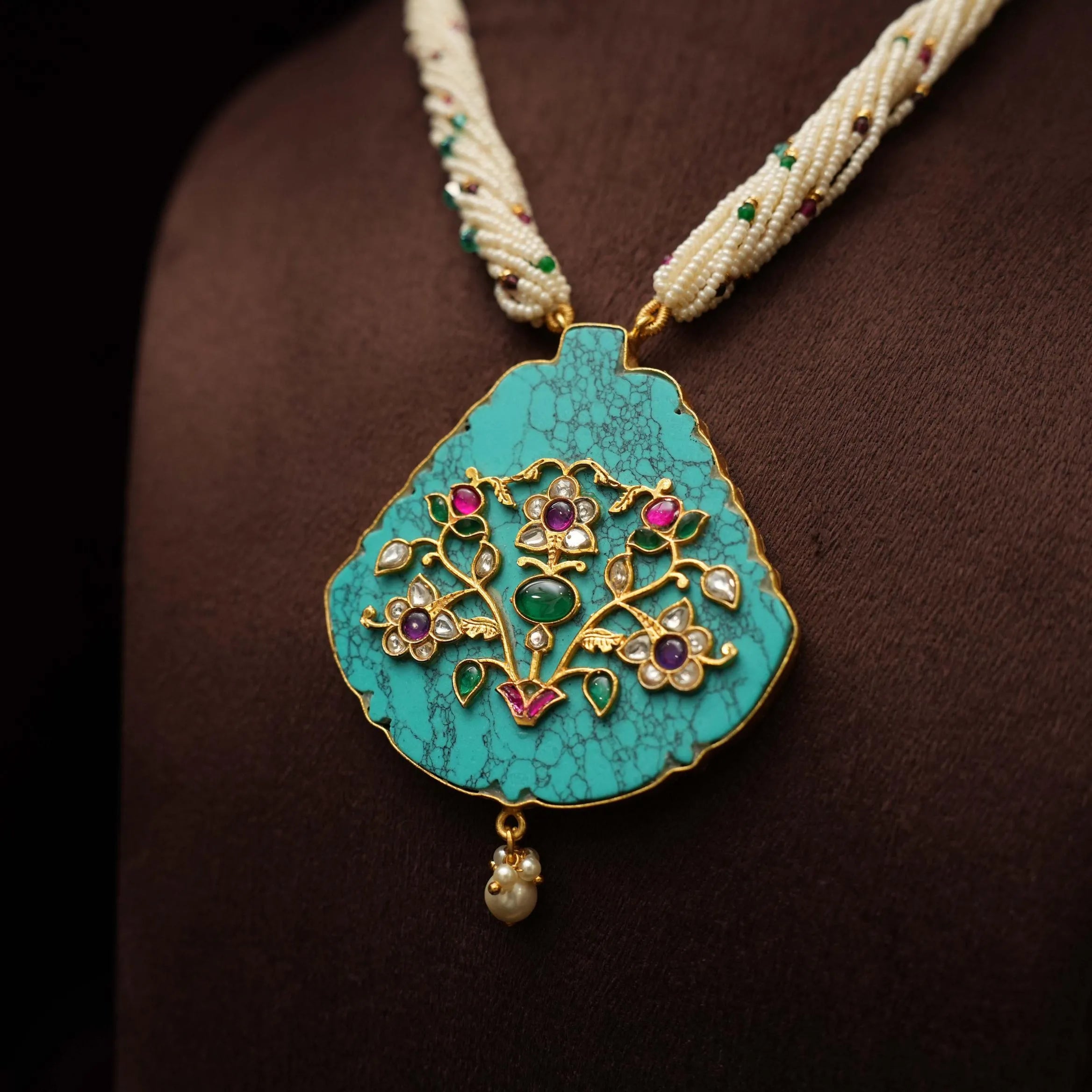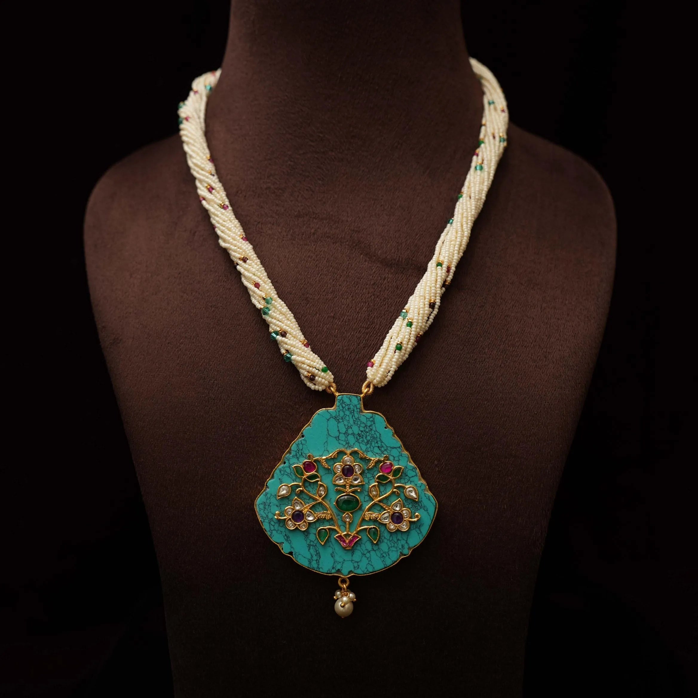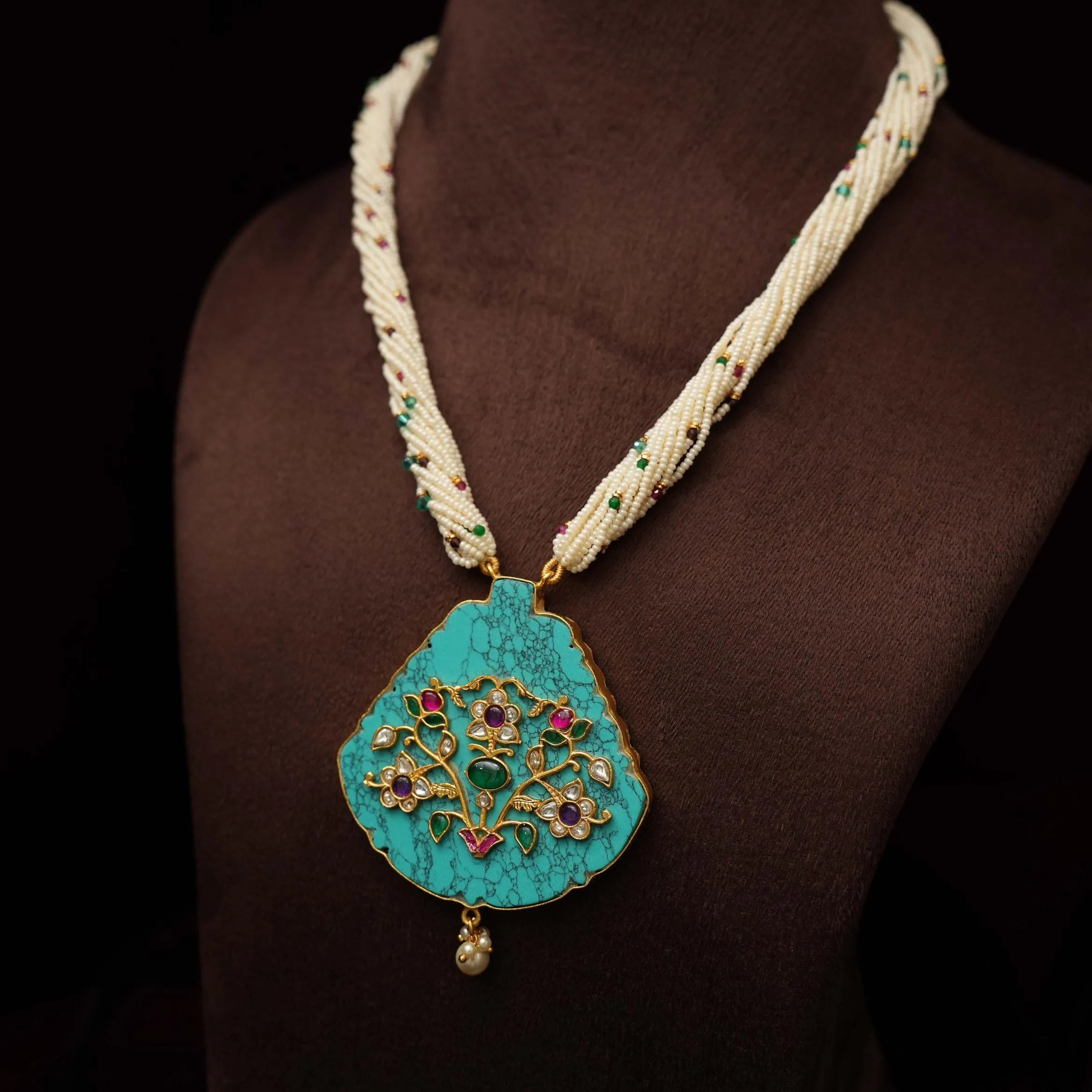 A beautiful necklace handcrafted with pearls paired to turquoise polki agate pendant.