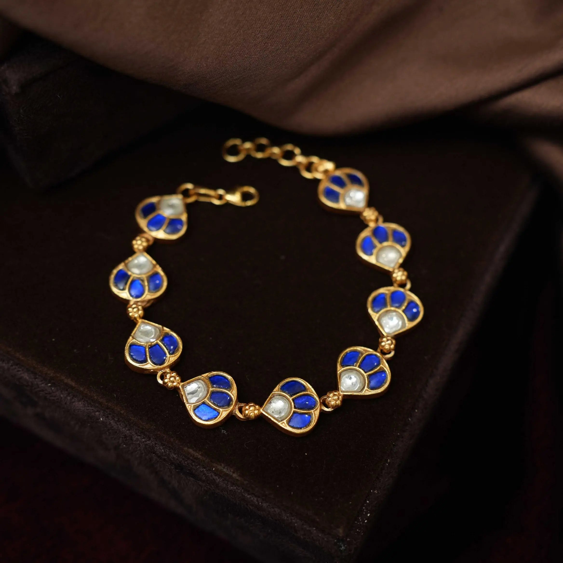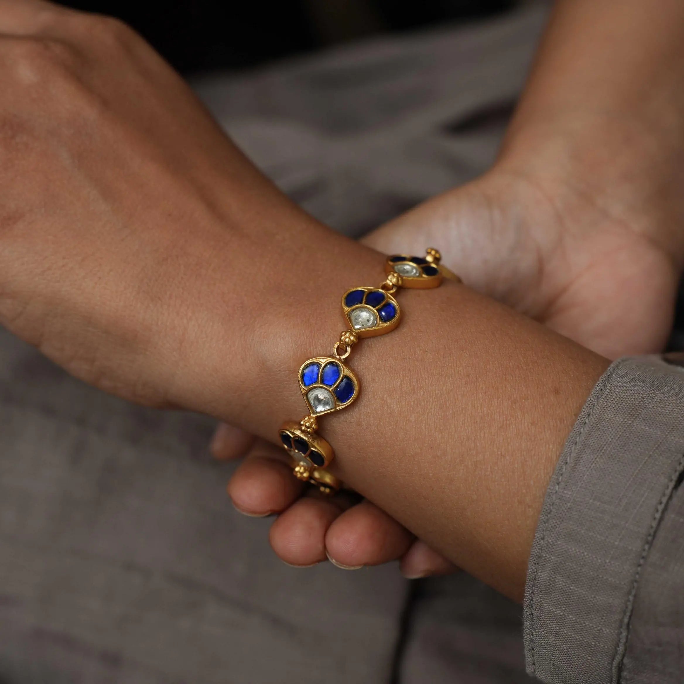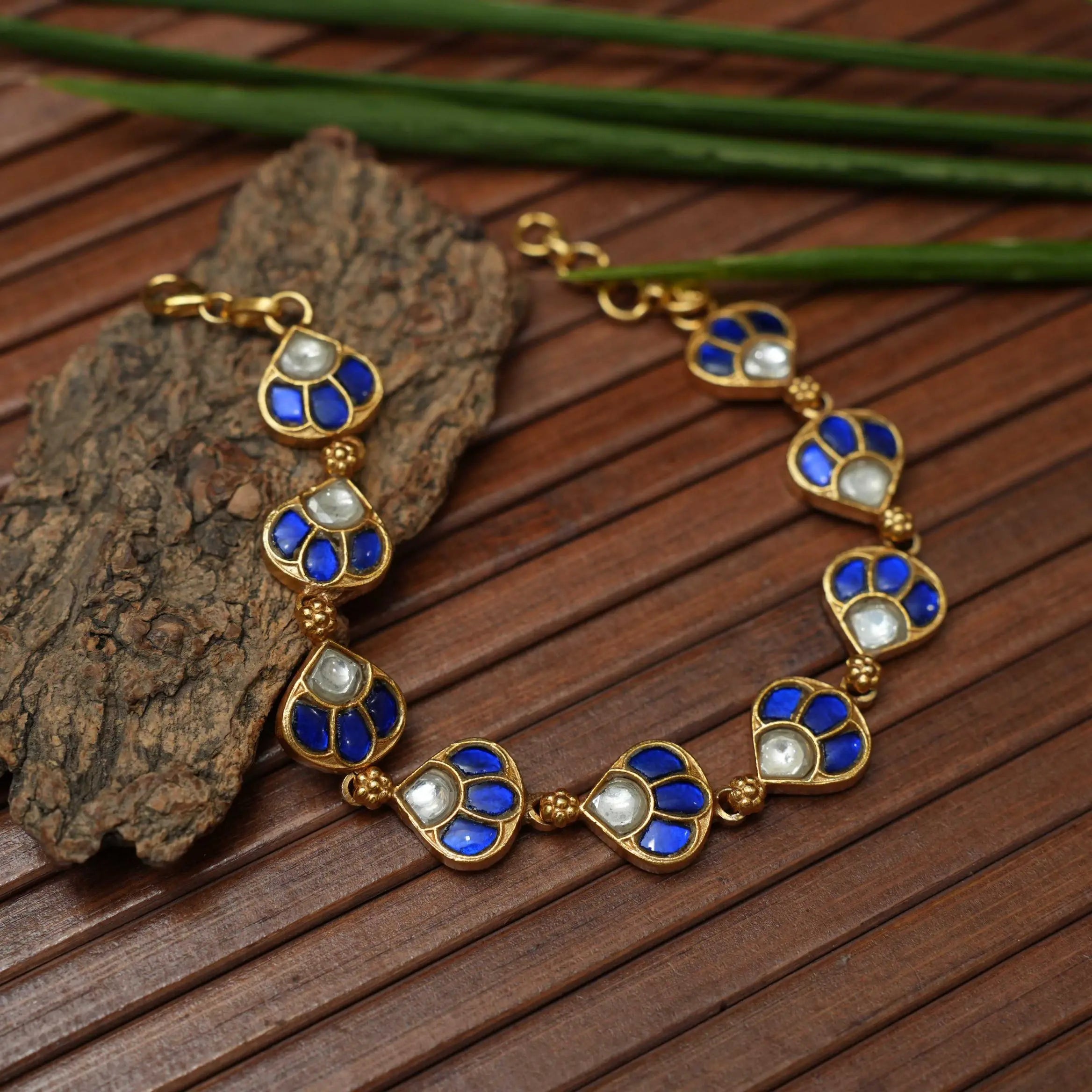 A classic silver bracelet handcrafted in geometrical motif studded with blue stones.