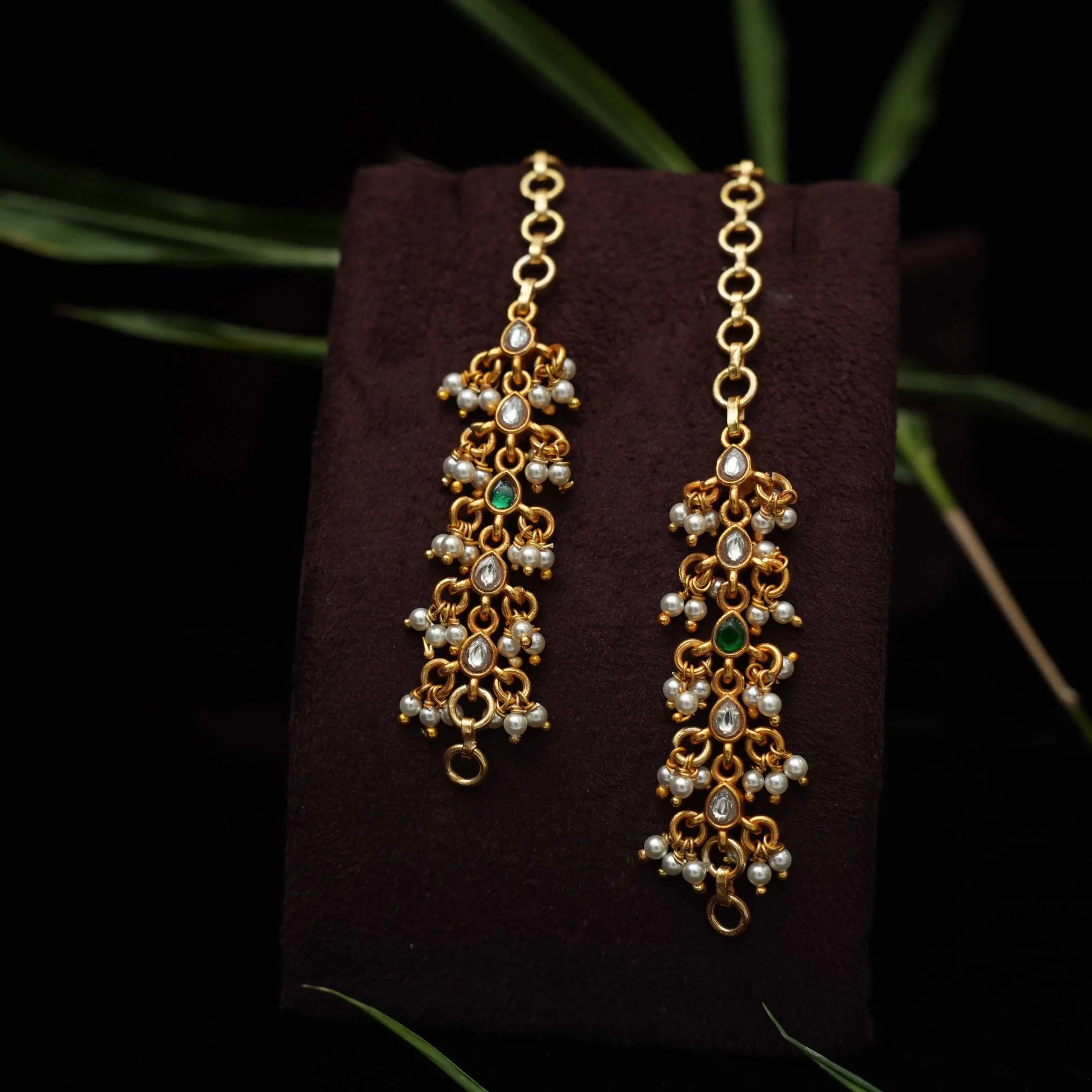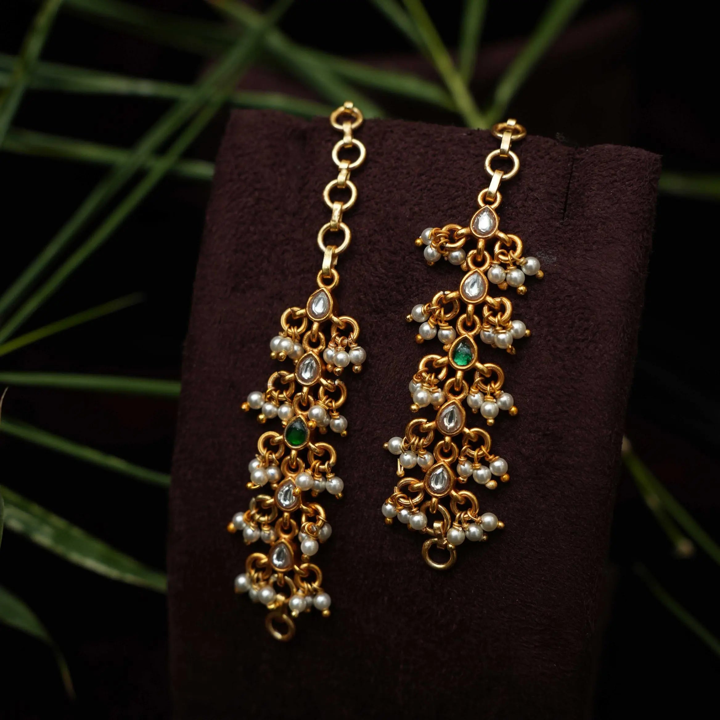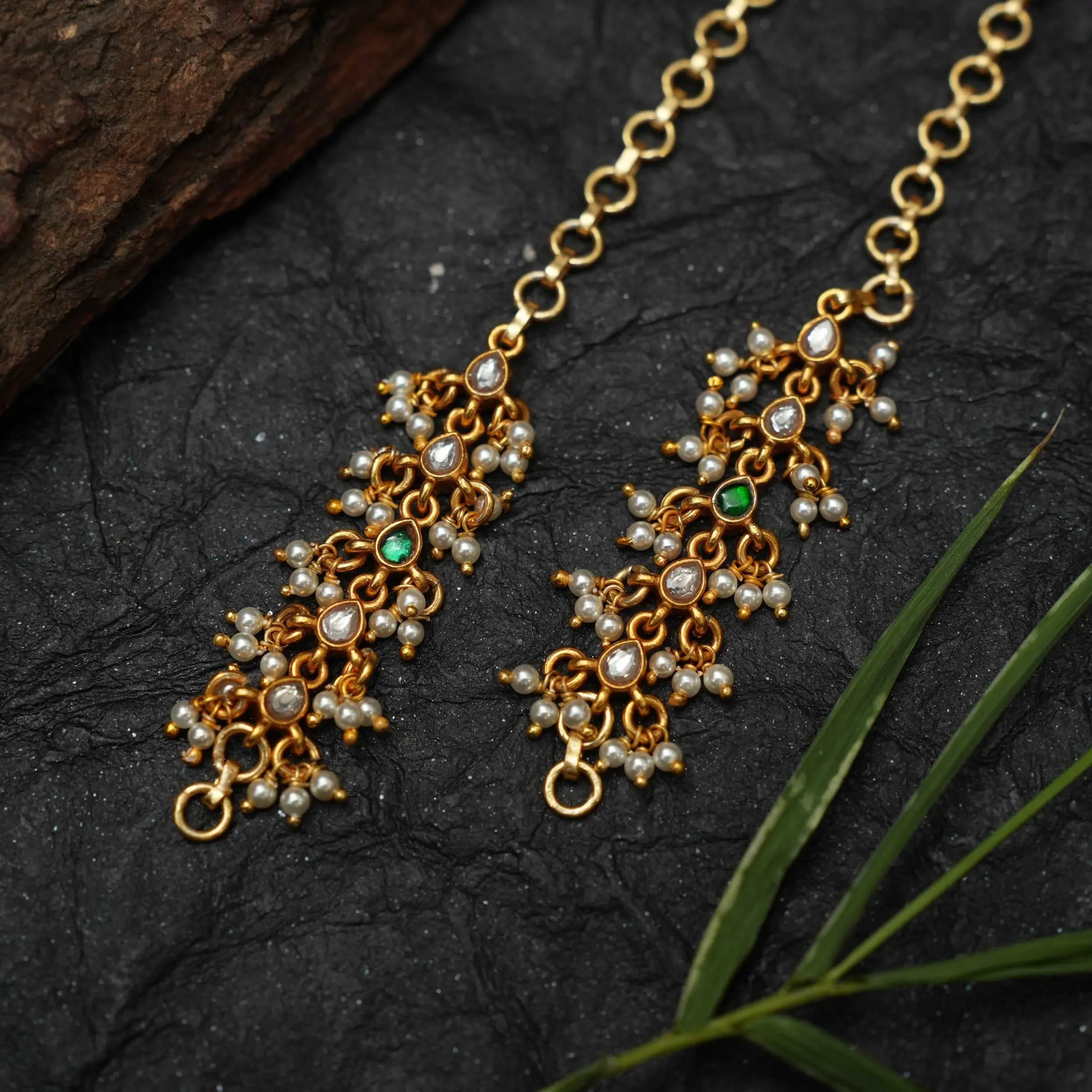 A simple and elegant silver ear chain handcrafted with green and white stones adorned with pearls. This ear chain comes as a pair.