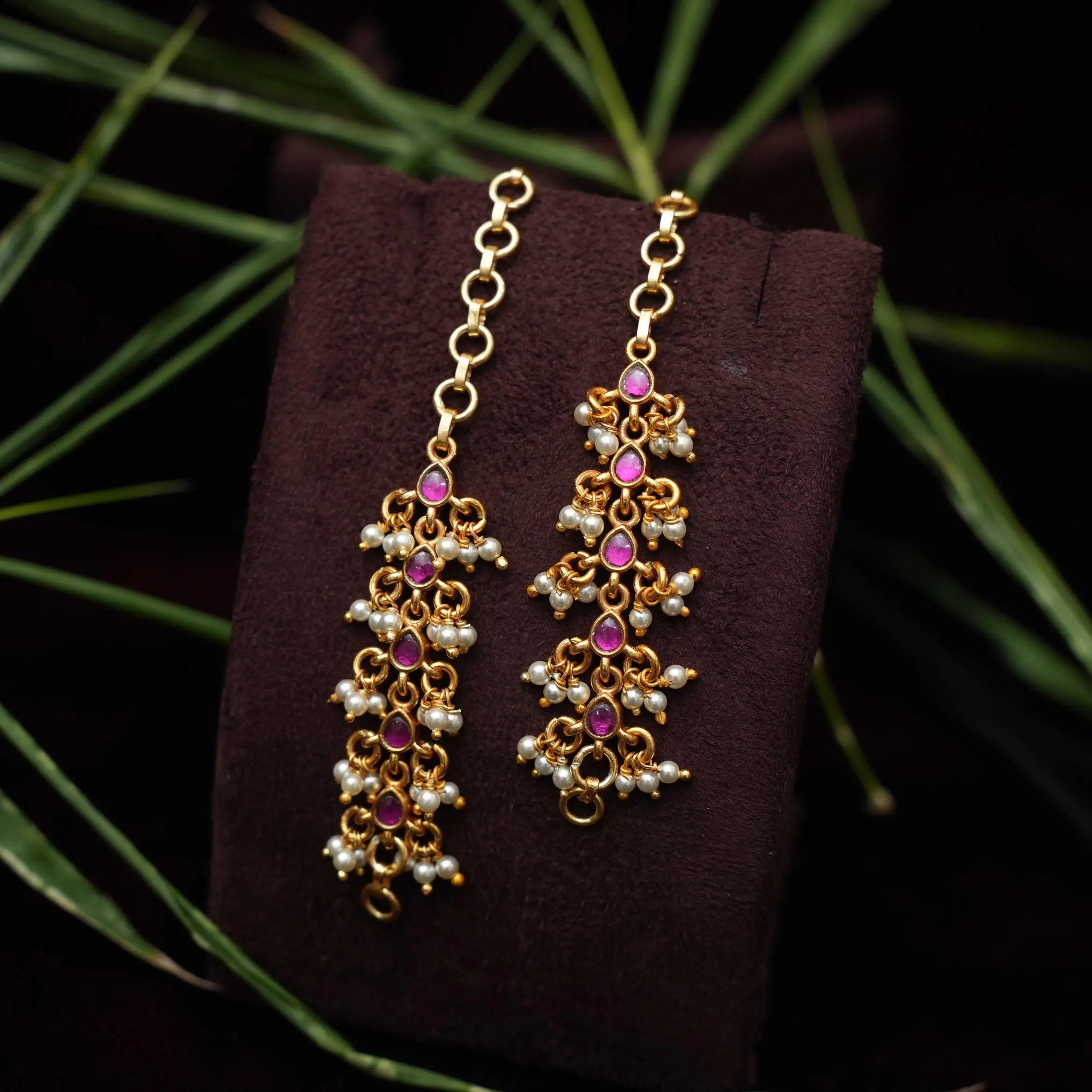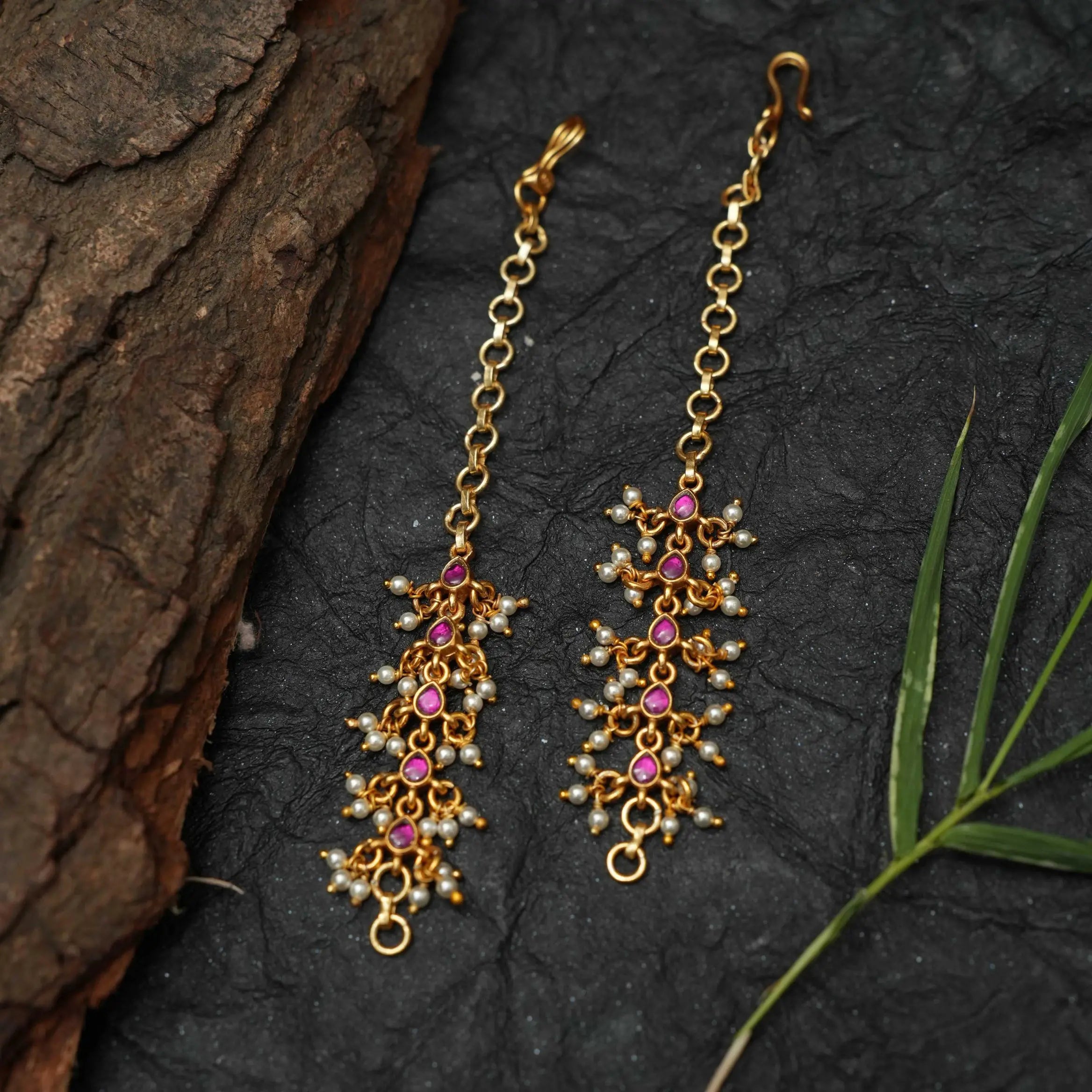 A simple and elegant silver ear chain handcrafted with red stones adorned with pearls. This ear chain comes as a pair.