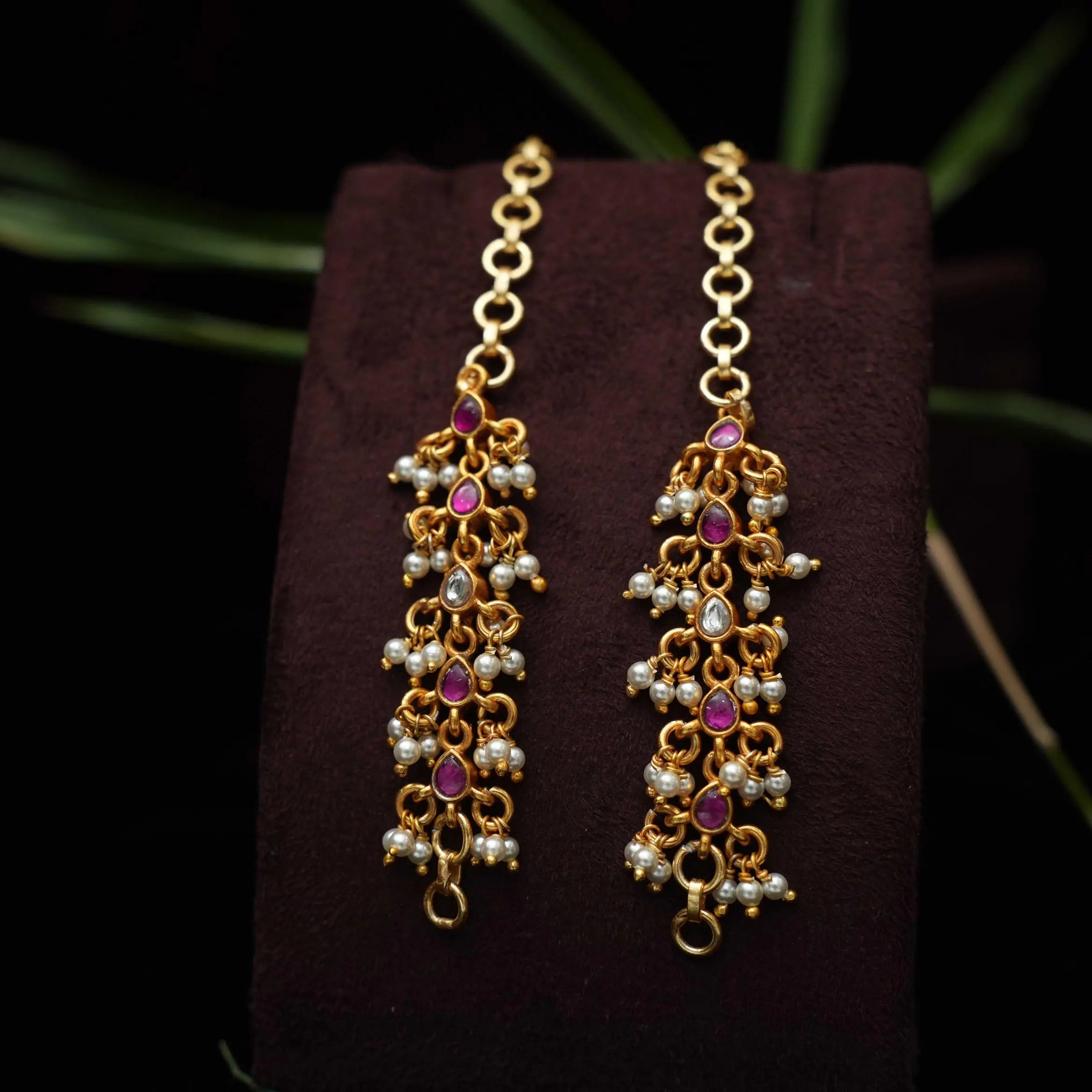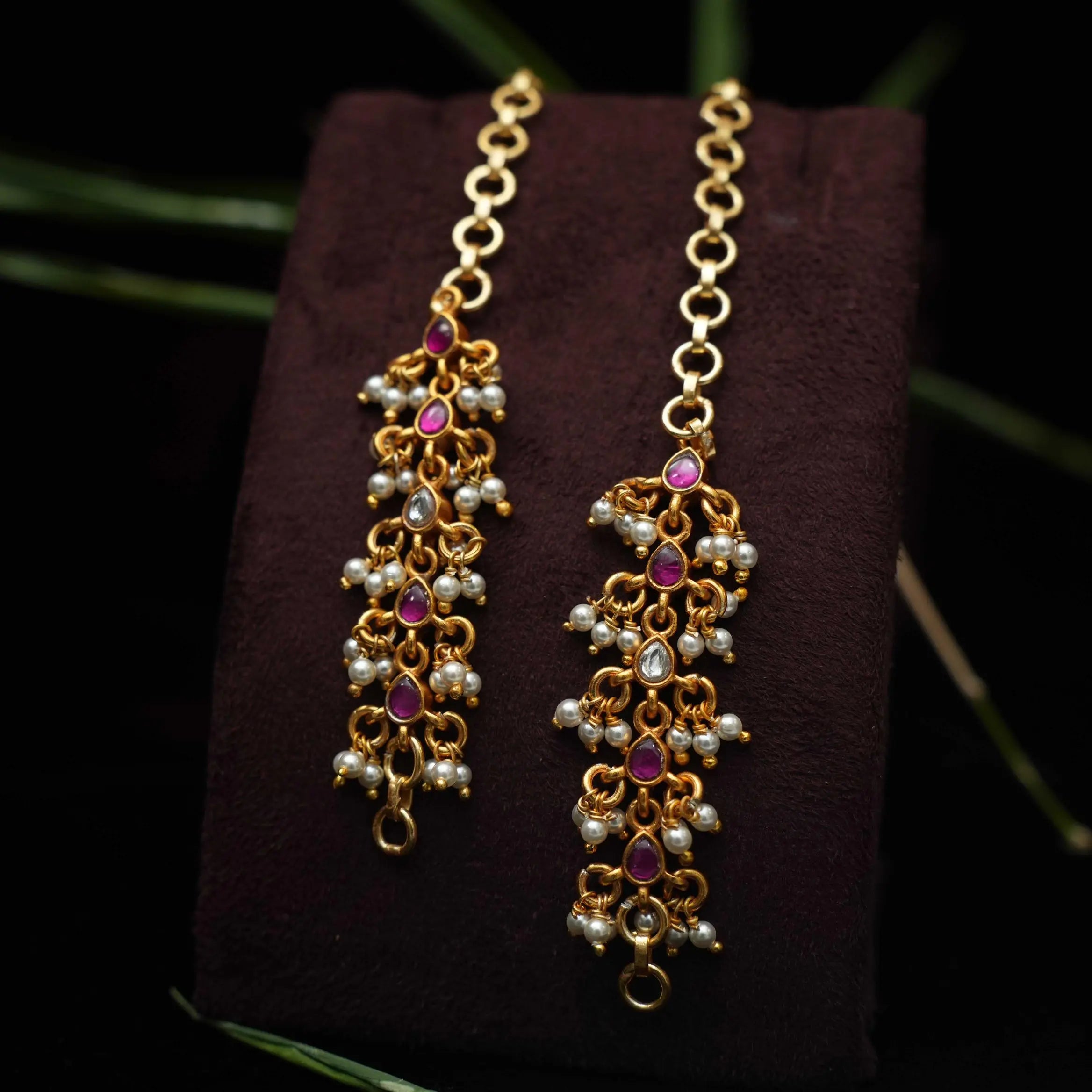 A simple and elegant silver mattal handcrafted with red and white stones adorned with pearls. This ear chain comes as a pair.