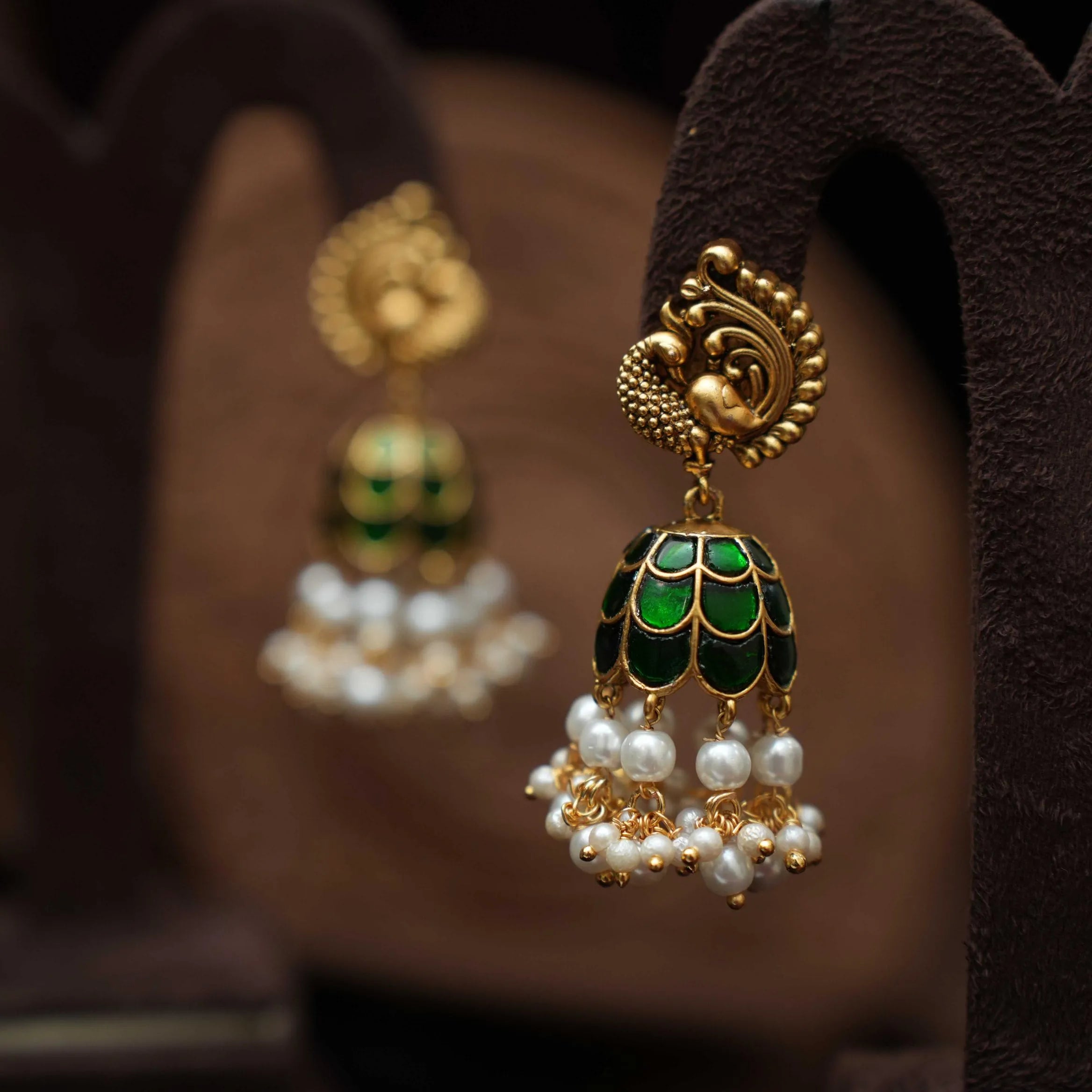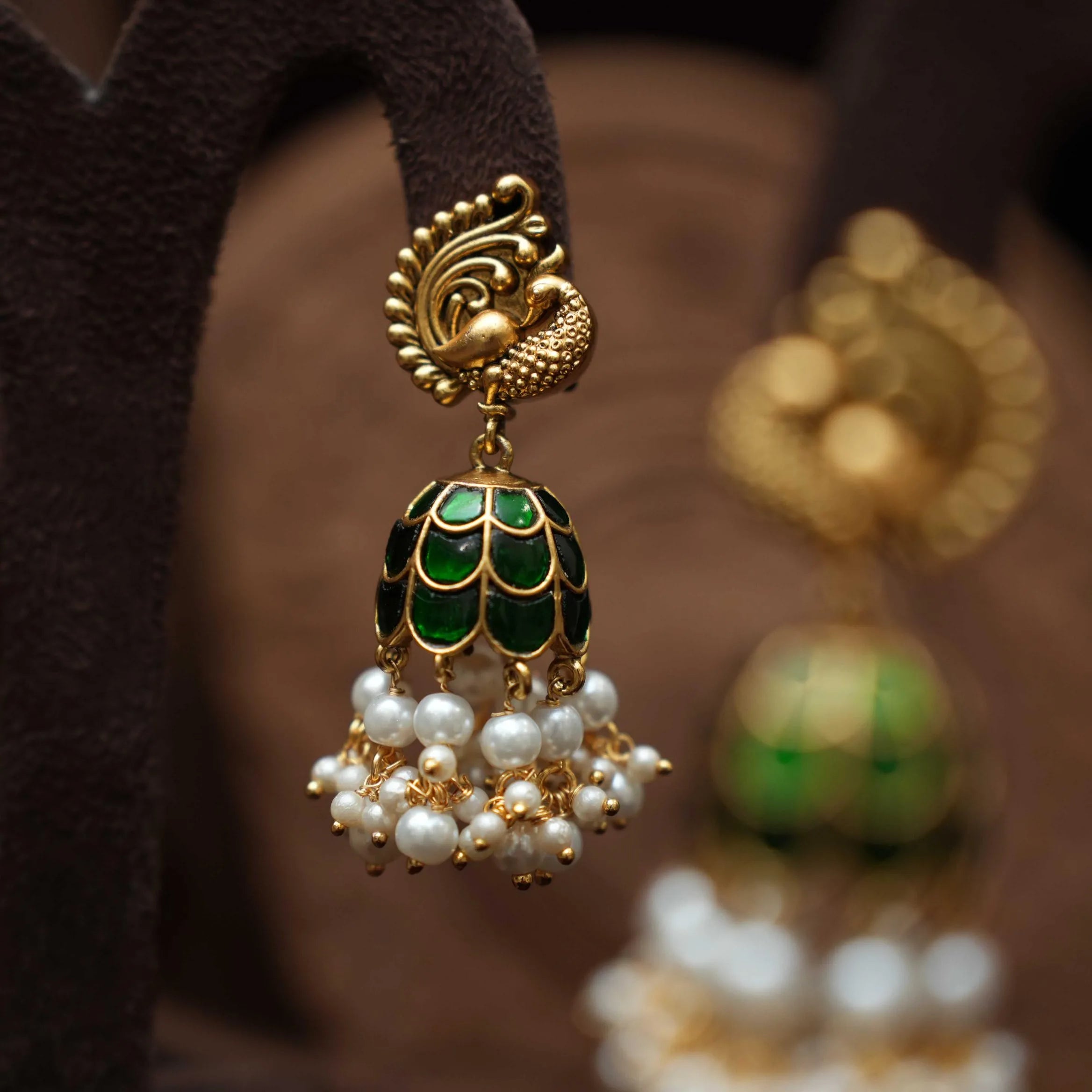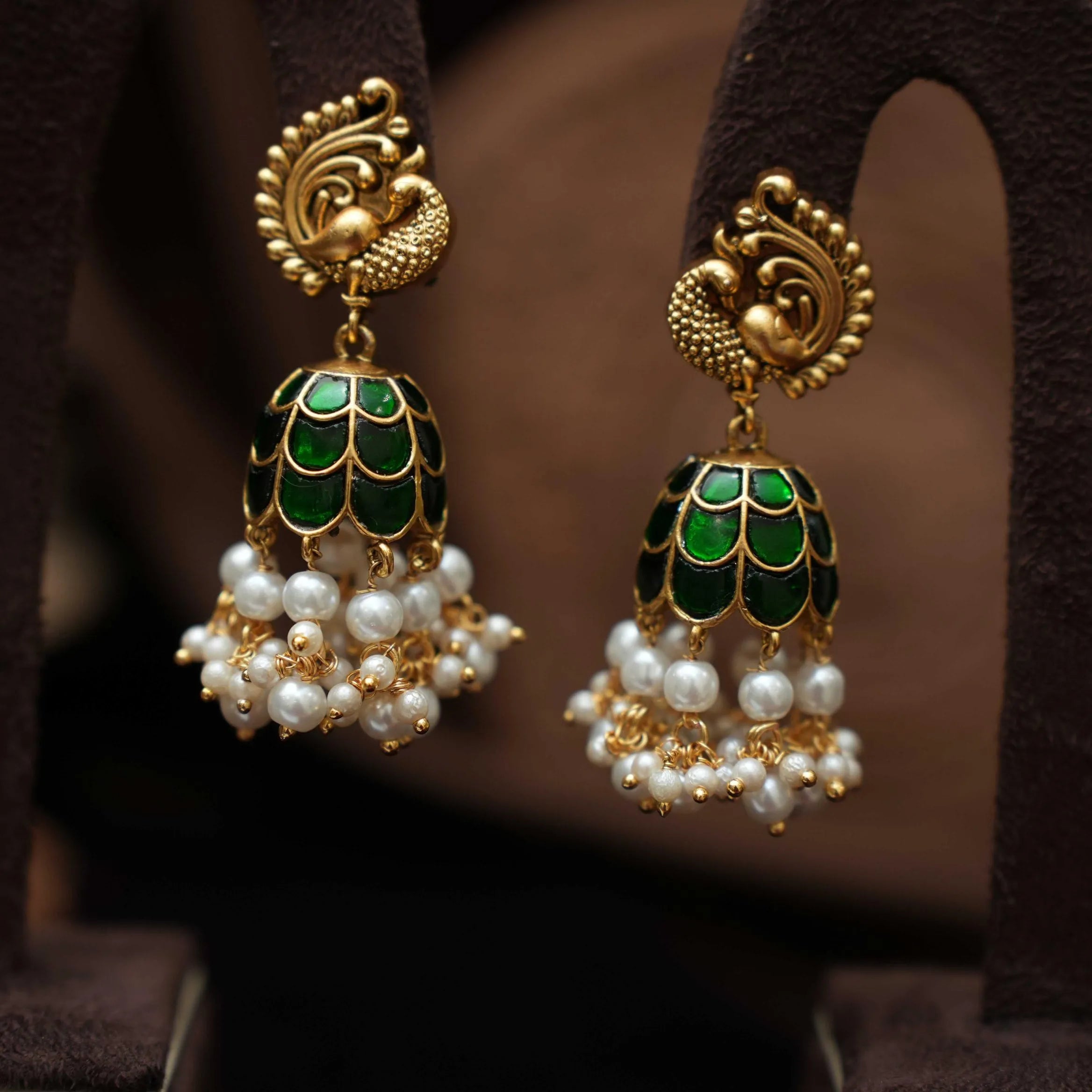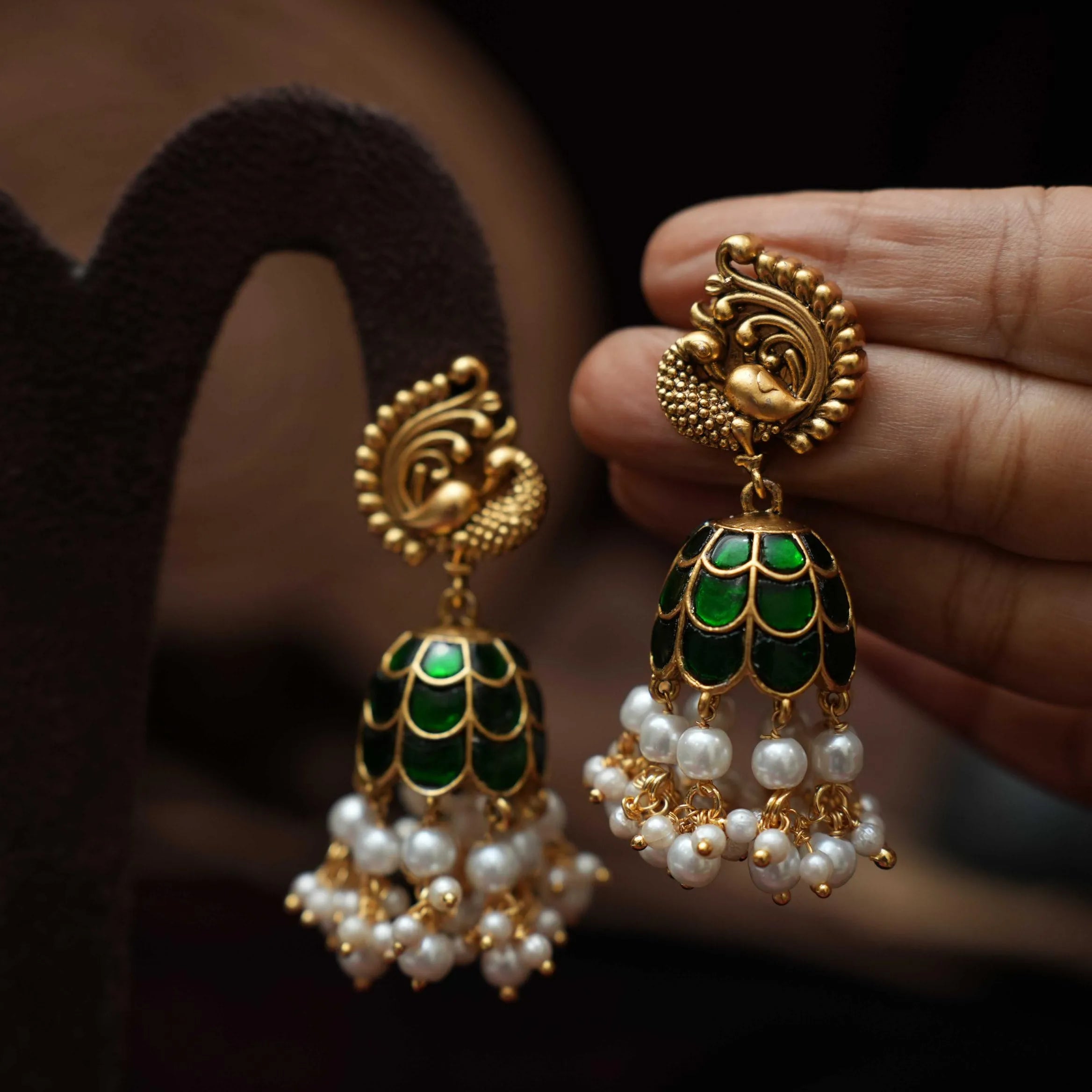 A beautiful jhumka earrings in peacock motif studded with kemp stones highlighted by pearls.