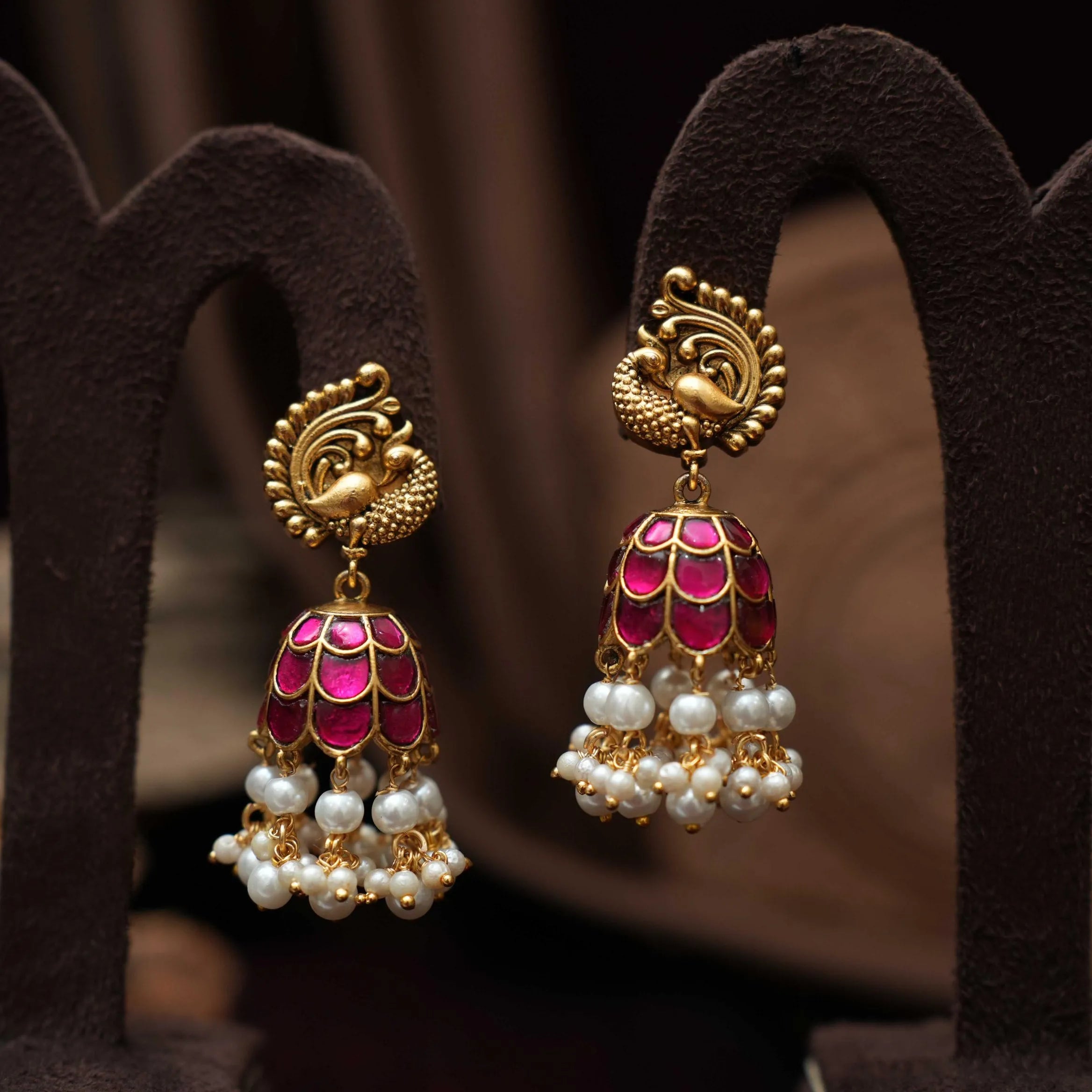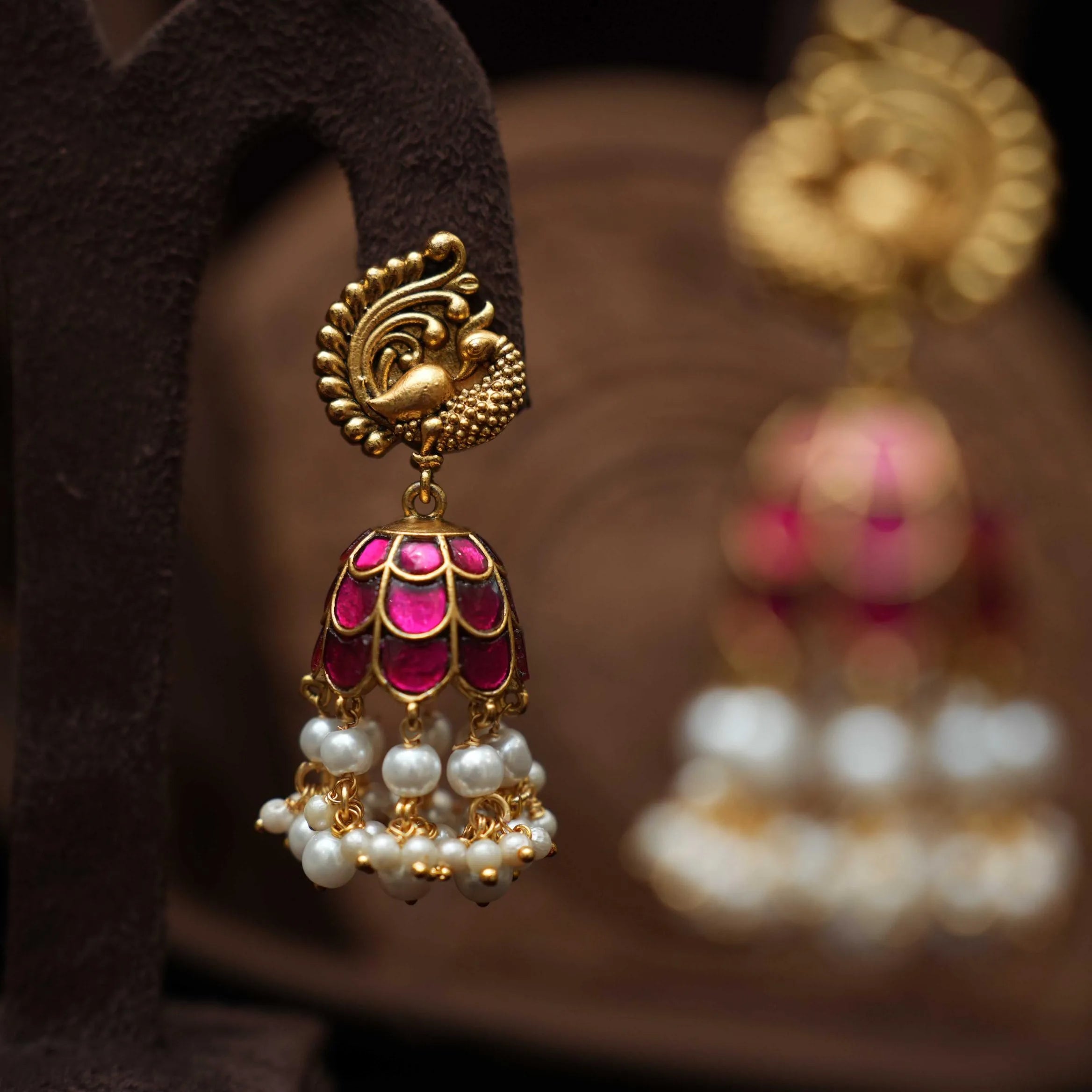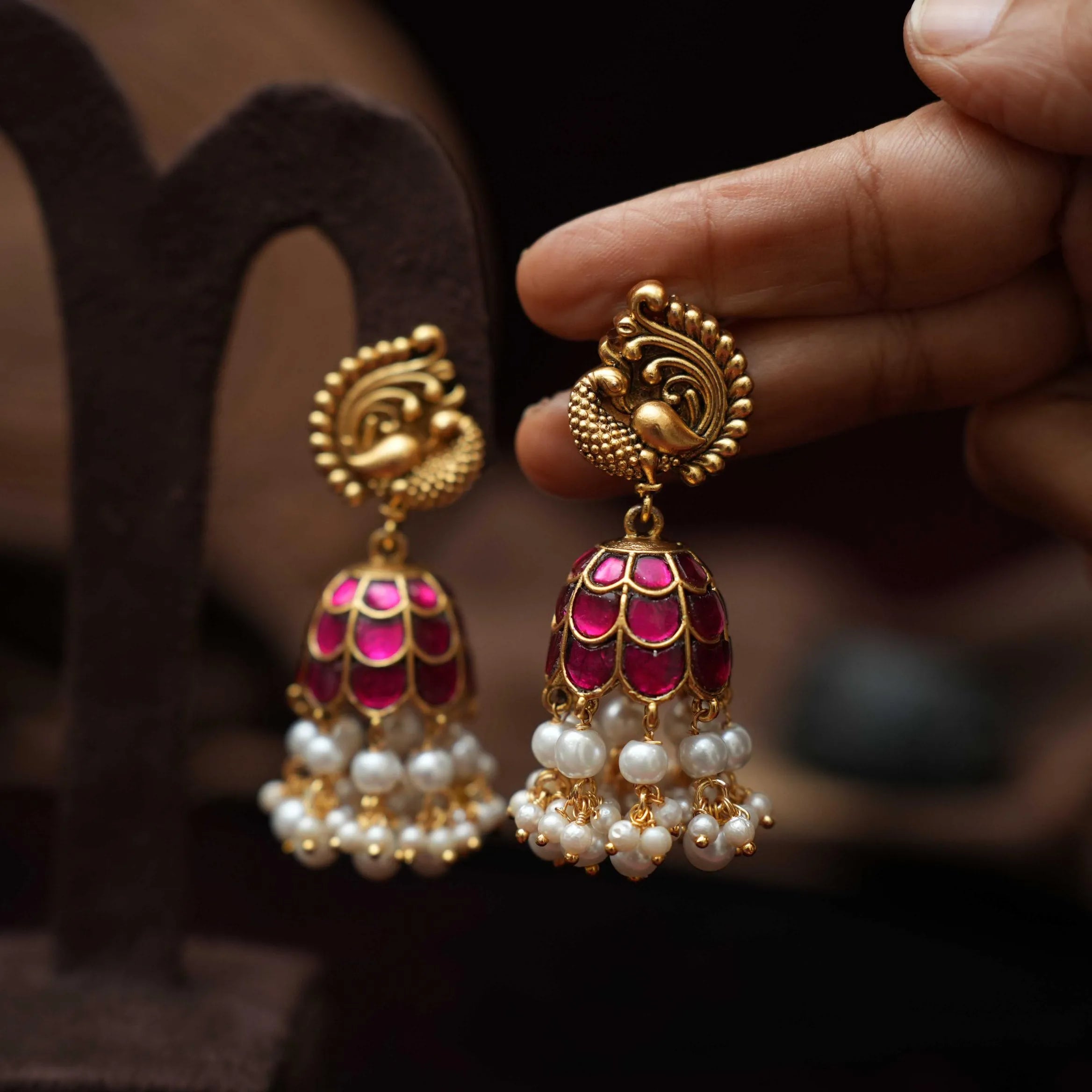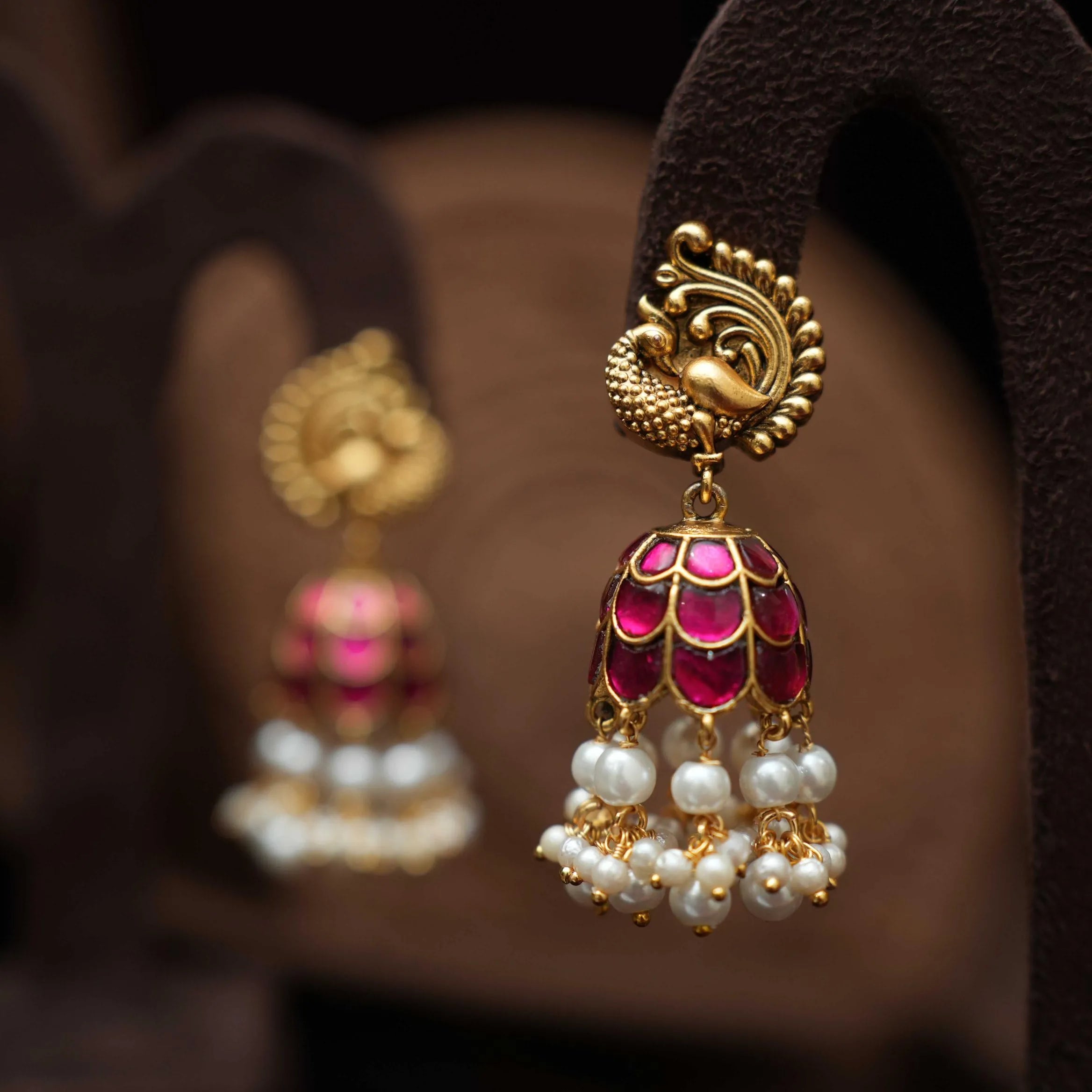 A beautiful jhumka earrings in peacock motif studded with kemp stones highlighted by pearls.