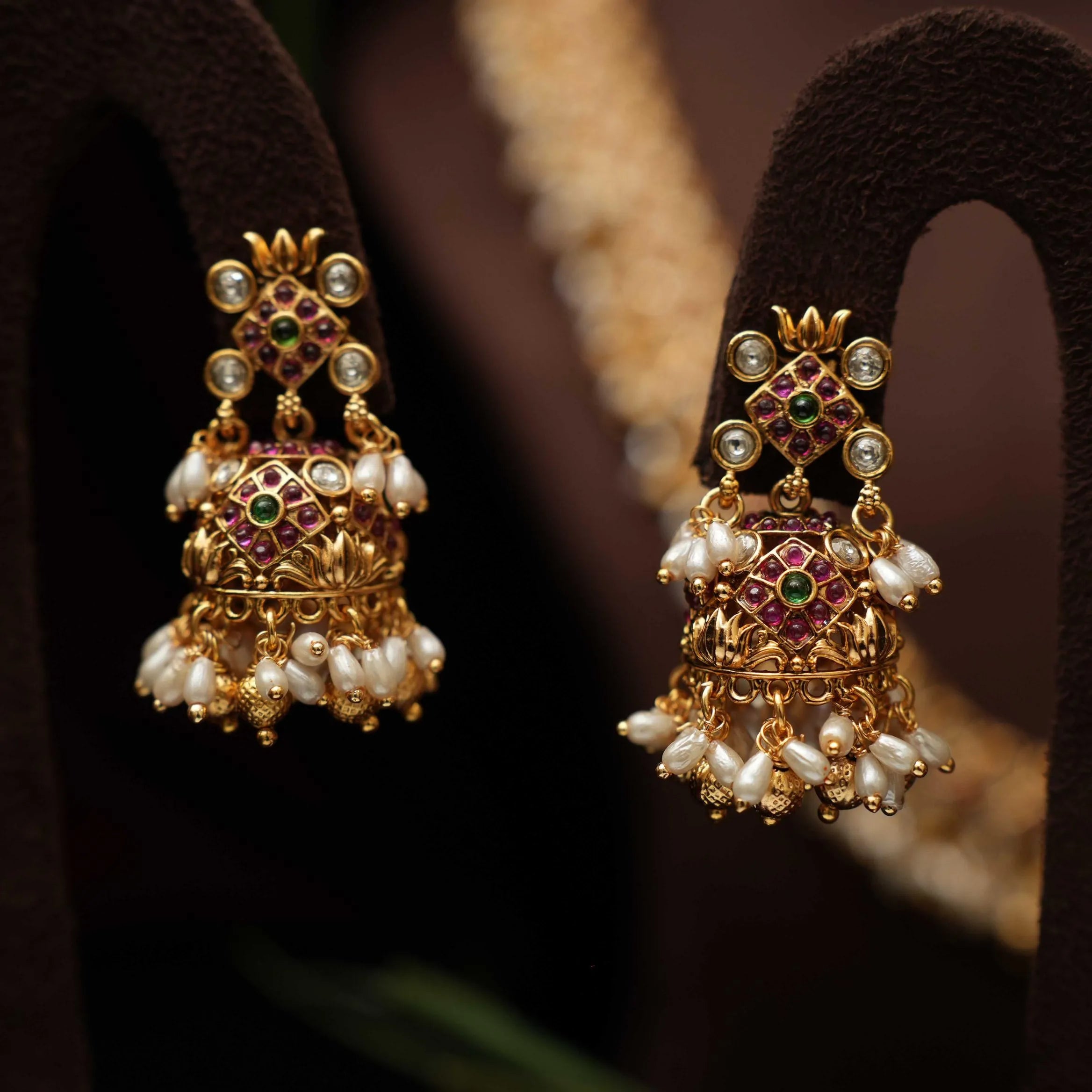 A stunning long antique necklace intricately handcrafted with traditional kemp stones in rich hues of red and green. The design features delicately carved floral motifs arranged in an ornate lattice pattern, beautifully enhanced with clusters of pearl droplets that add movement and elegance. This necklace exudes a timeless South Indian heritage charm, making it perfect for weddings, festive celebrations, and traditional ensembles. The set comes with matching earrings that mirror the intricate detailing and pearl embellishments, completing the look with refined grace and sophistication.