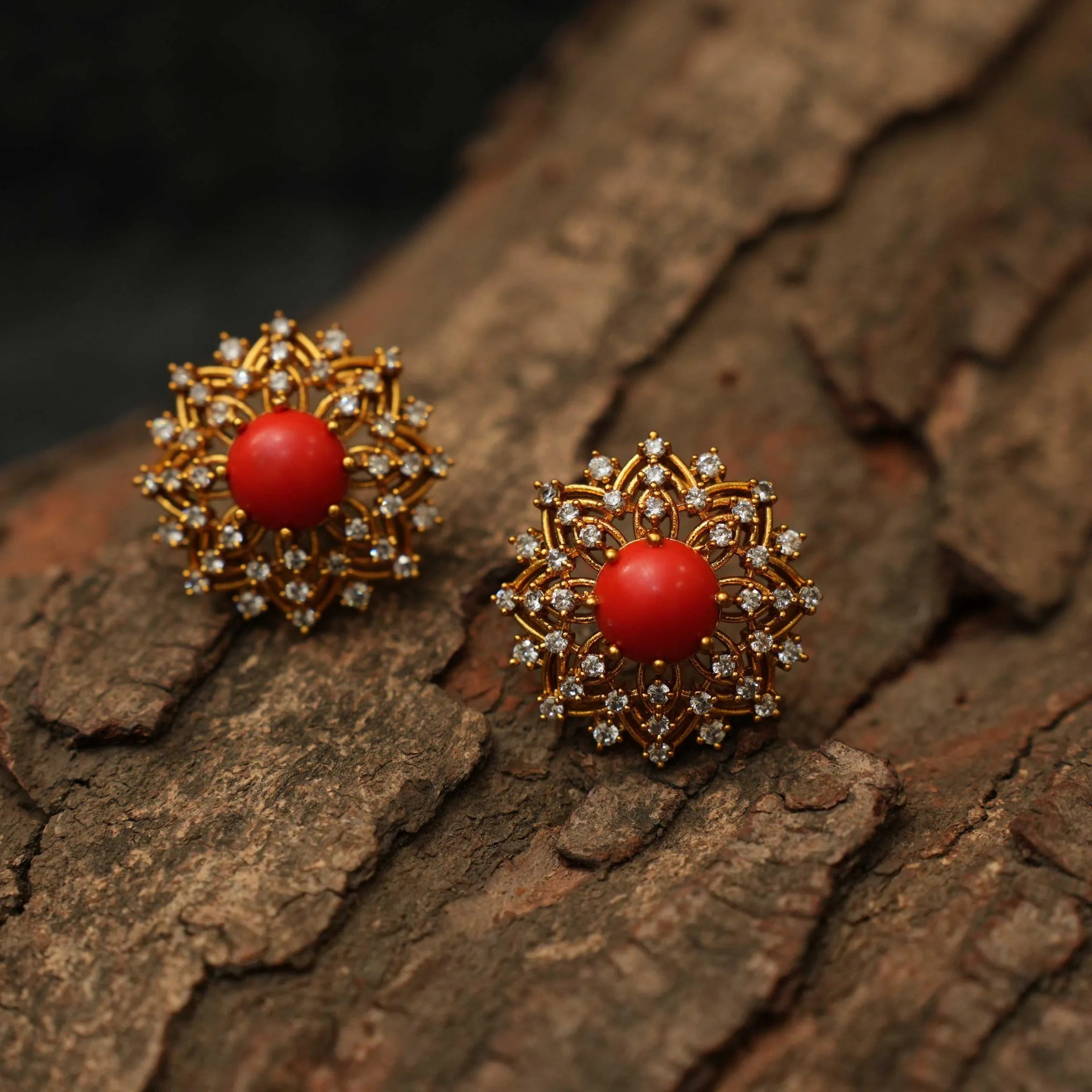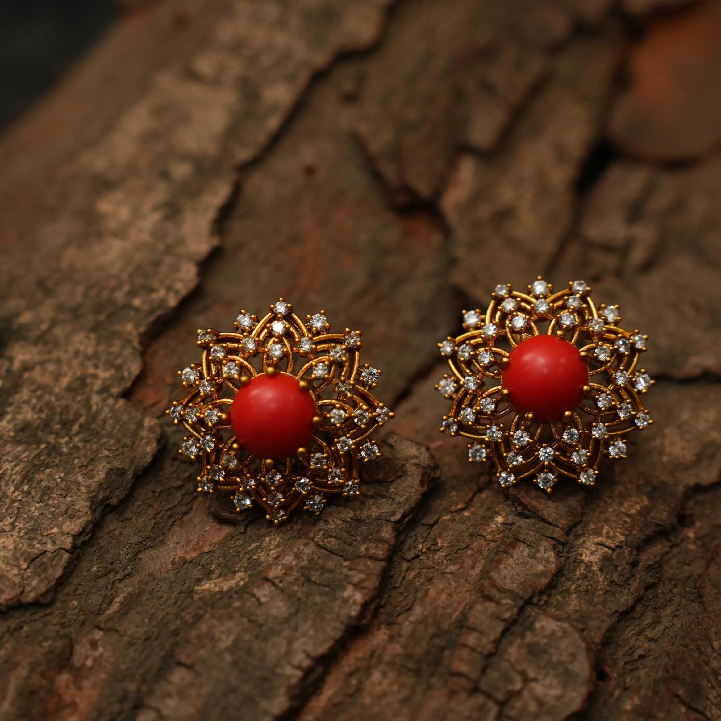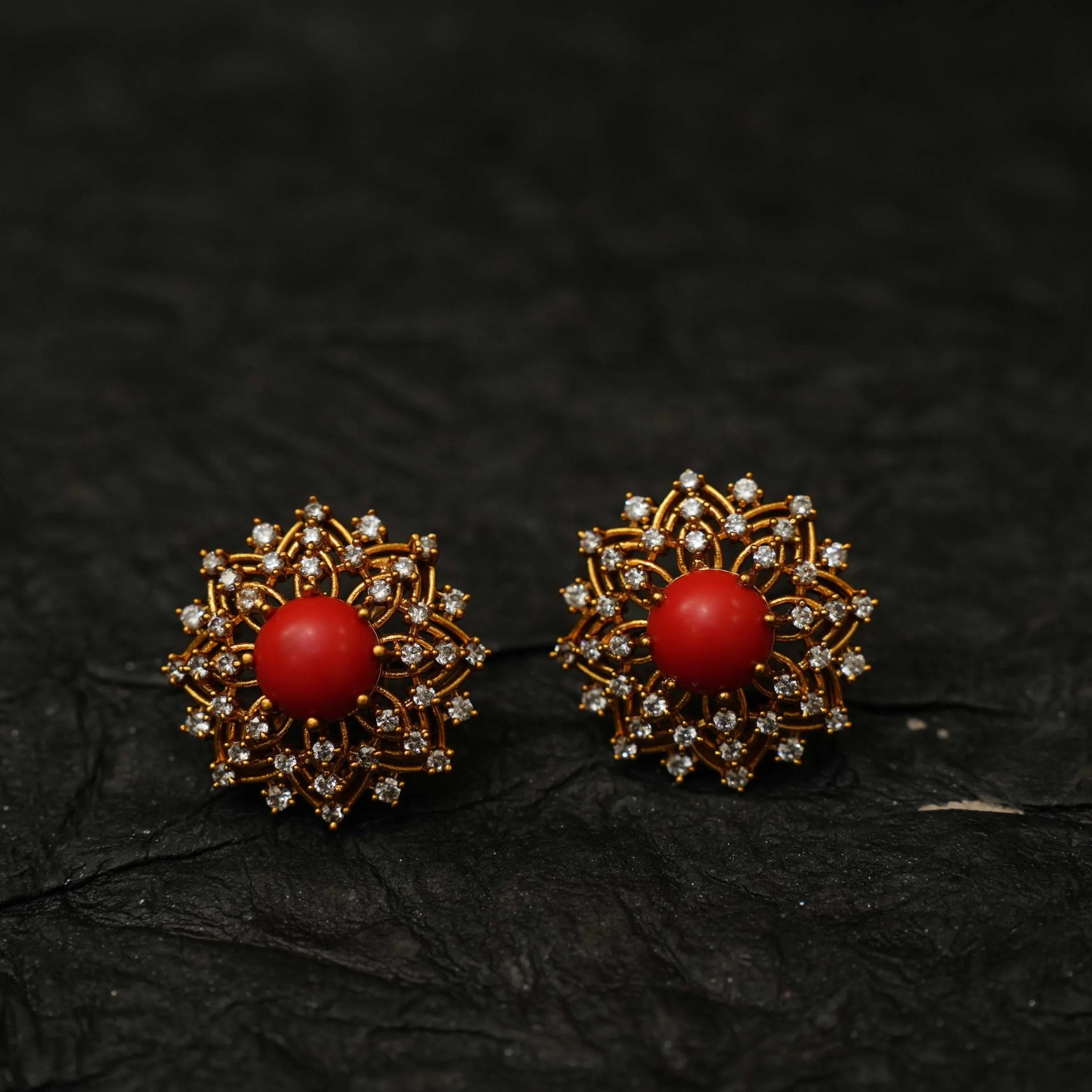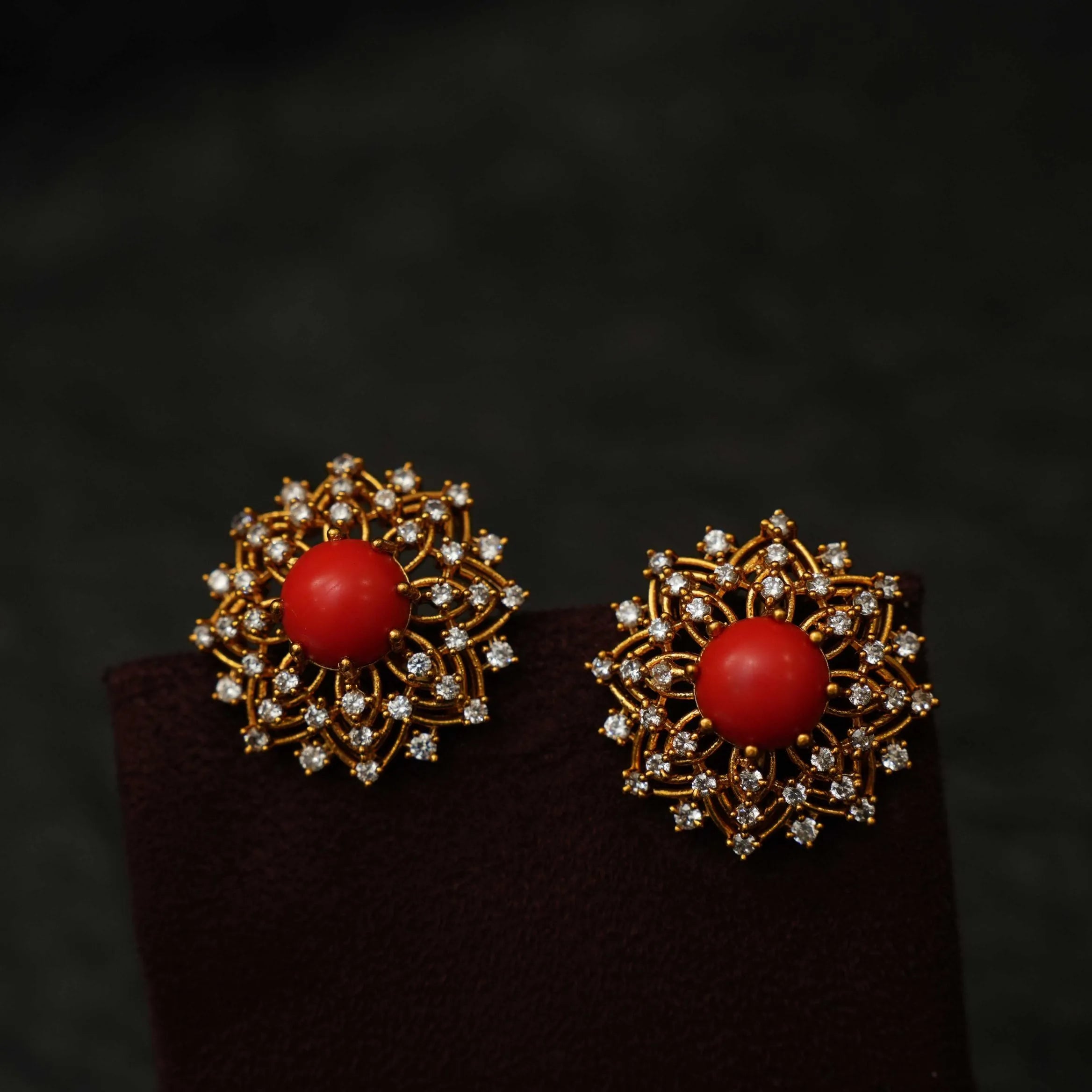 A beautiful ear stud in floral motif studded with zircon stones and corals.
