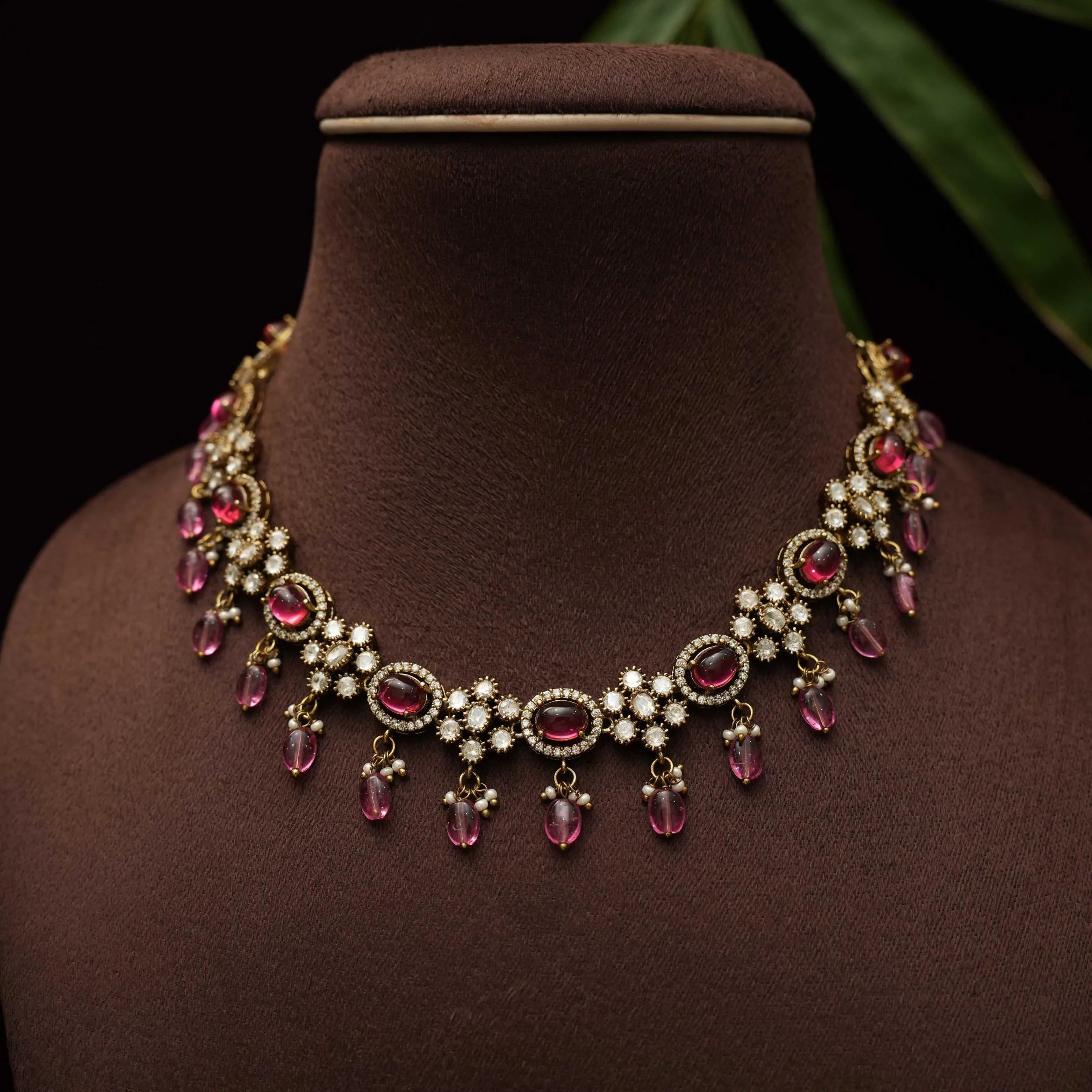 A regal necklace handcrafted with polki stones highlighted by red stones & beads.