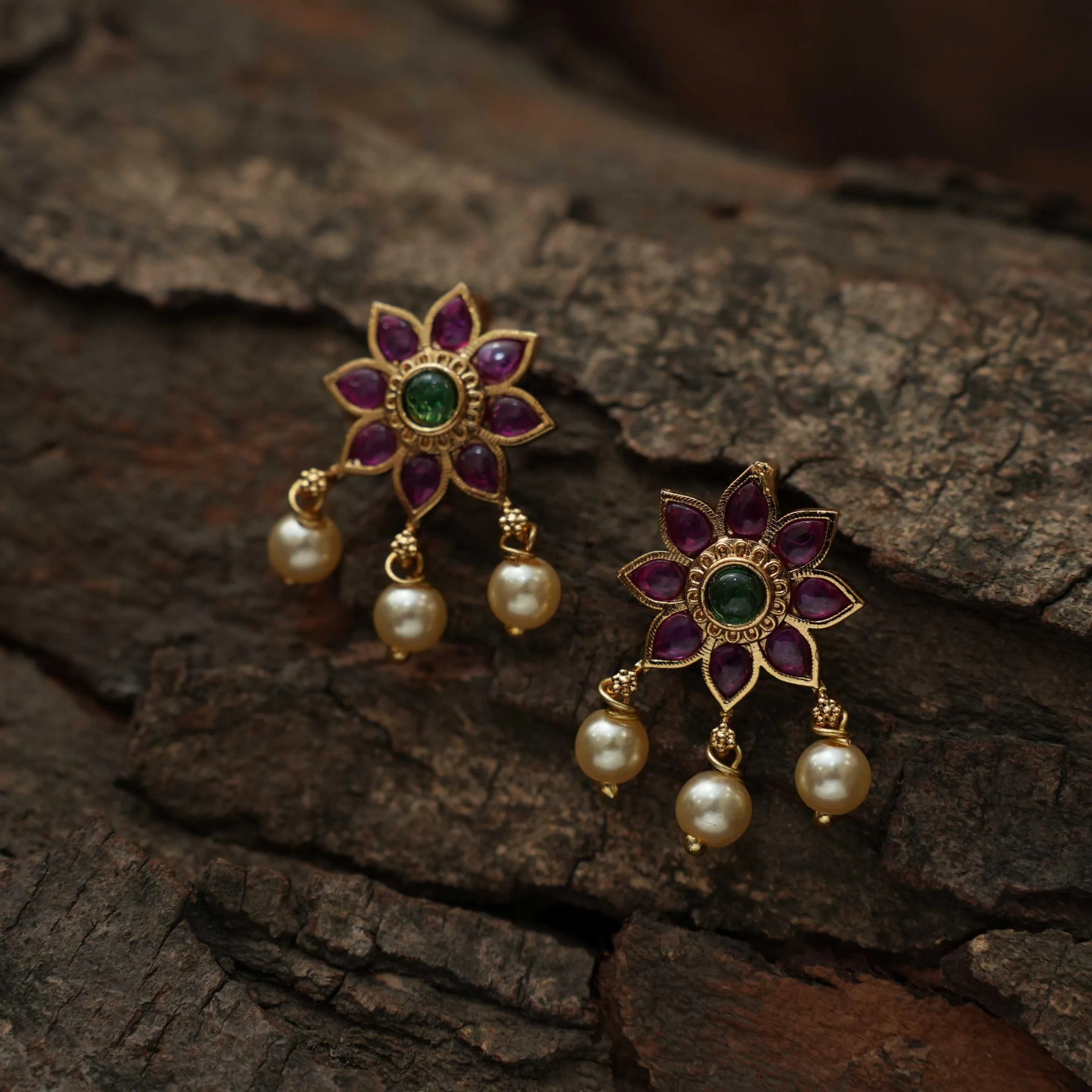 A regal ear stud in floral motif adorn with kemp stones & pearls.