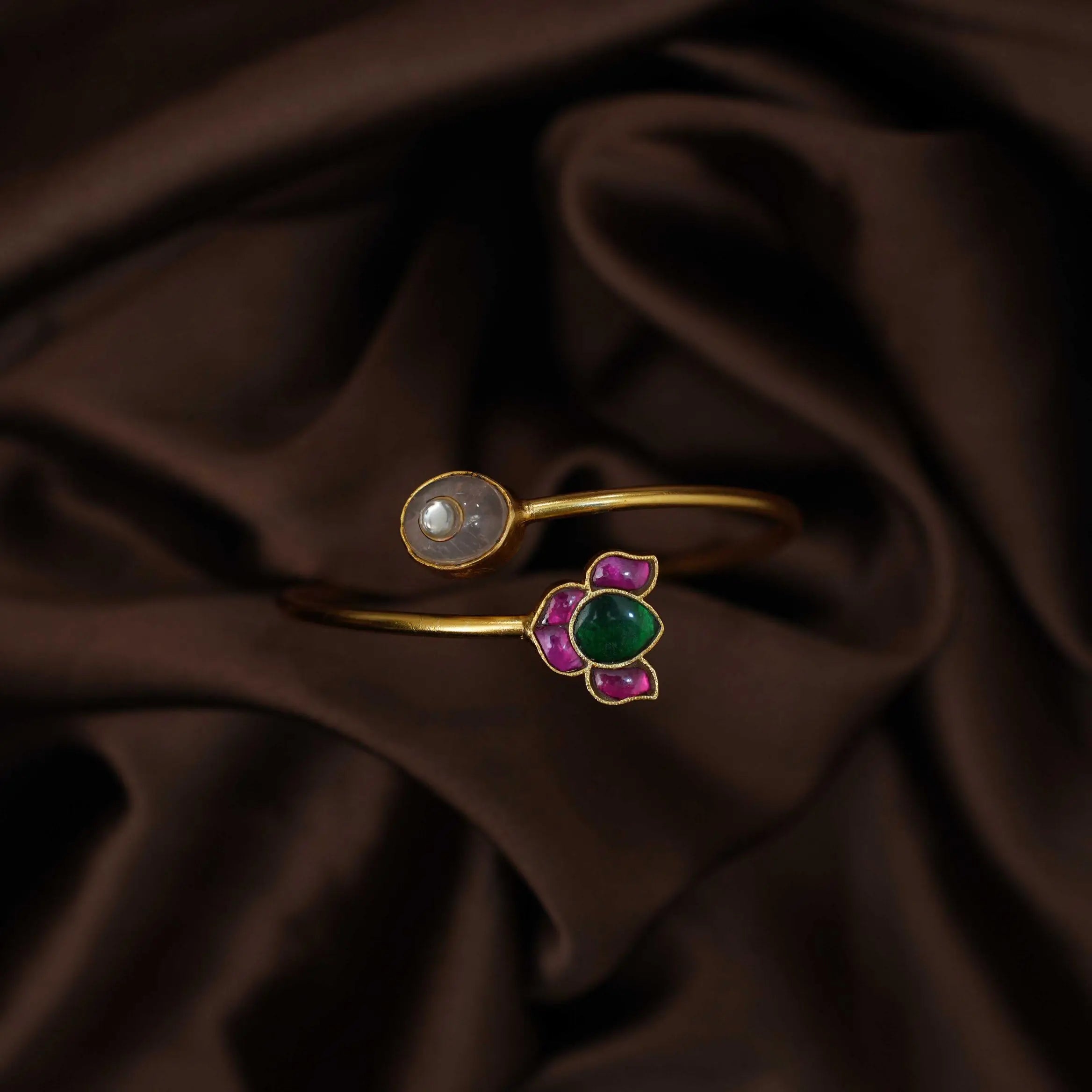 A beautiful silver kada bangle in floral motif studded with multicolor stones.