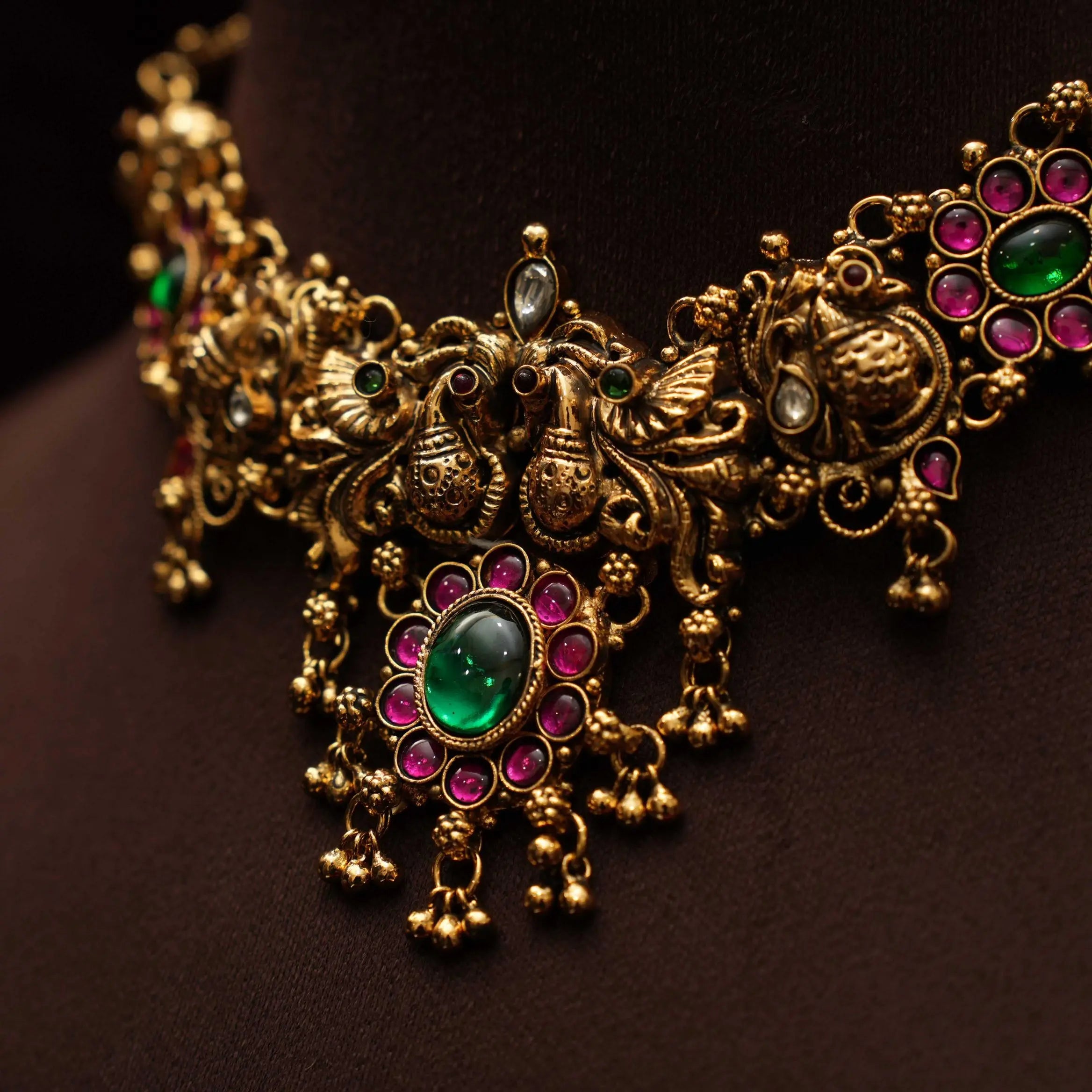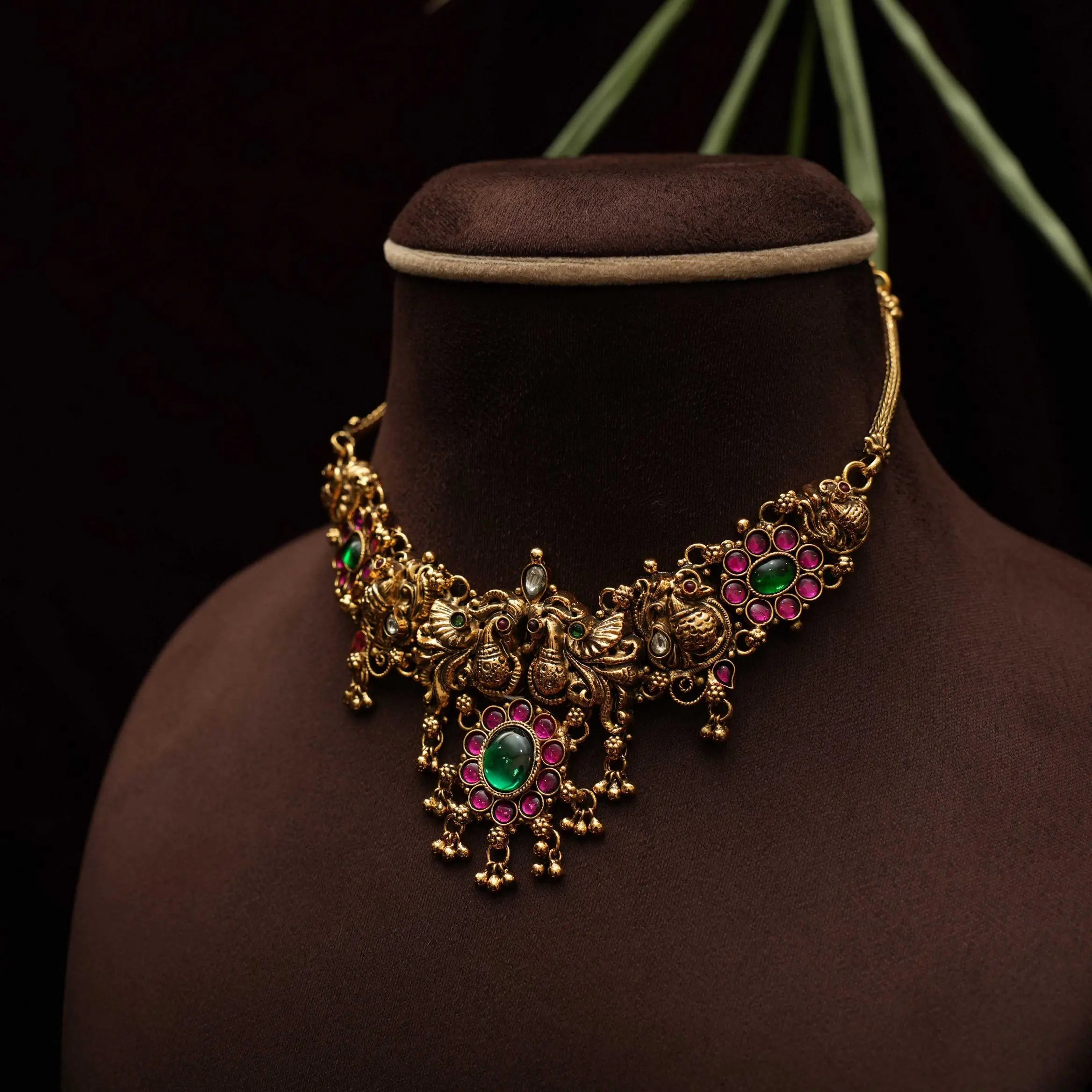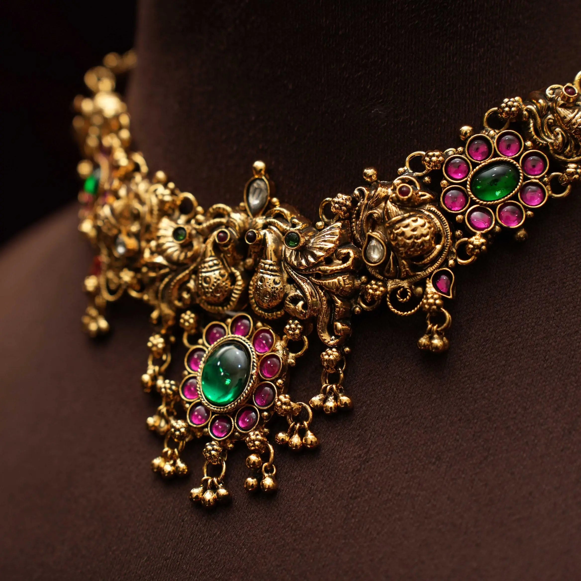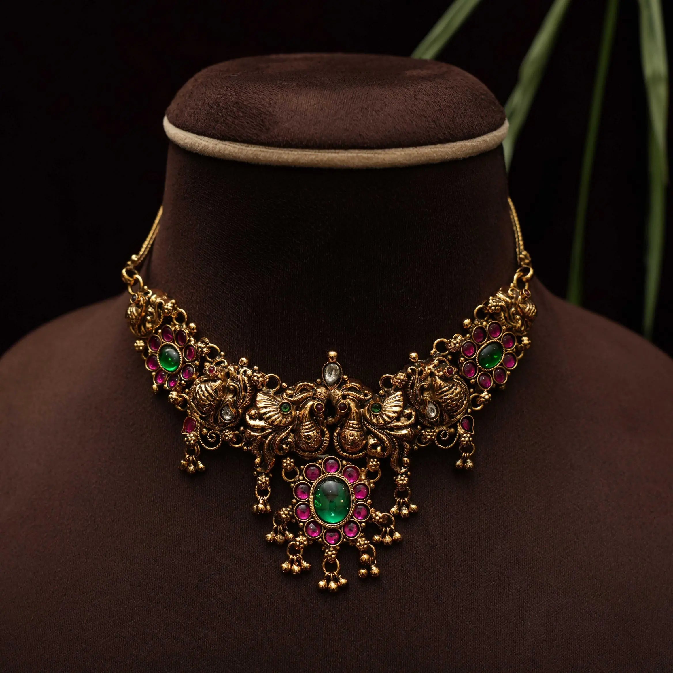 Make a statement with this exquisite antique necklace, meticulously handcrafted in traditional floral and peacock motifs. Studded with vibrant Kemp stones and adorned with delicate golden ball accents, the piece is beautifully finished in classic Nagas style, showcasing timeless craftsmanship. The set is complete with a matching pair of ear studs, making it a perfect choice for special occasions or traditional ensembles.