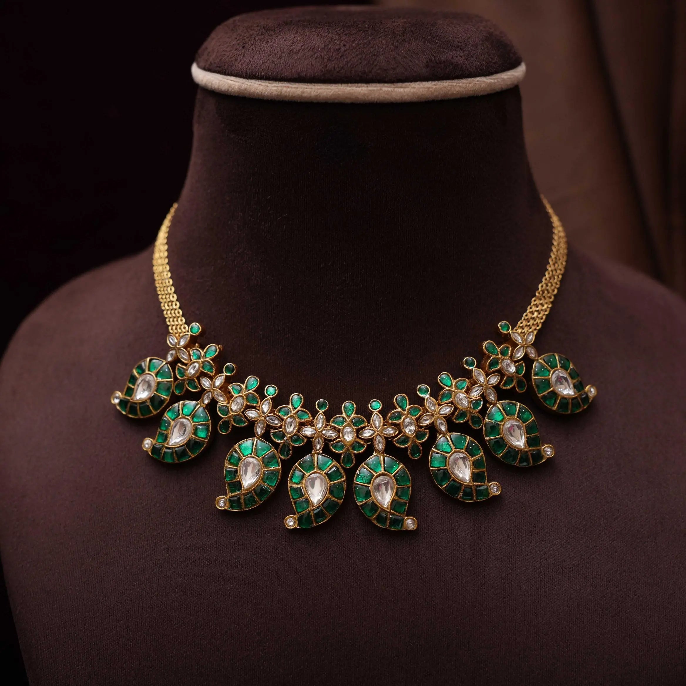 An elegant necklace in mango motifs studded with polki stones. This set comes with a pair of earrings.