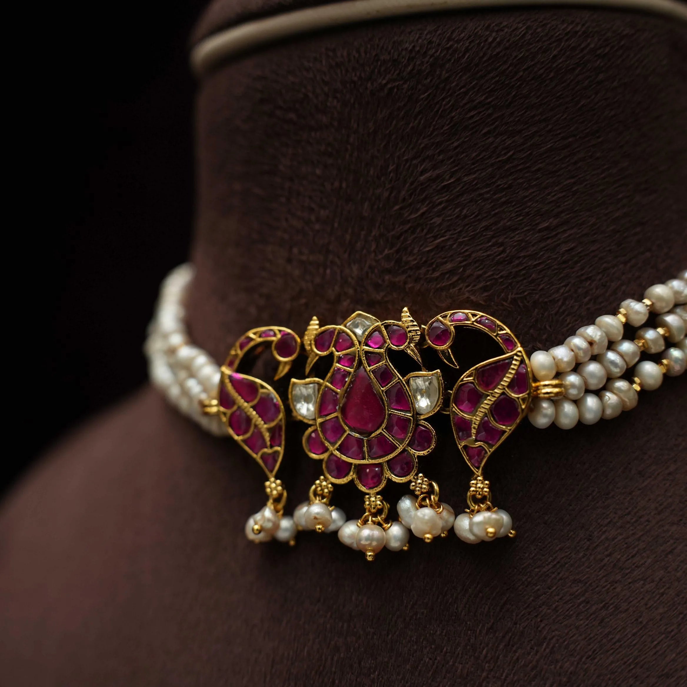 A beautiful choker handcrafted in cream beads paired to peacock motif polki pendant adorn with pearls. This set comes with a pair of earrings.
