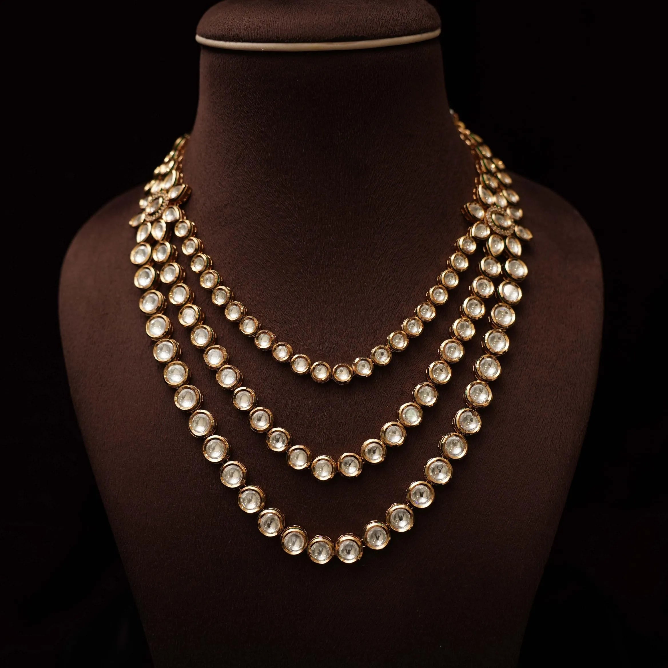 A statement layered necklace handcrafted with kundan stones. This set comes with a pair of earrings.