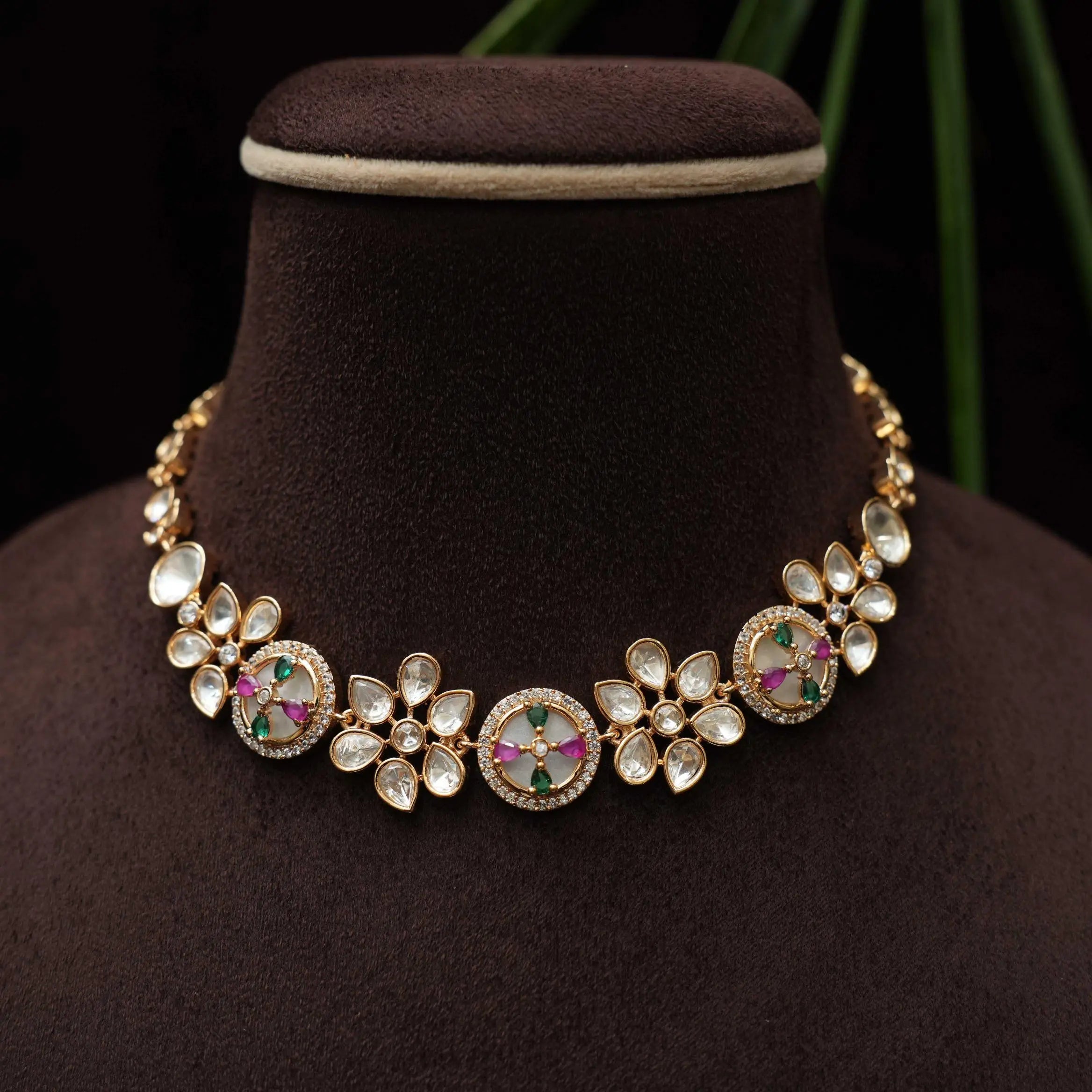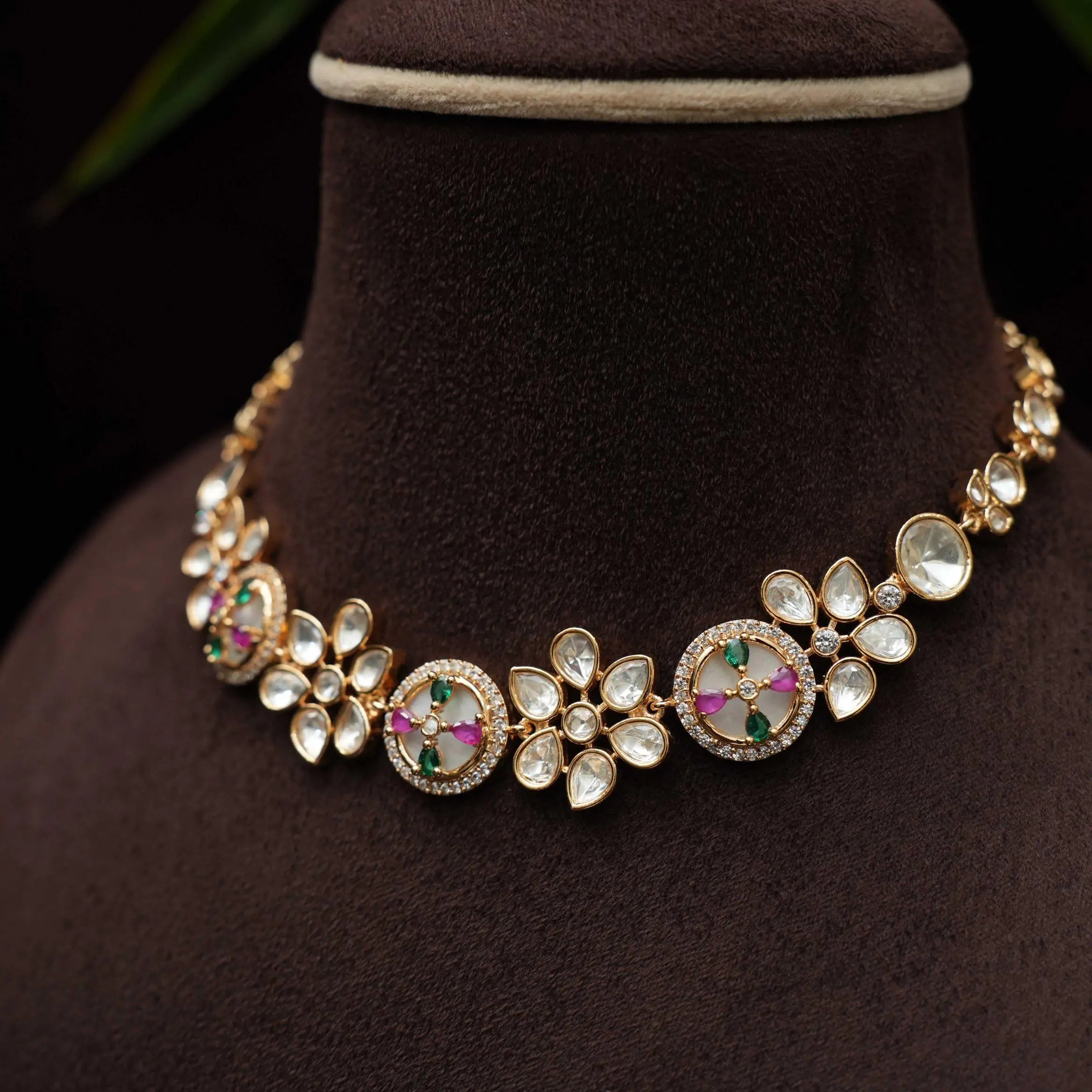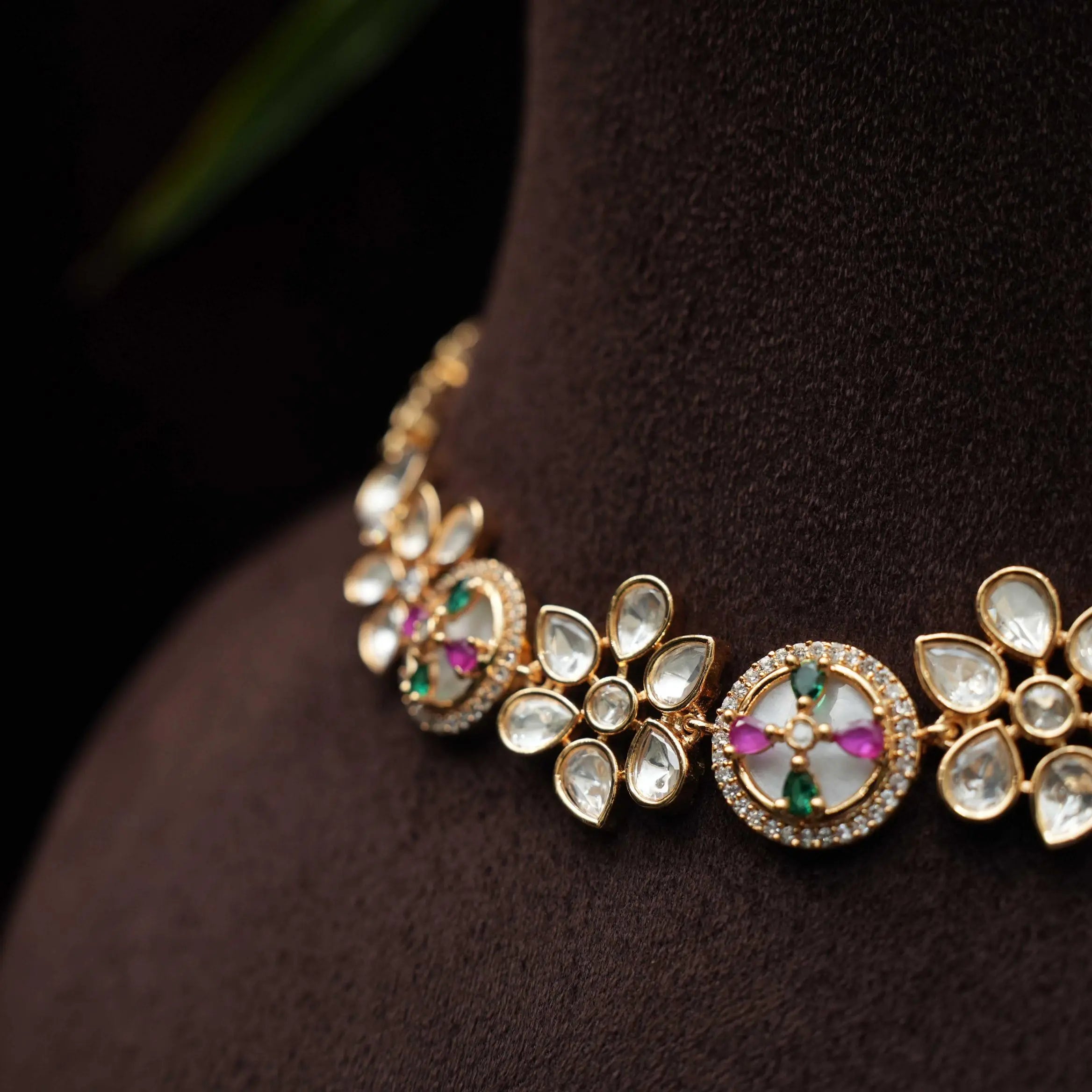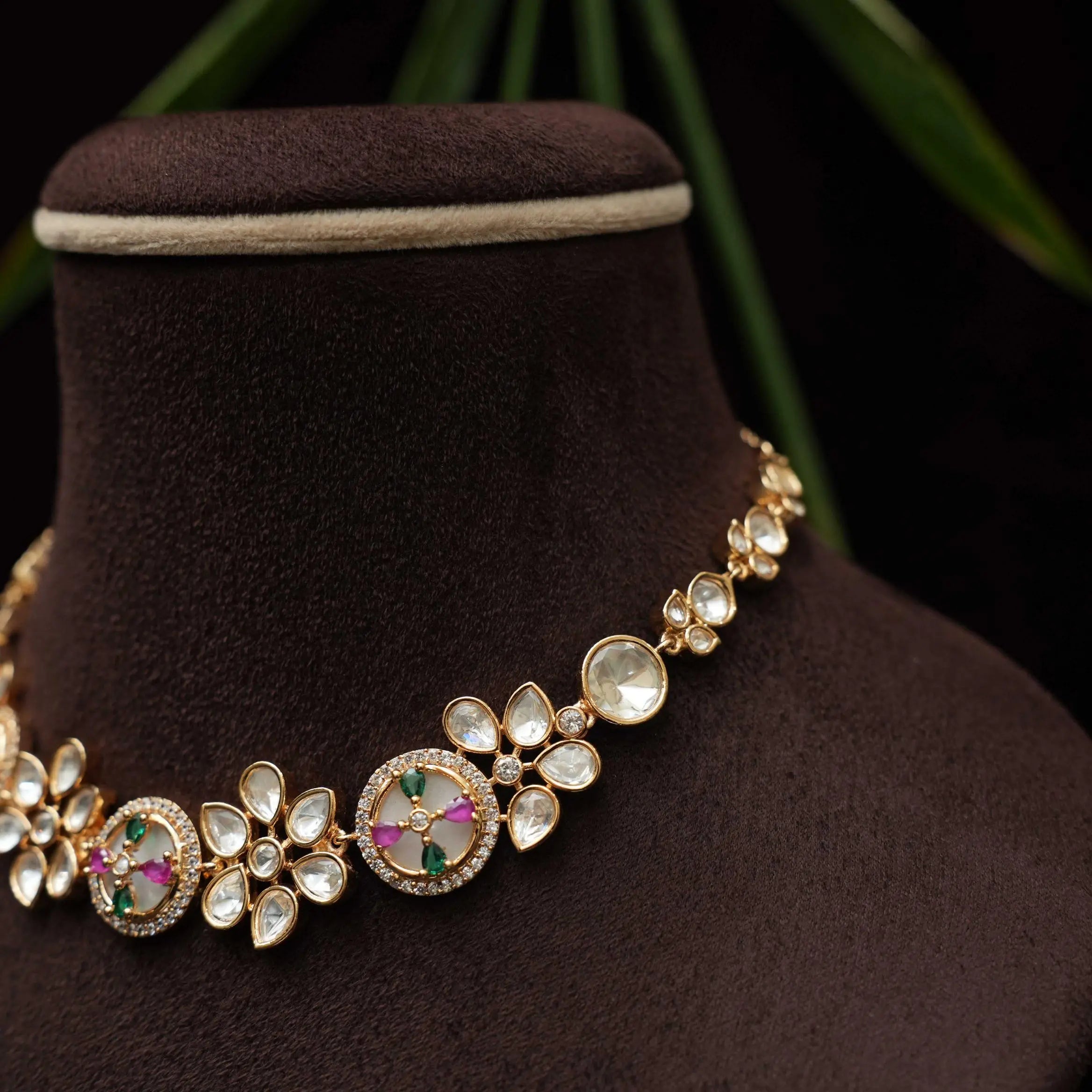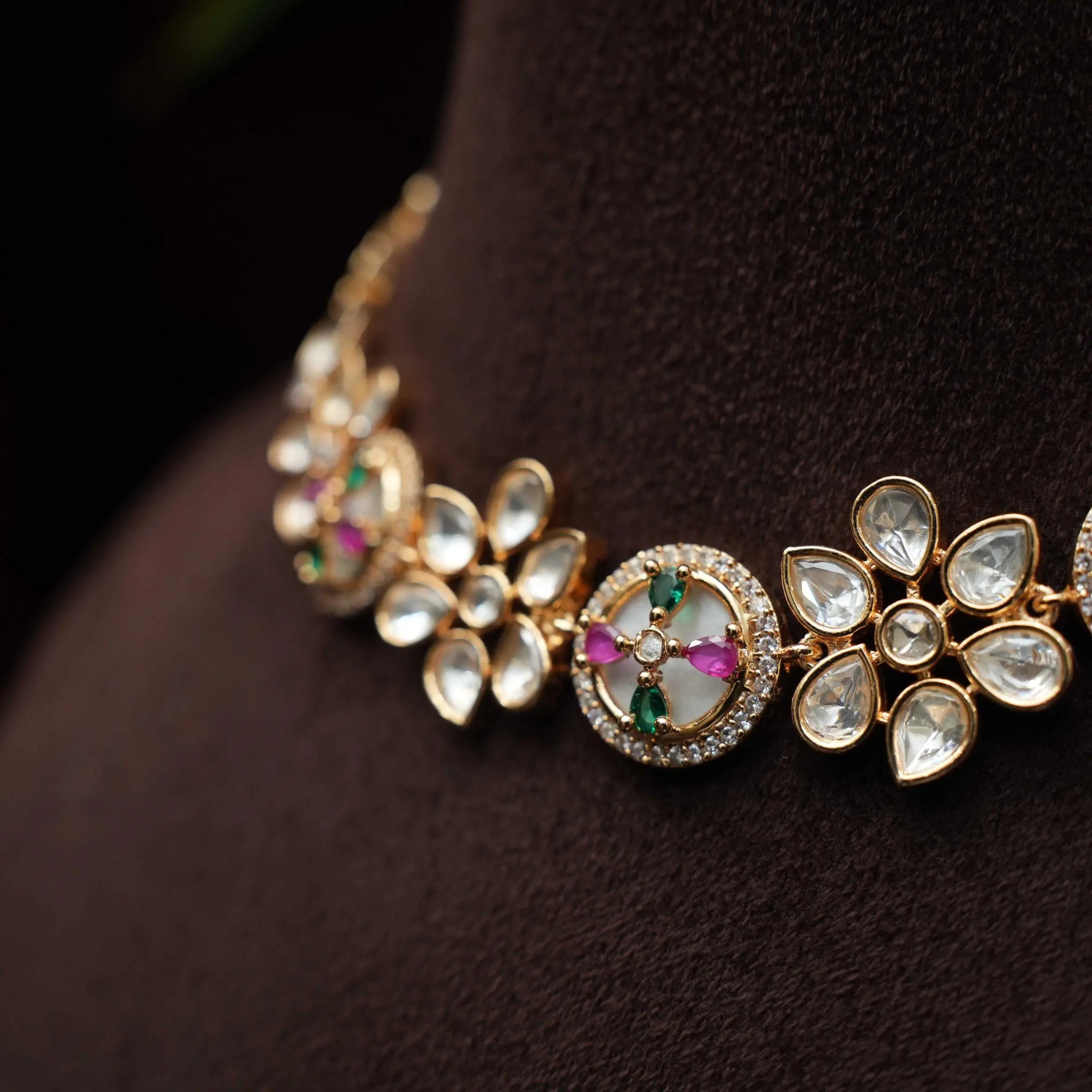 A graceful blend of tradition and charm, this handcrafted choker features luminous mother of pearl accented with uncut polki stones. Paired with matching earrings, this timeless set adds a touch of understated elegance to any ensemble.