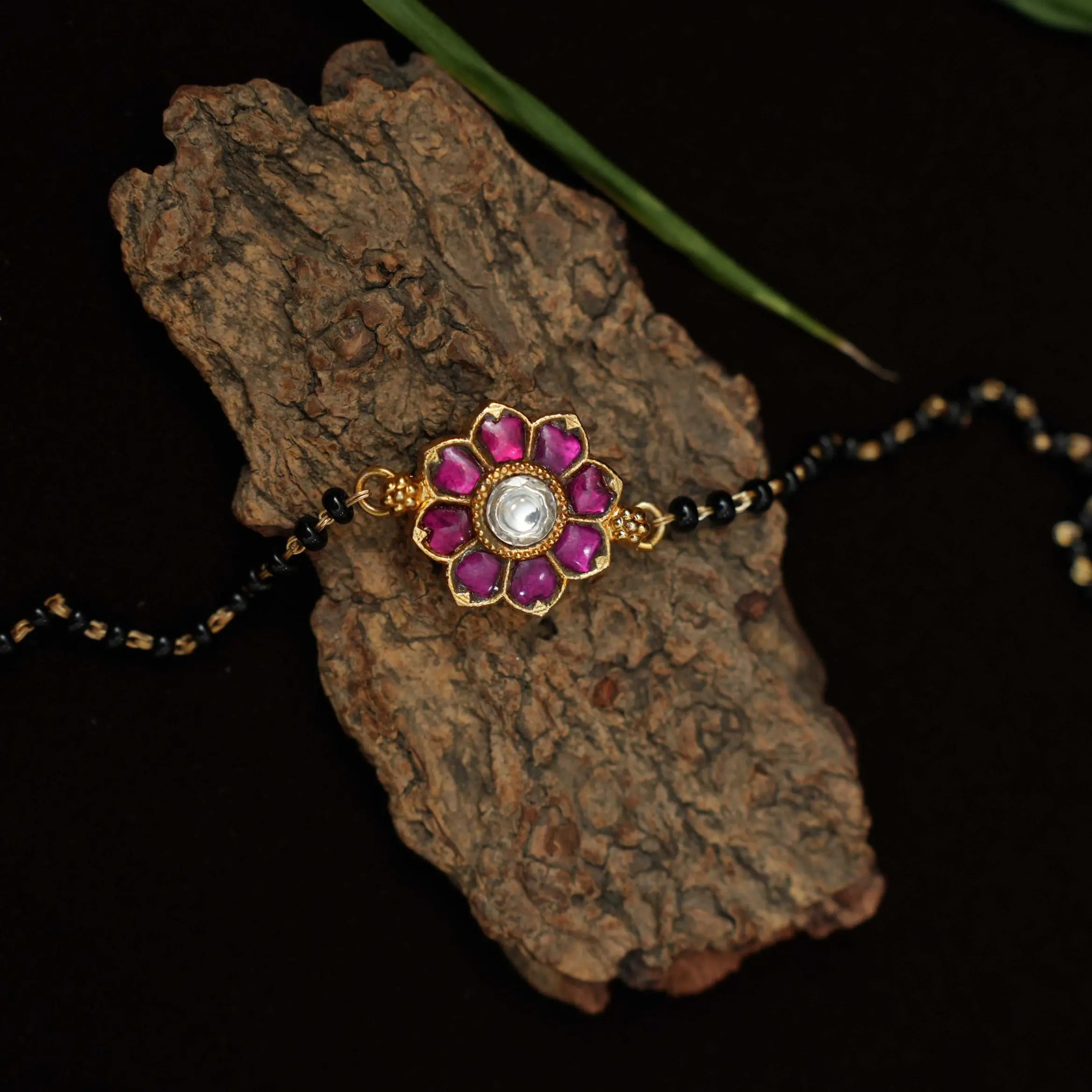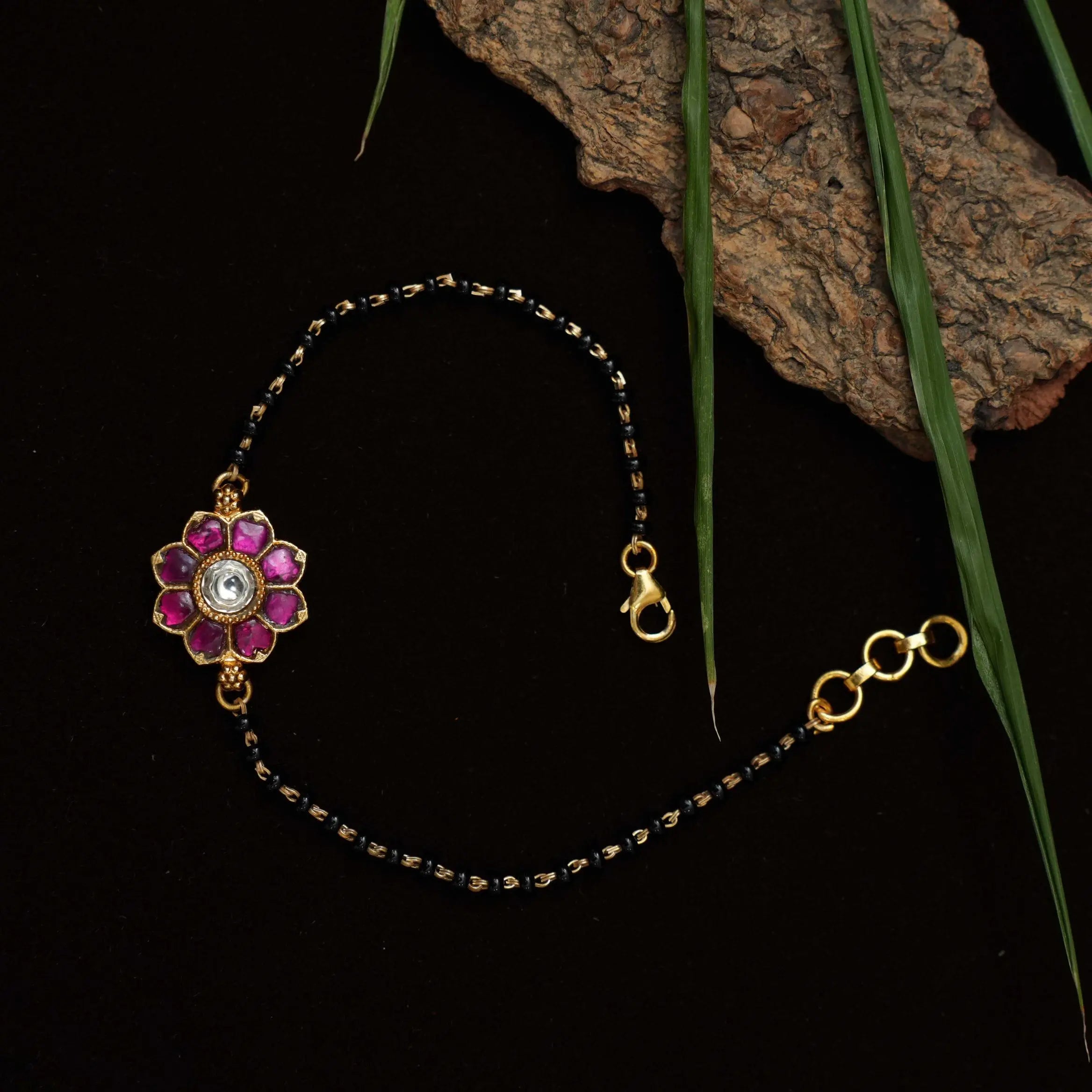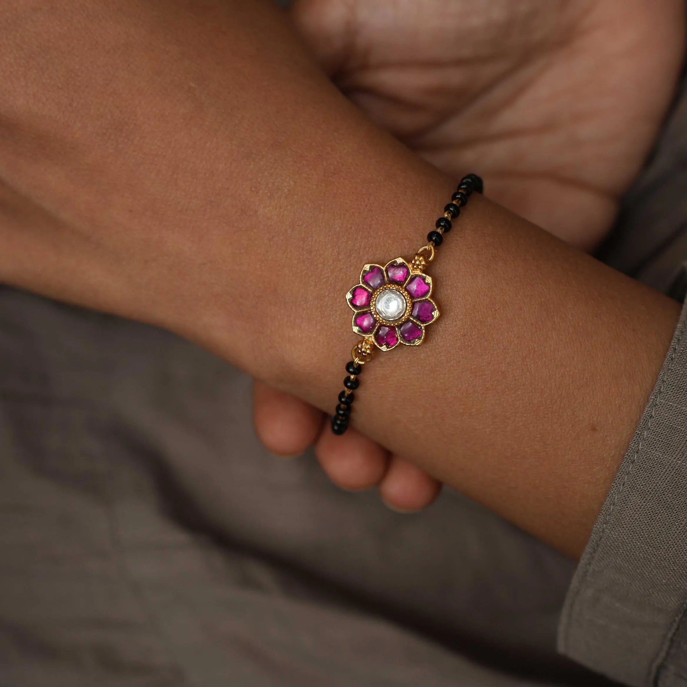 A classic silver bracelet handcrafted in floral motif studded with vibrant red stones paired to black beads.