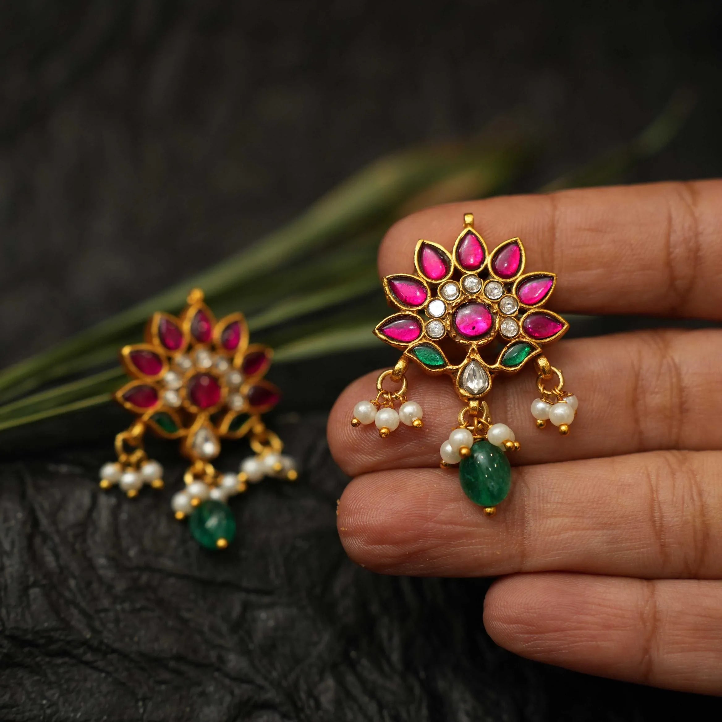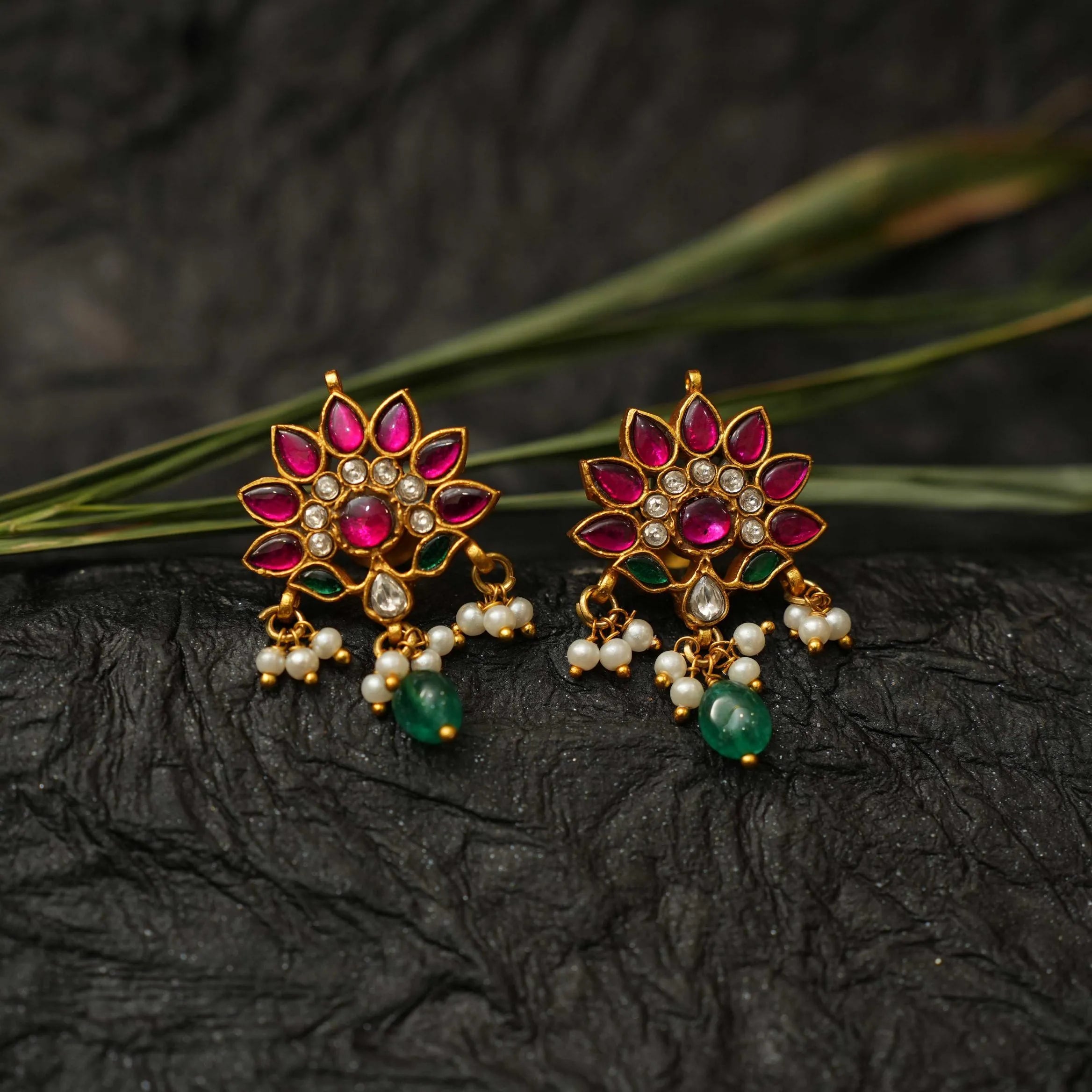 A beautiful earrings in floral motif handcrafted with polki stones adorn with beads and pearls.