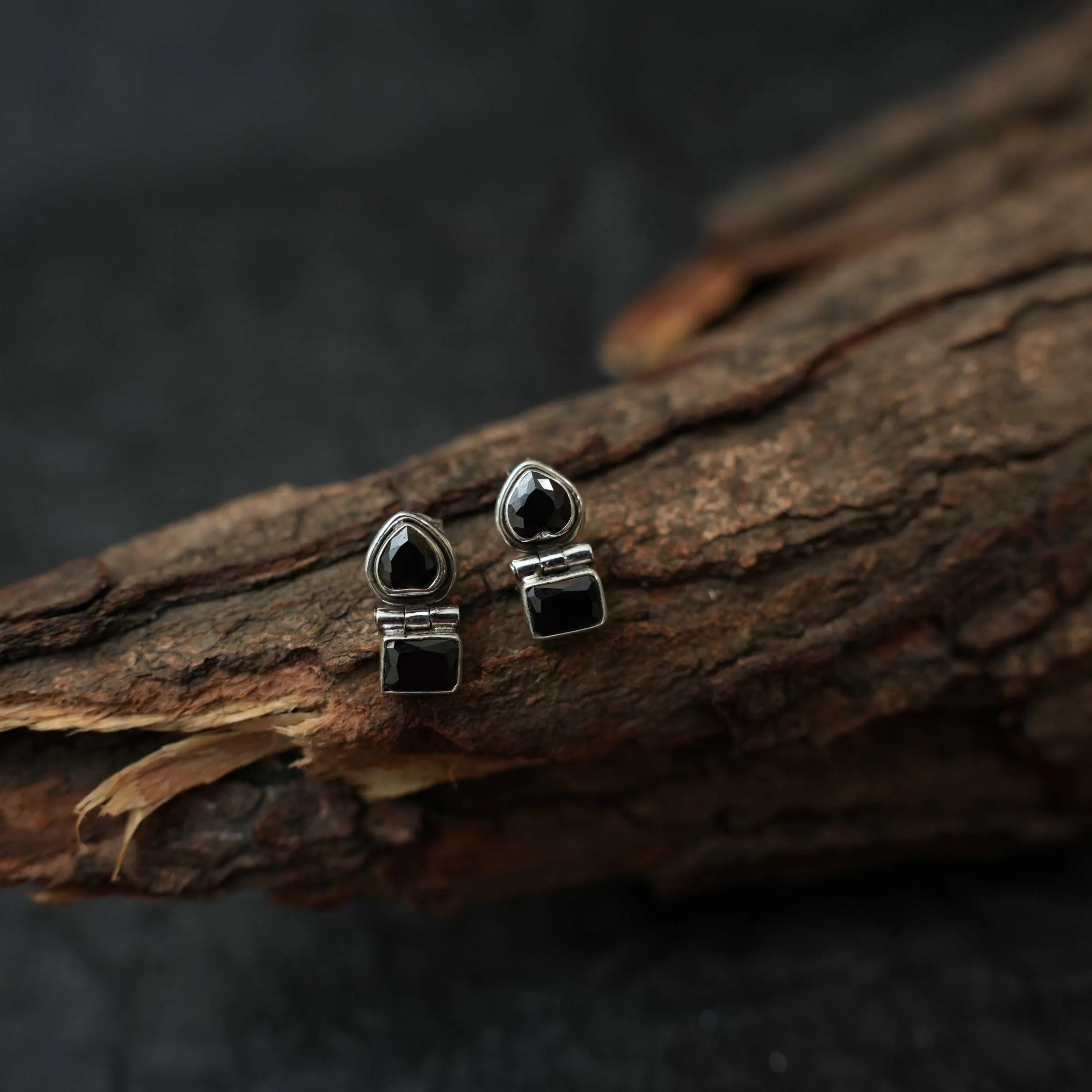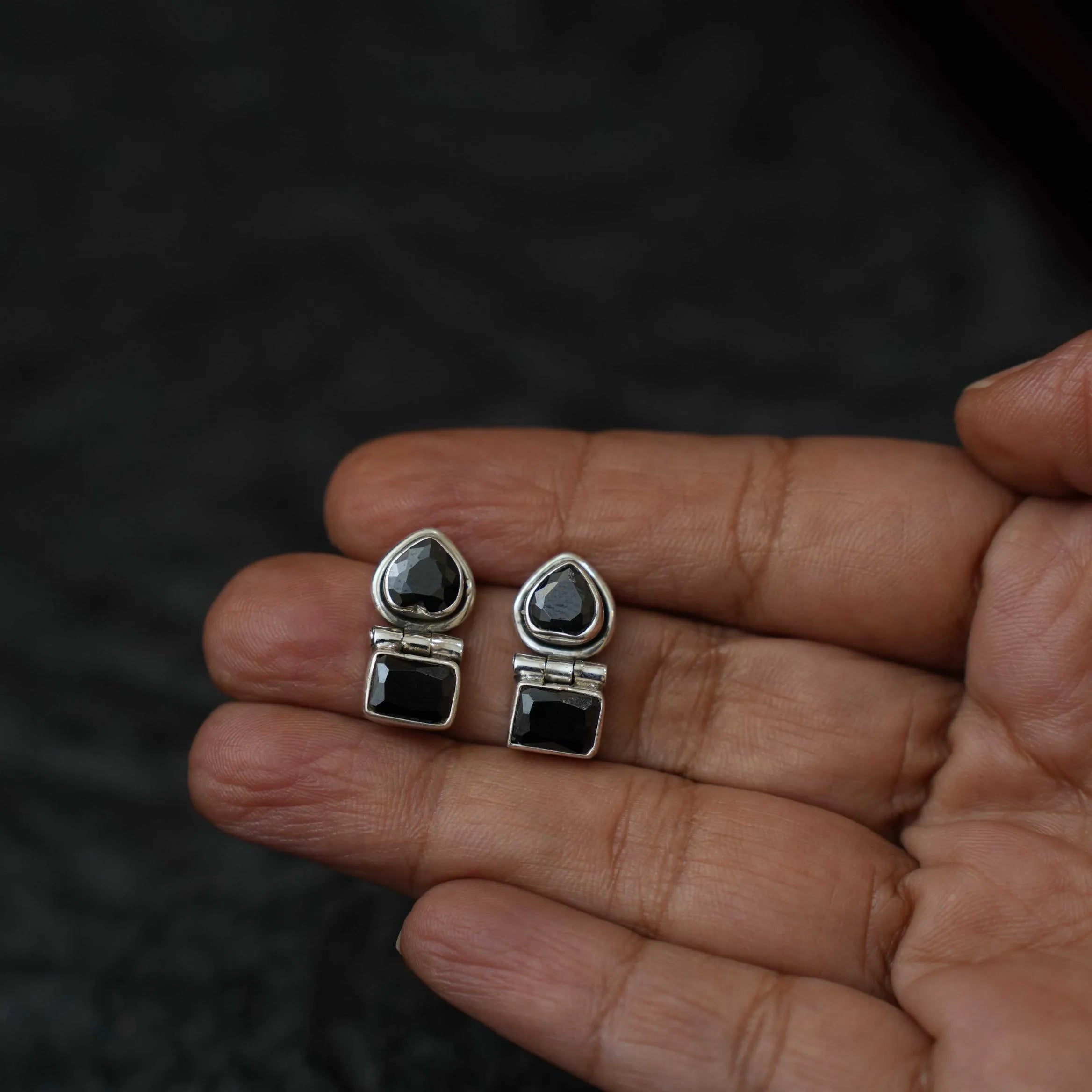 A simple & casual silver oxidised ear stud adorn with black stones.