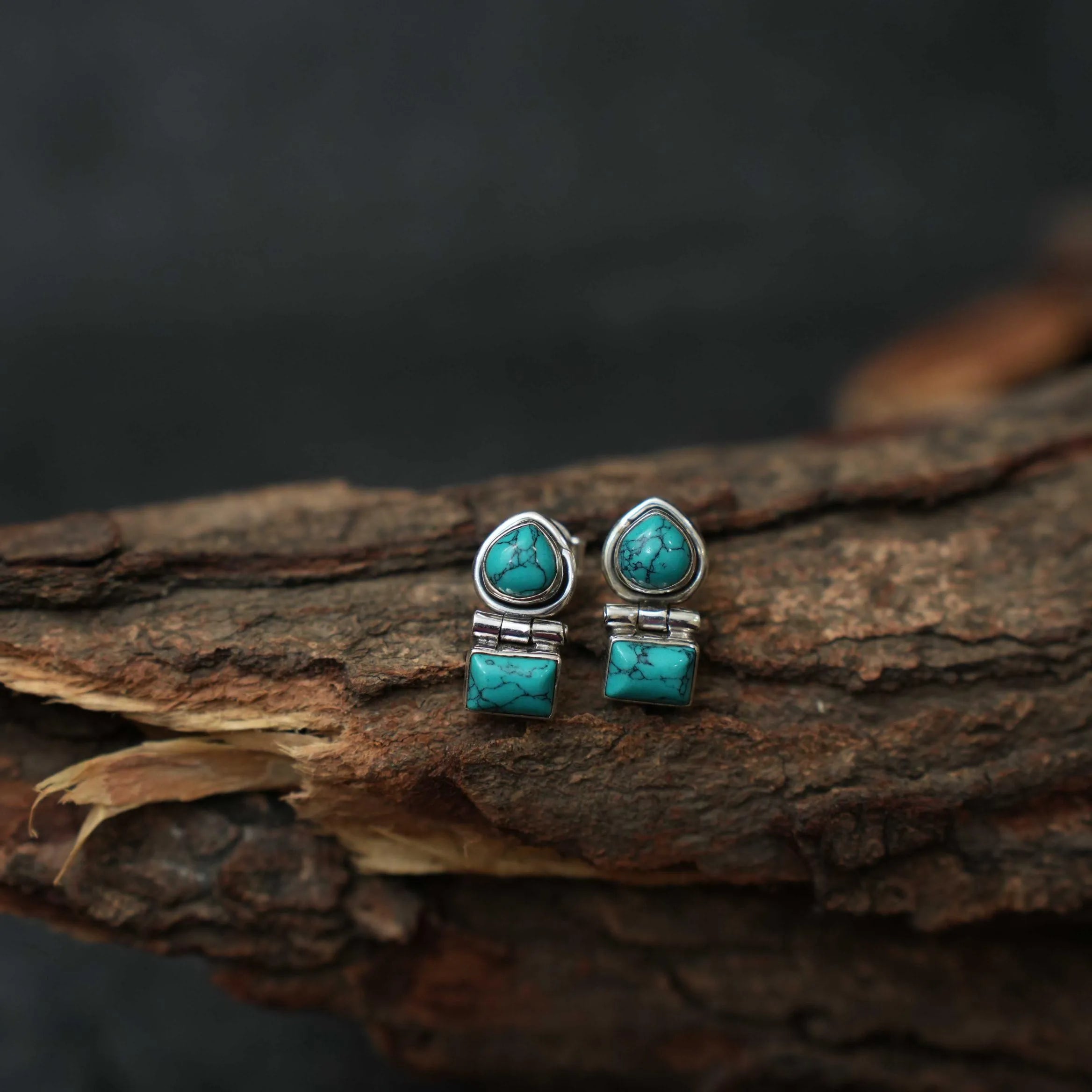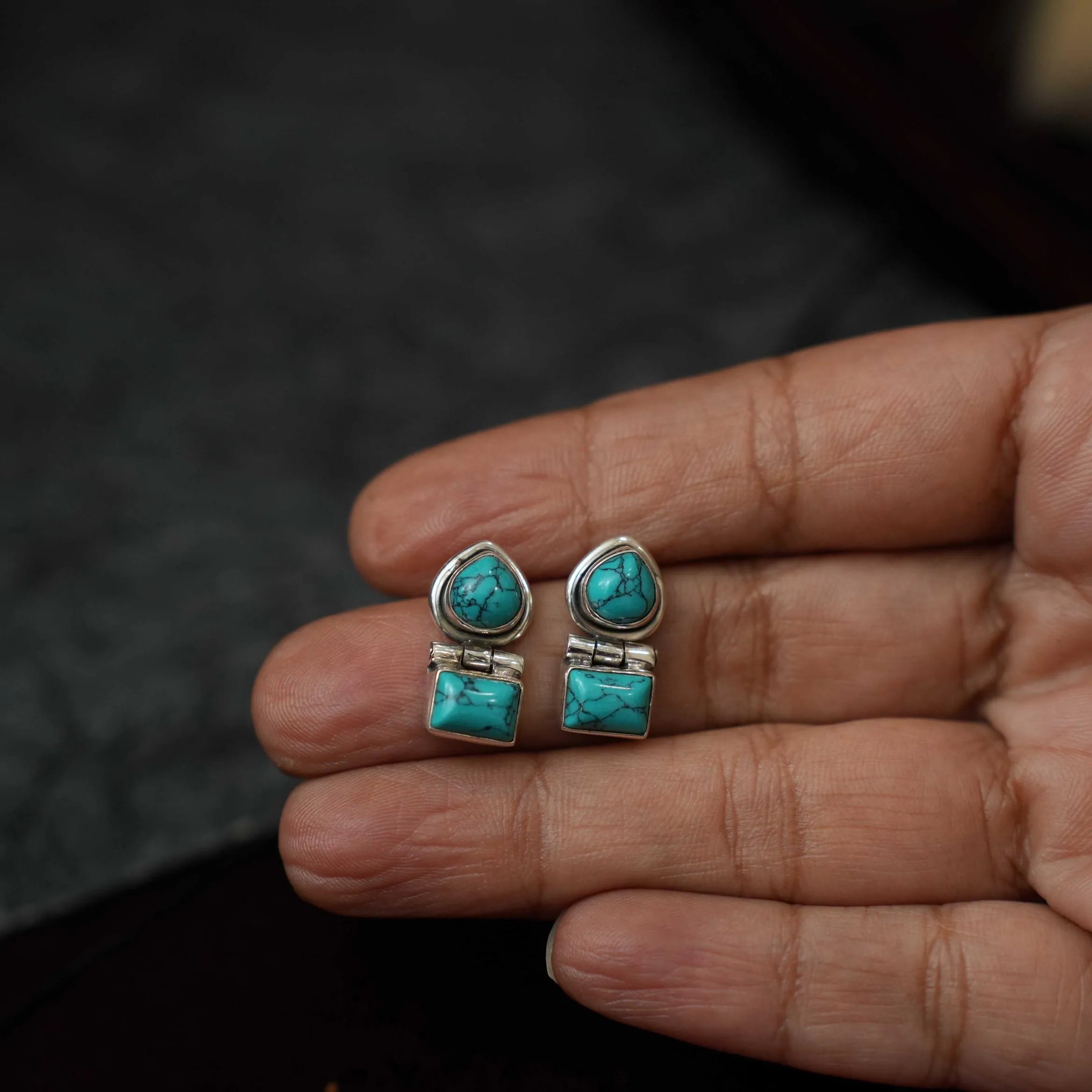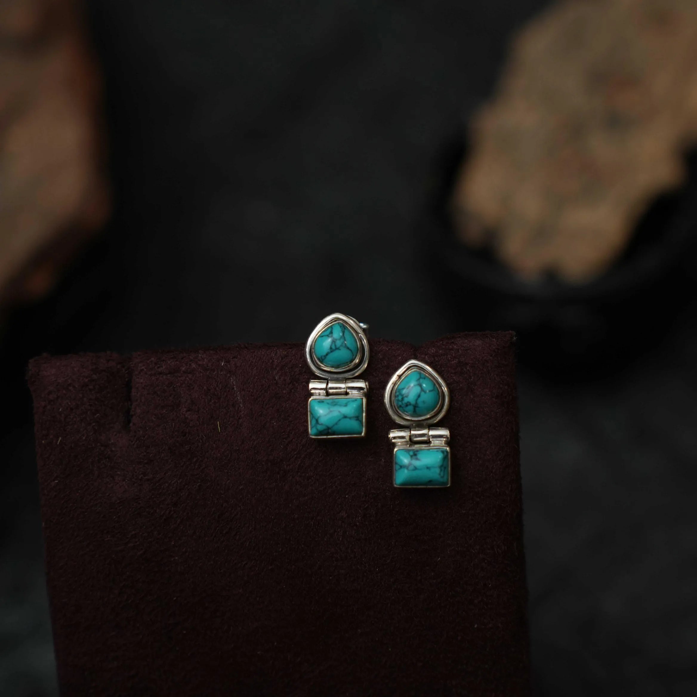 A simple & casual silver oxidised ear stud adorn with turquoise stones.