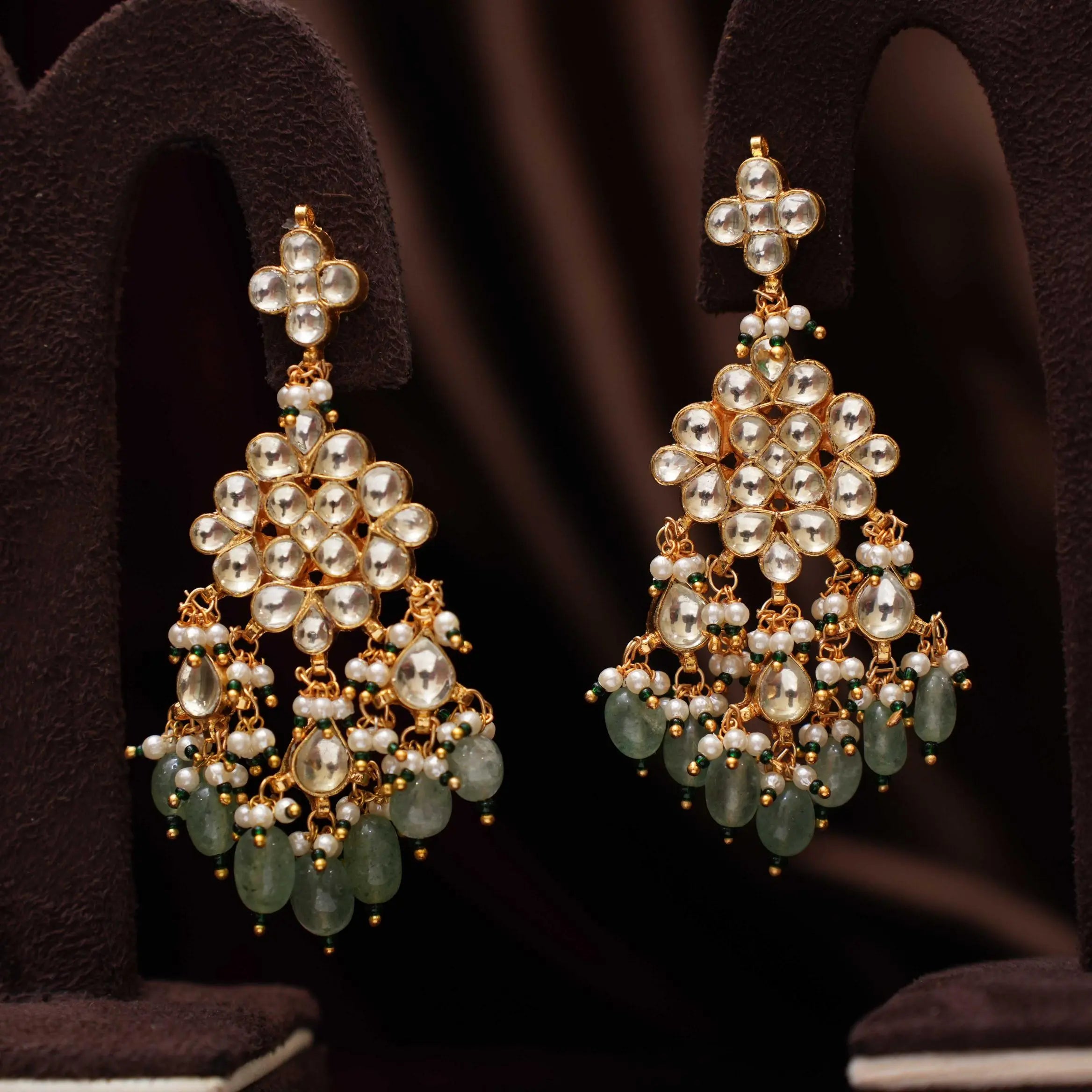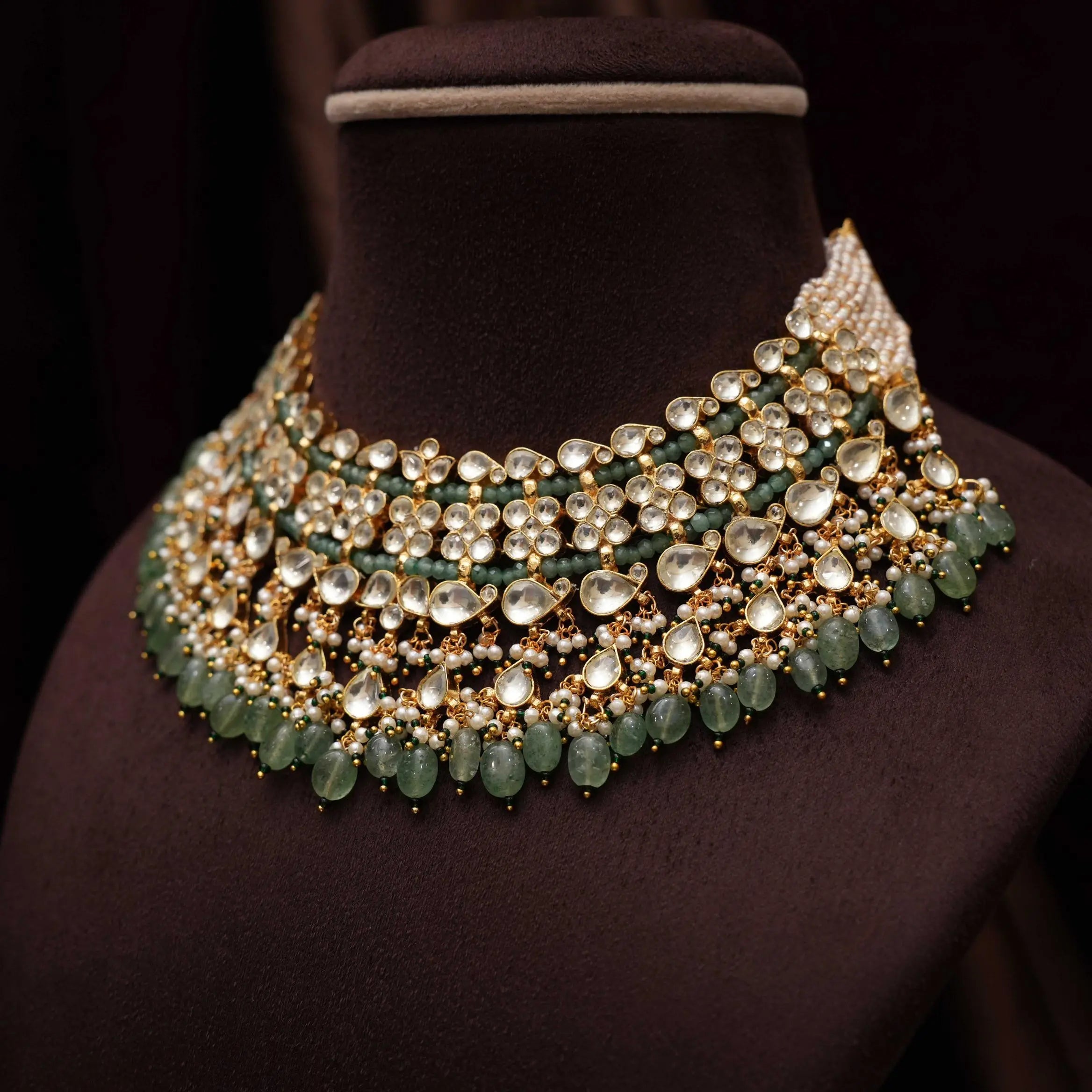This gold-plated necklace features intricately set artificial Polki stones, complemented by a vibrant line of green beads that add a lively, eye-catching touch. The piece is elegantly strung in layers of pearls and finished with green stone drops accented by delicate pearl details.