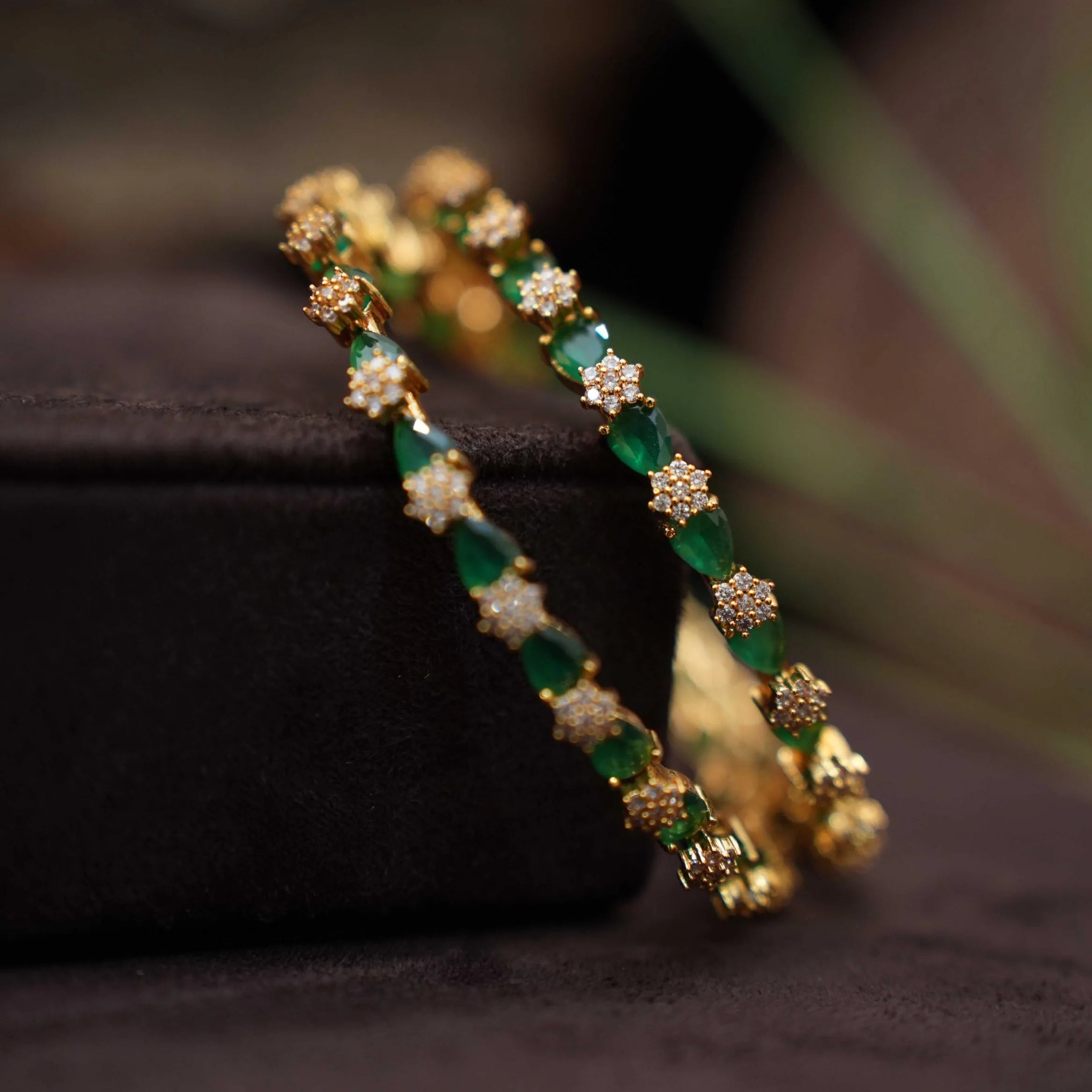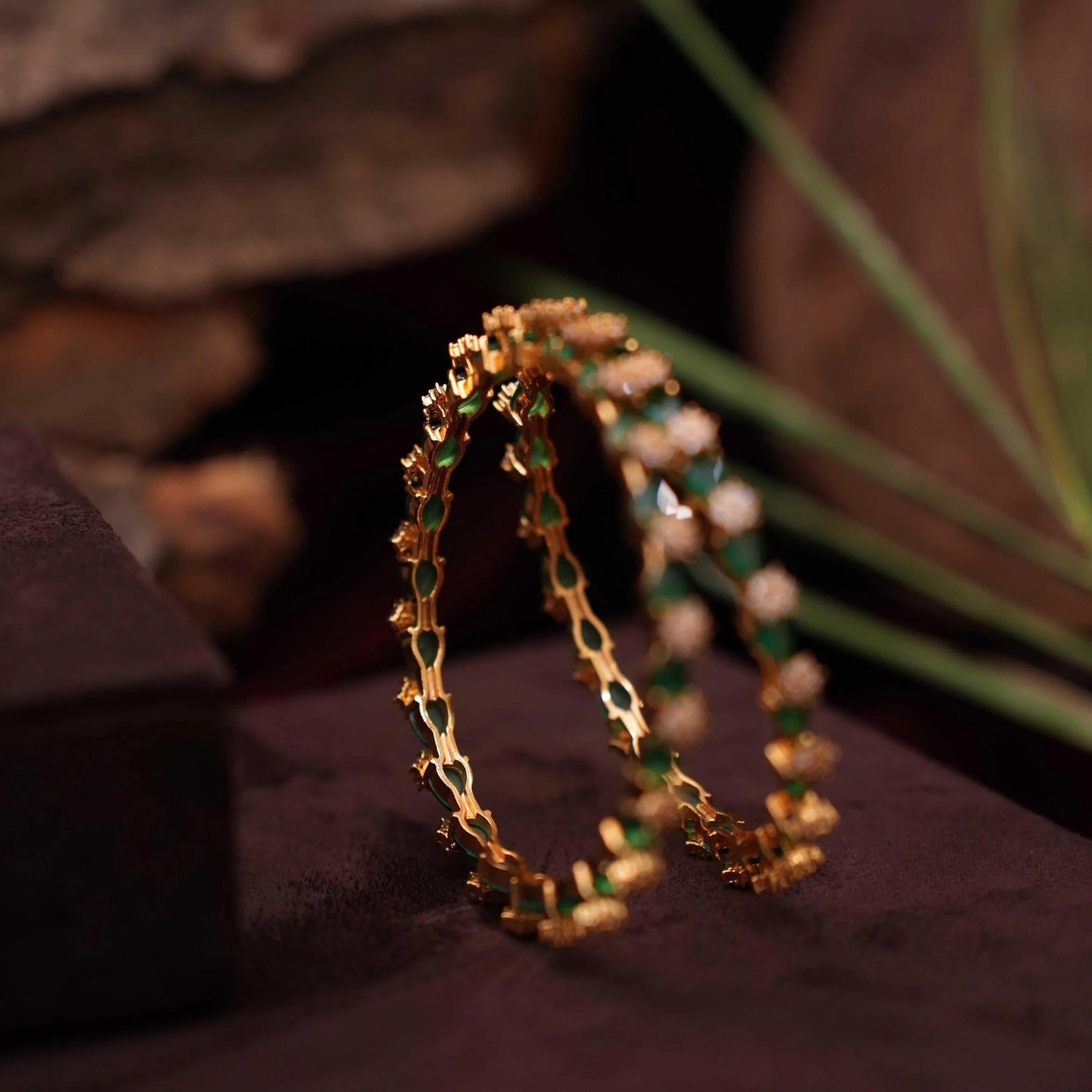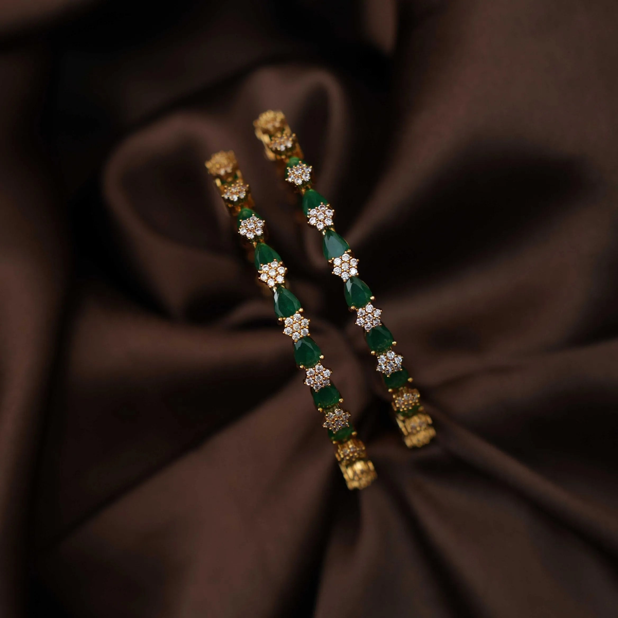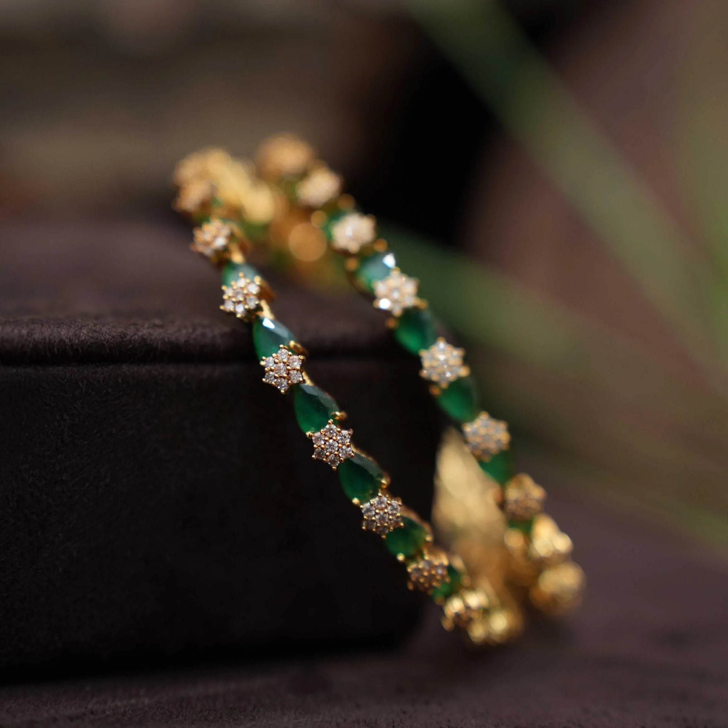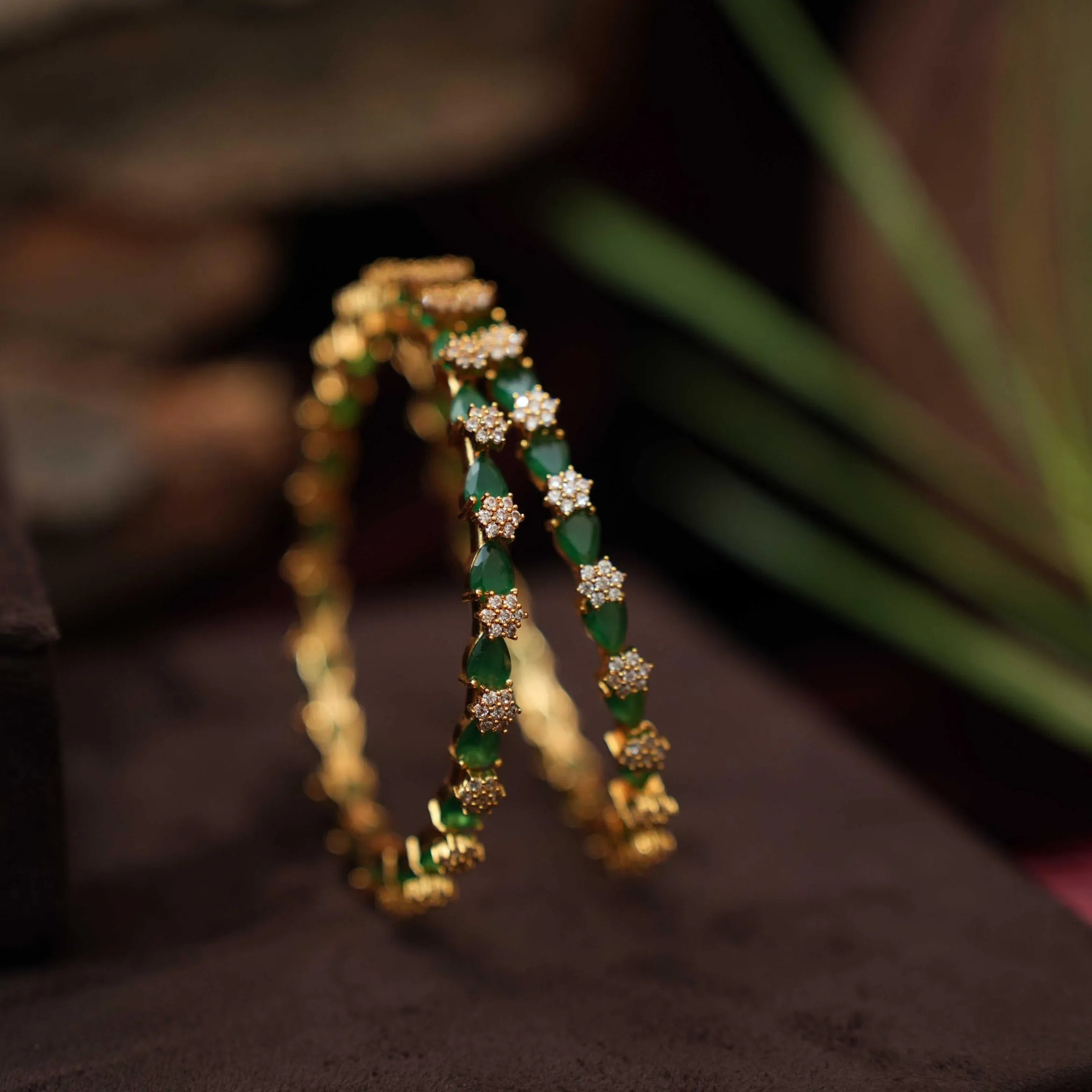 A vibrant pair of bangles studded with green agate and white zircon stones.