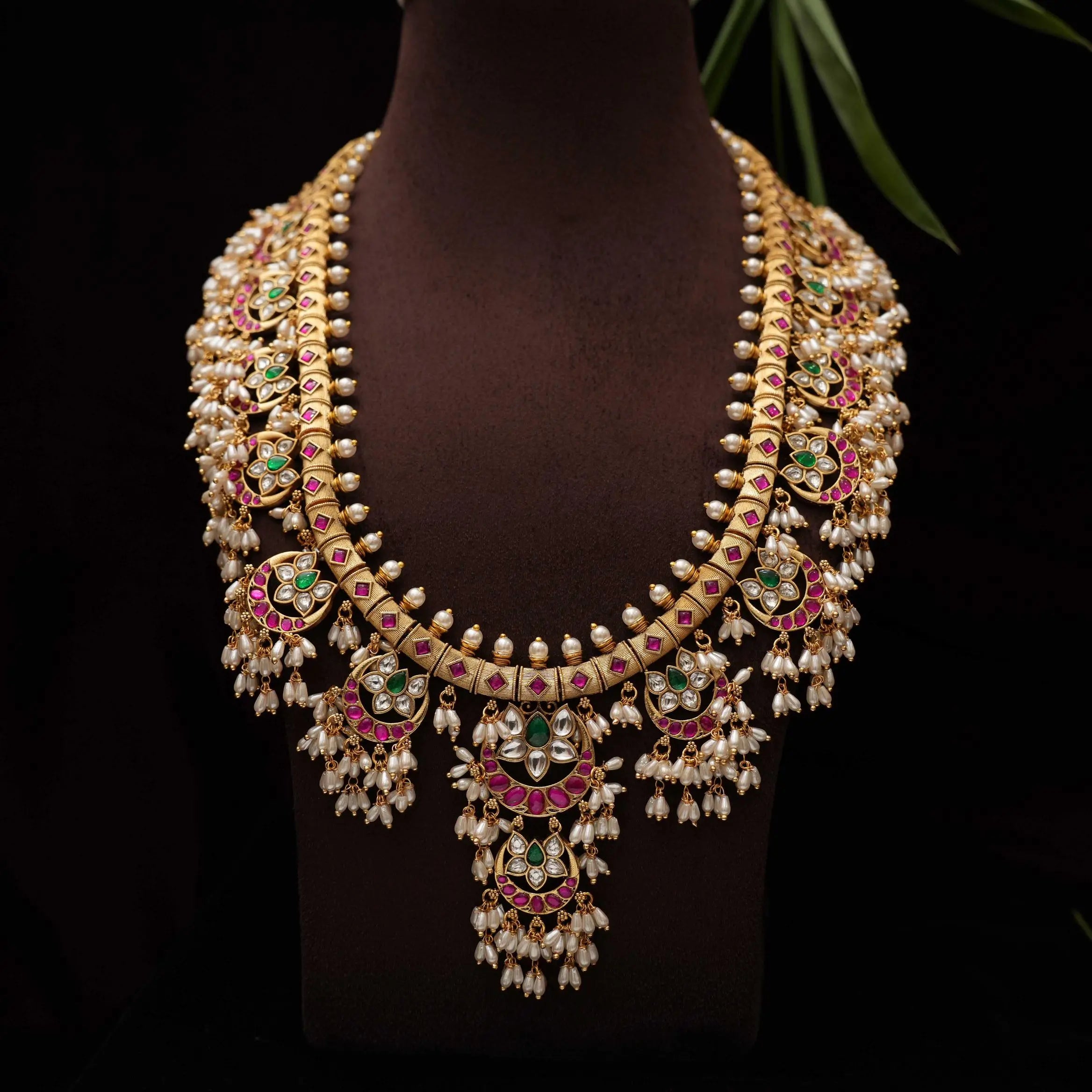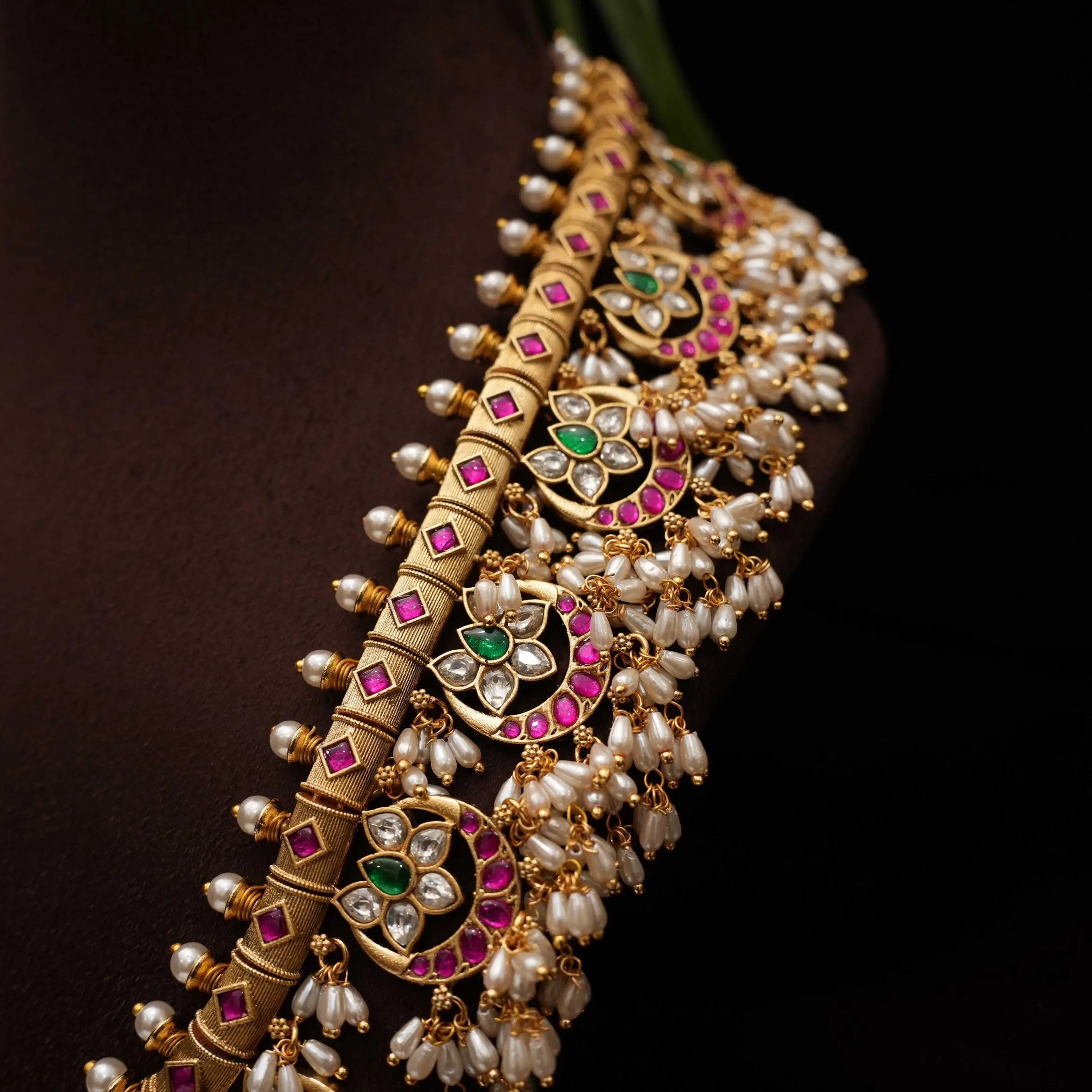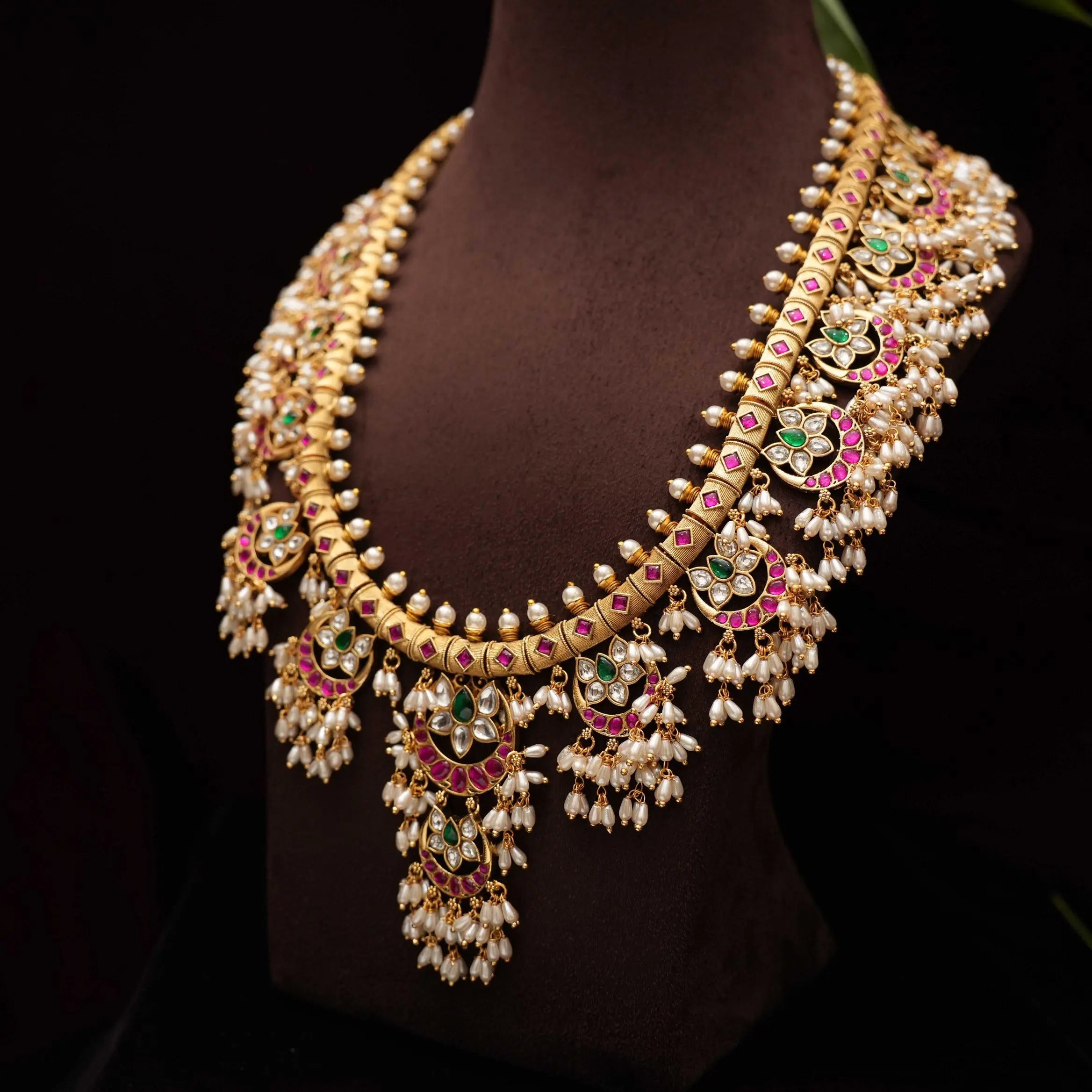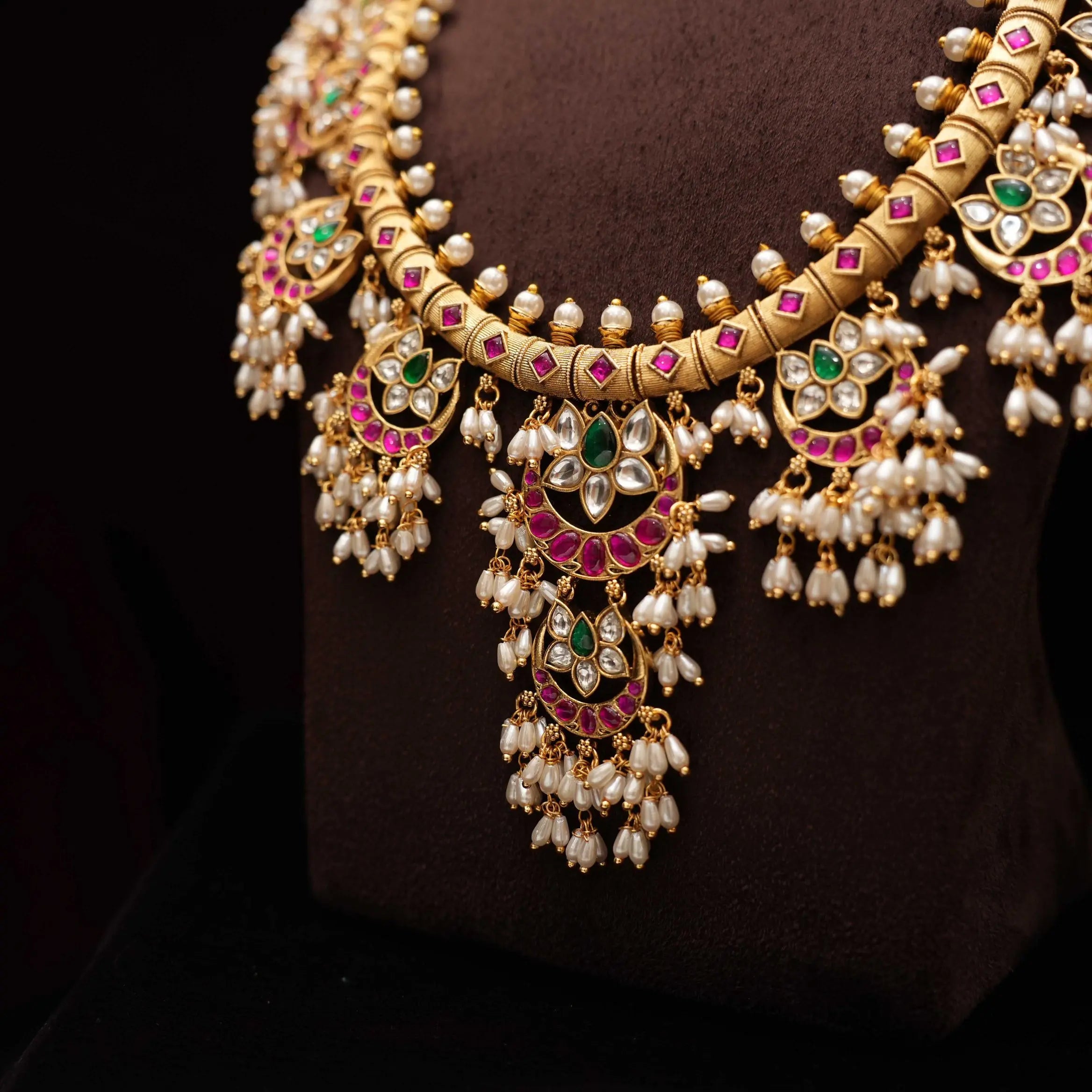 A statement necklace handcrafted in floral and chand motif studded with kemp stones adorn with fresh water pearls. This set comes with a pair of earrings.
