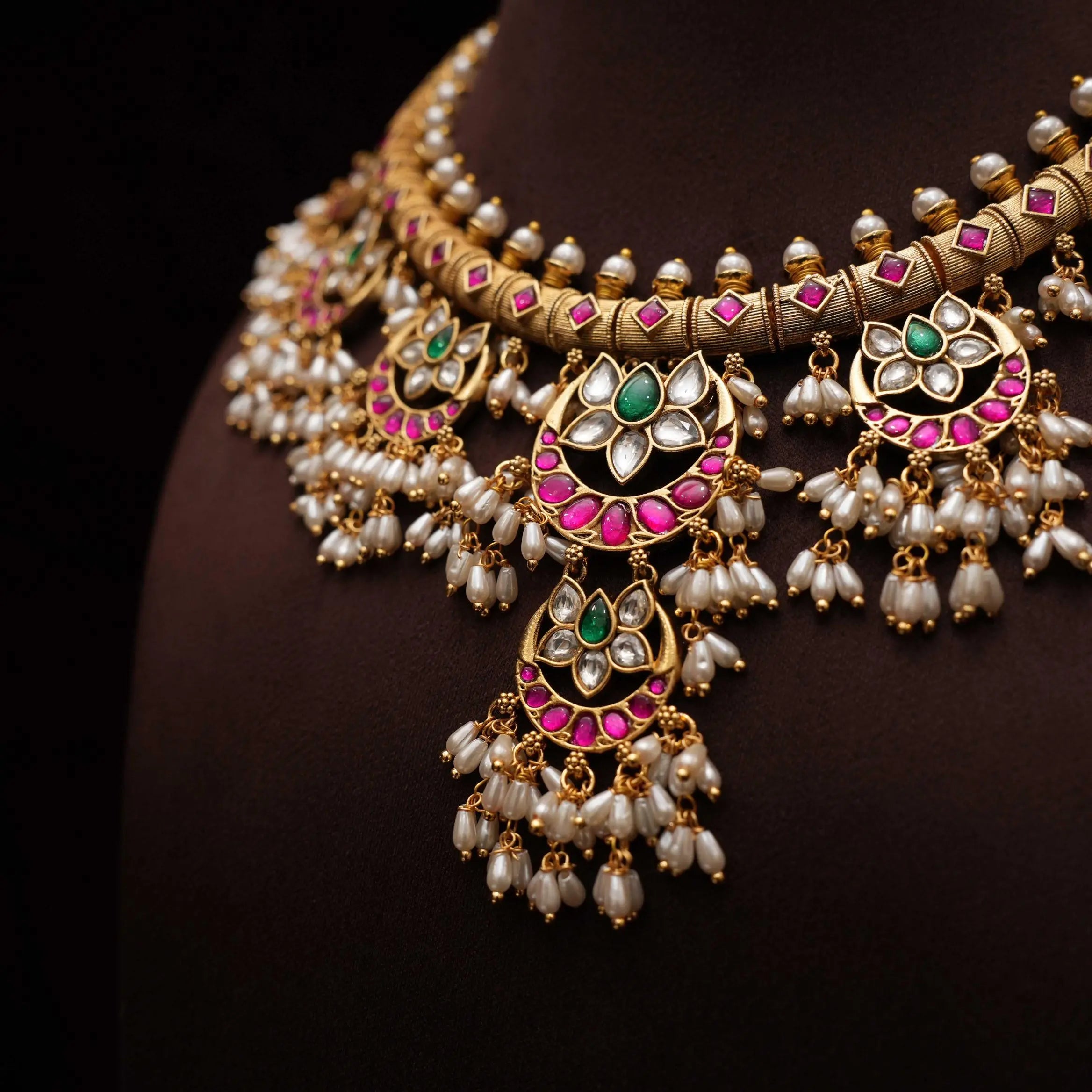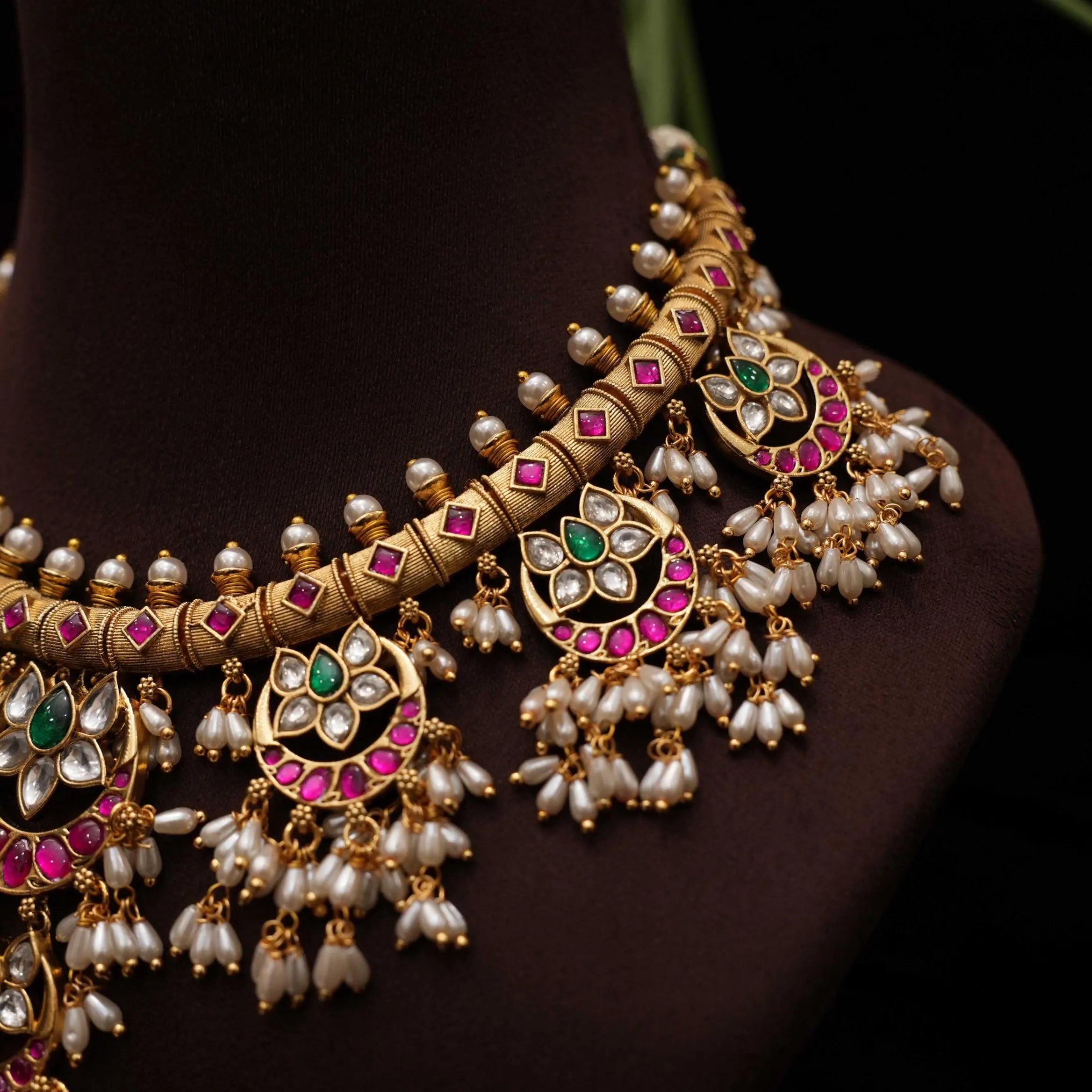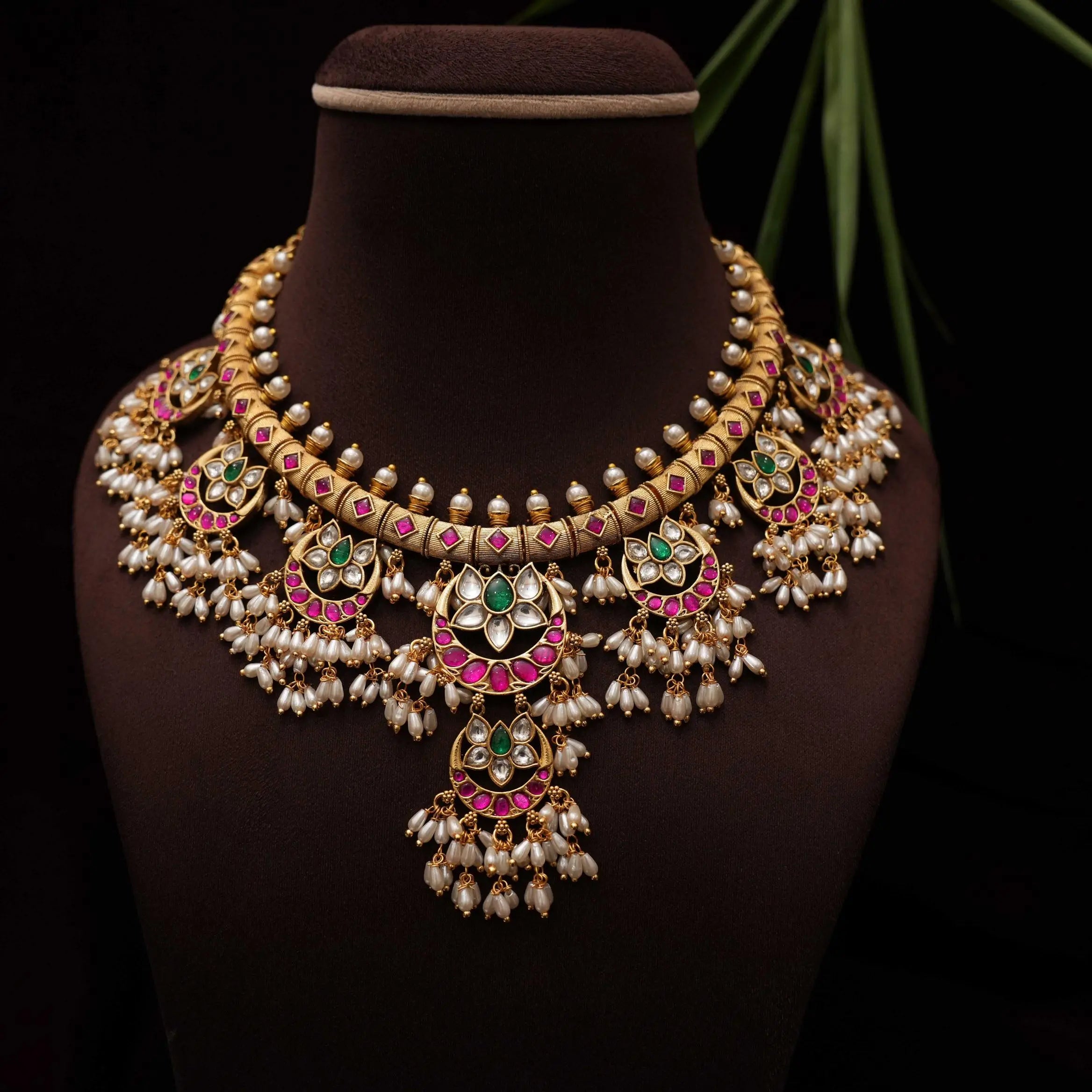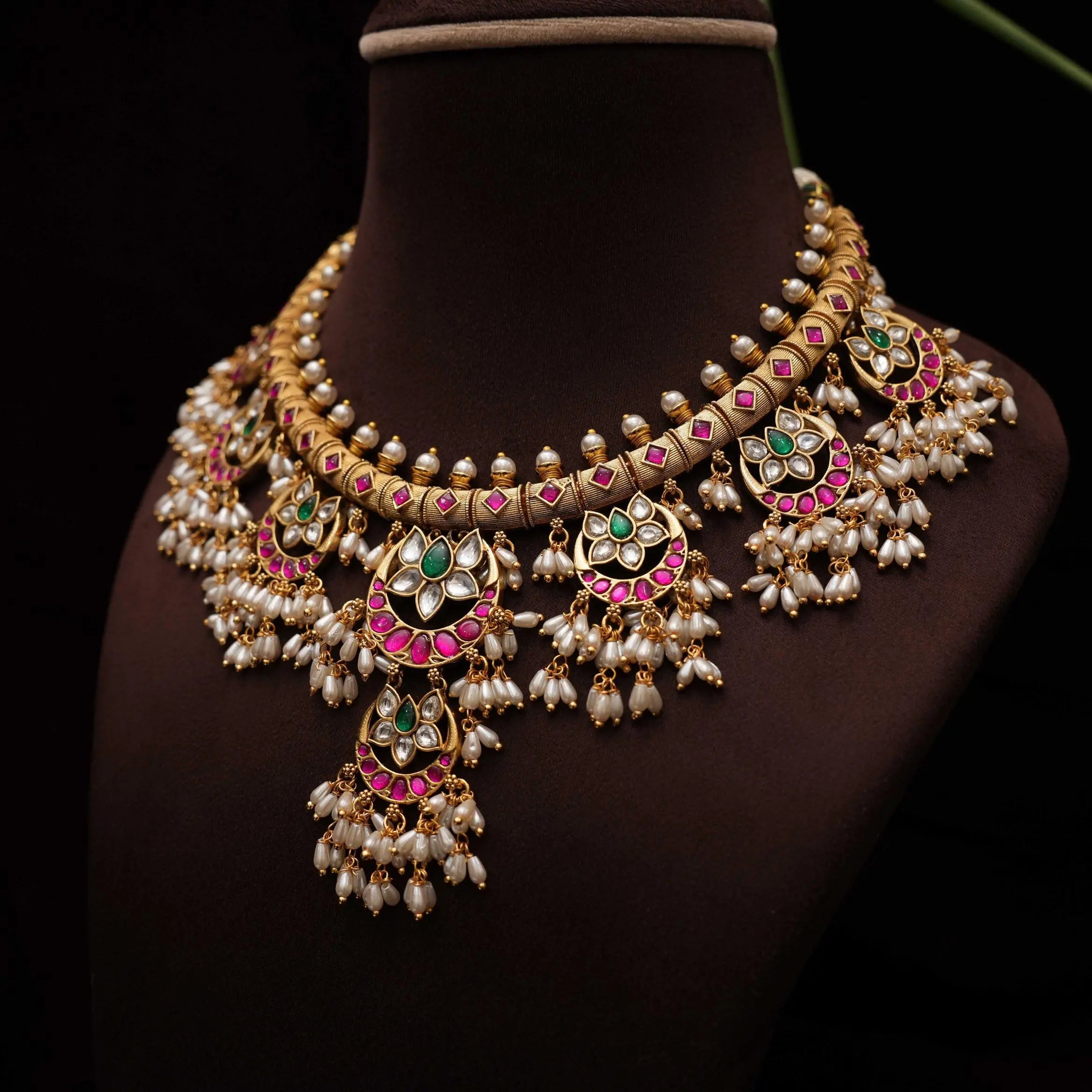 A statement necklace handcrafted in floral and chand motif studded with kemp stones adorn with fresh water pearls. This set comes with a pair of earrings.