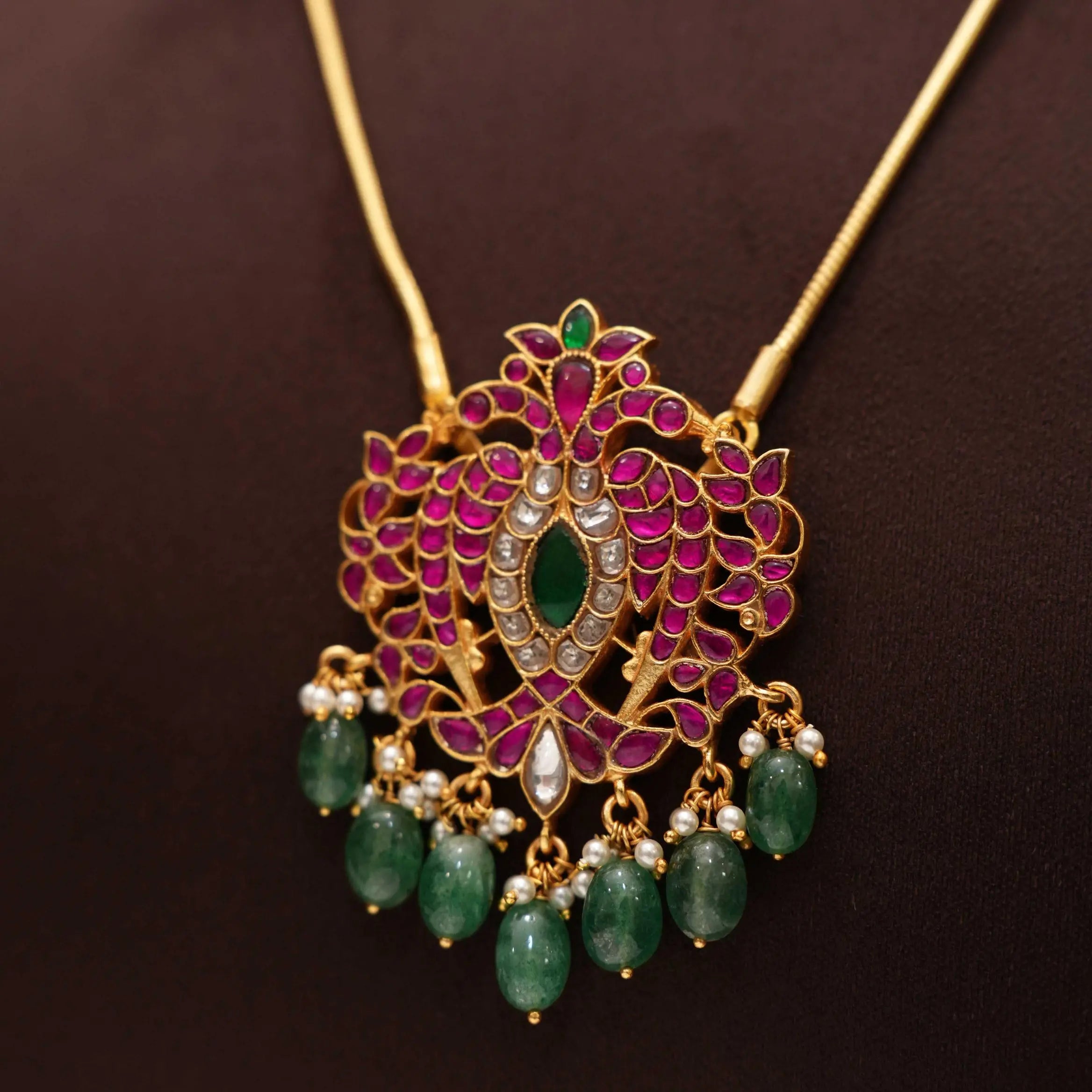Embrace the beauty of tradition with this exquisite handcrafted silver chain, featuring a striking iruthalai pakshi motif pendant that captures the essence of heritage design. The pendant is intricately embellished with vibrant kemp stones, offering a rich play of red, green and white tones that are synonymous with classic South Indian jewelry.