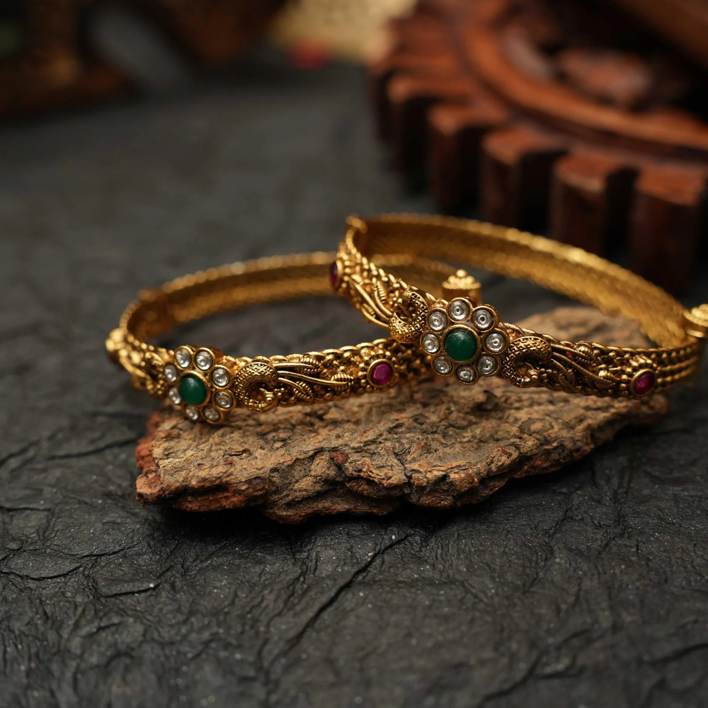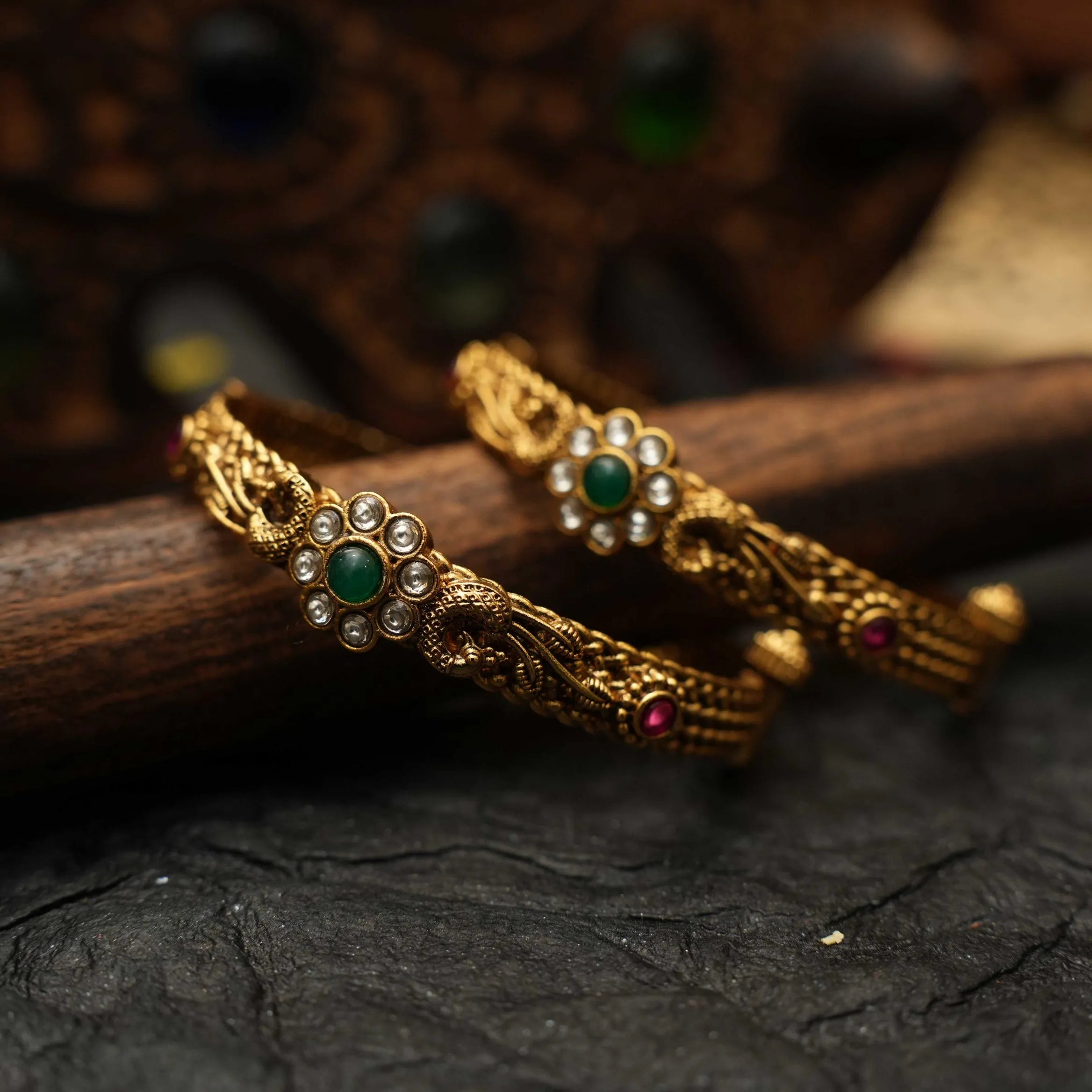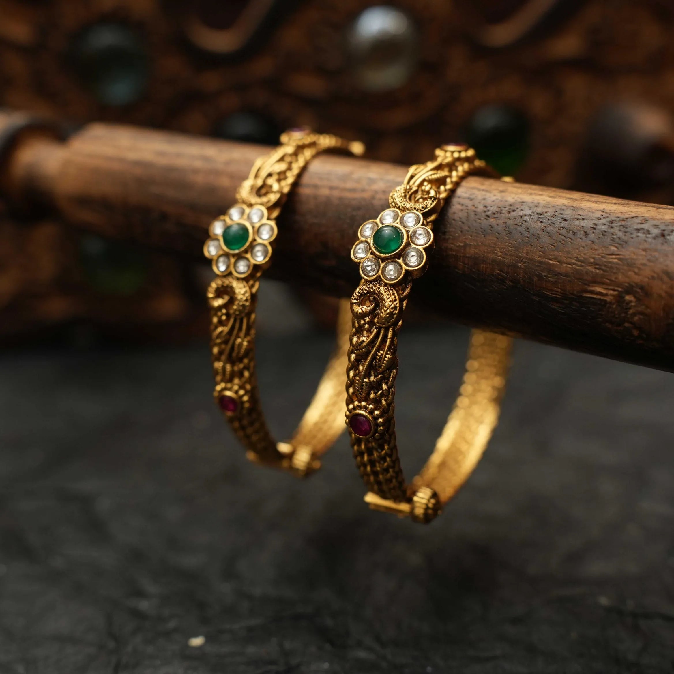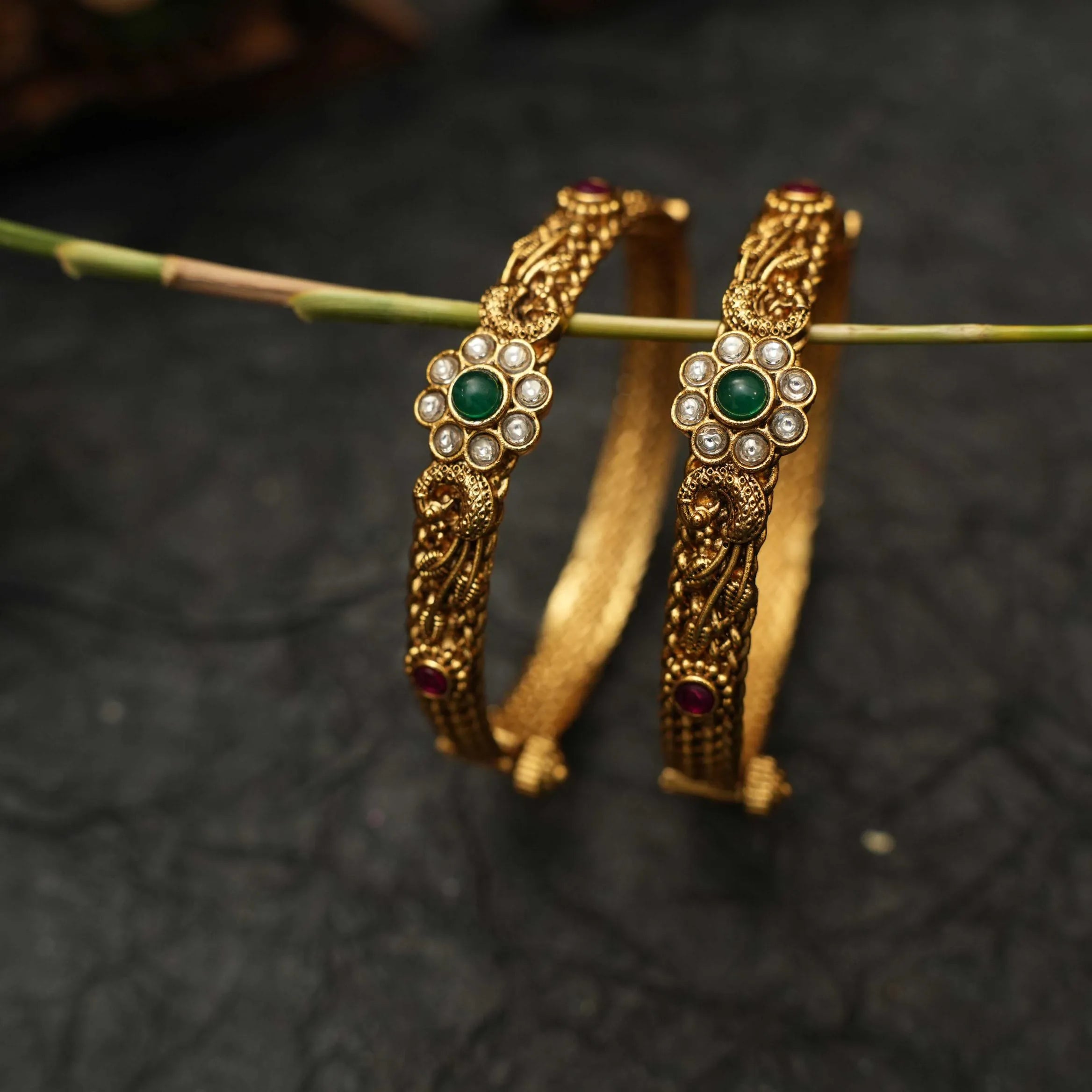 A traditional pair of antique bangle in peacock and floral motifs adorn with kemp stones.