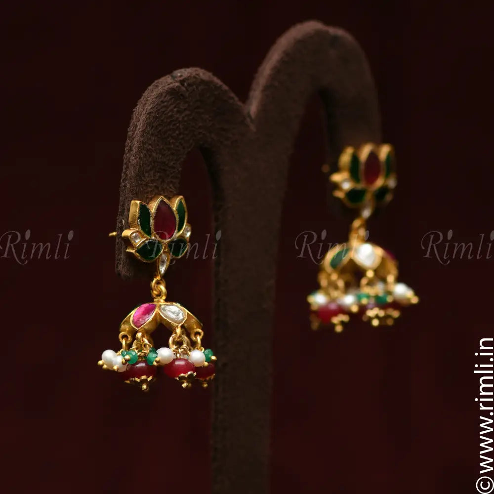 Discover a symphony of style with our 92.5 gold-plated silver small jhumka. Adorned with vibrant red and green stones, embellished with the rhythmic beauty of ghungroos, and featuring a delicate lotus motif, this intricately designed piece exudes cultural elegance and allure.