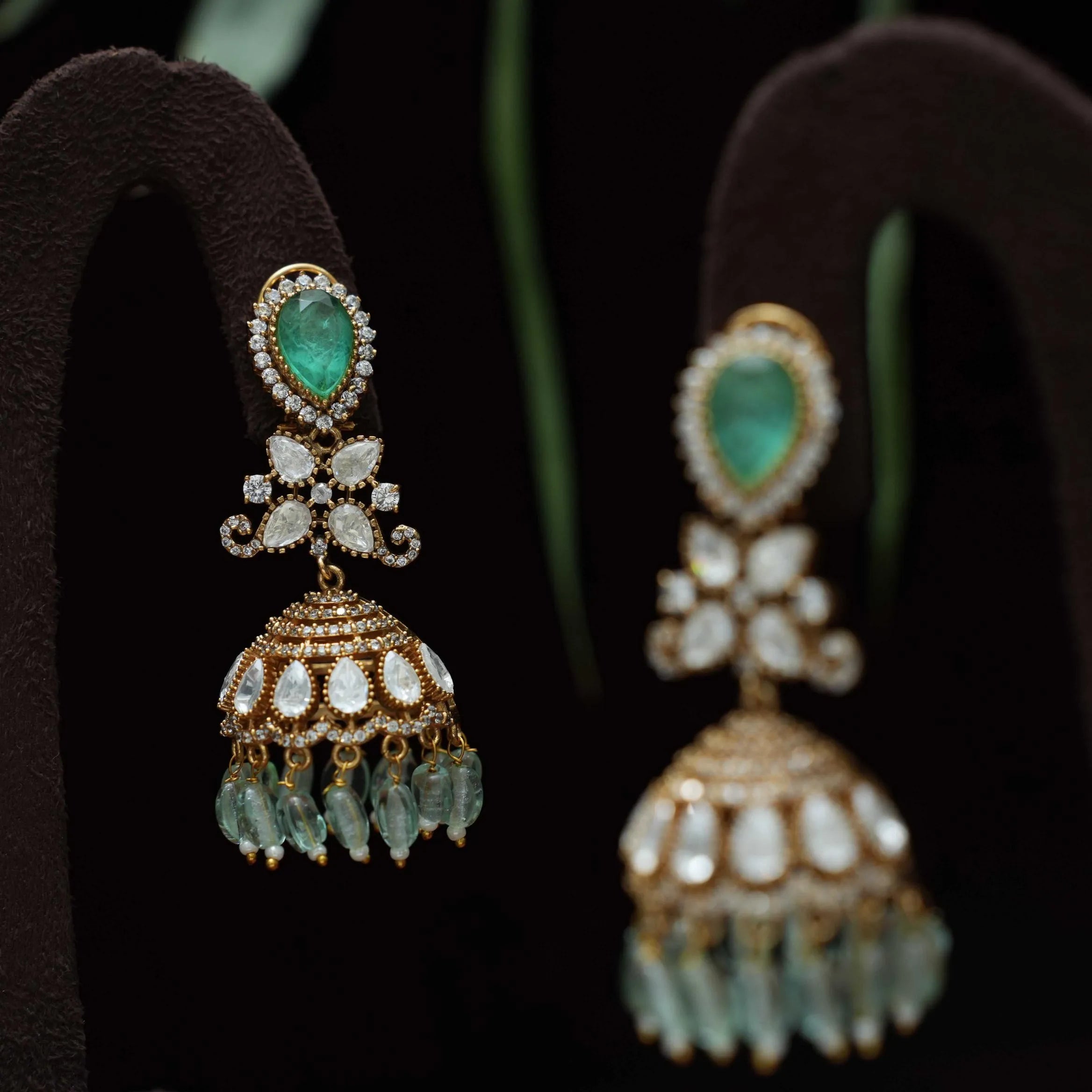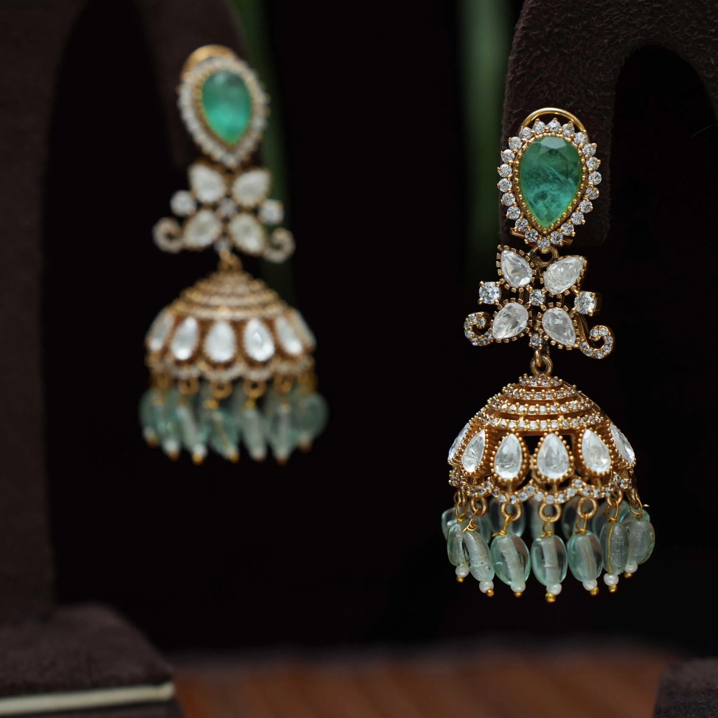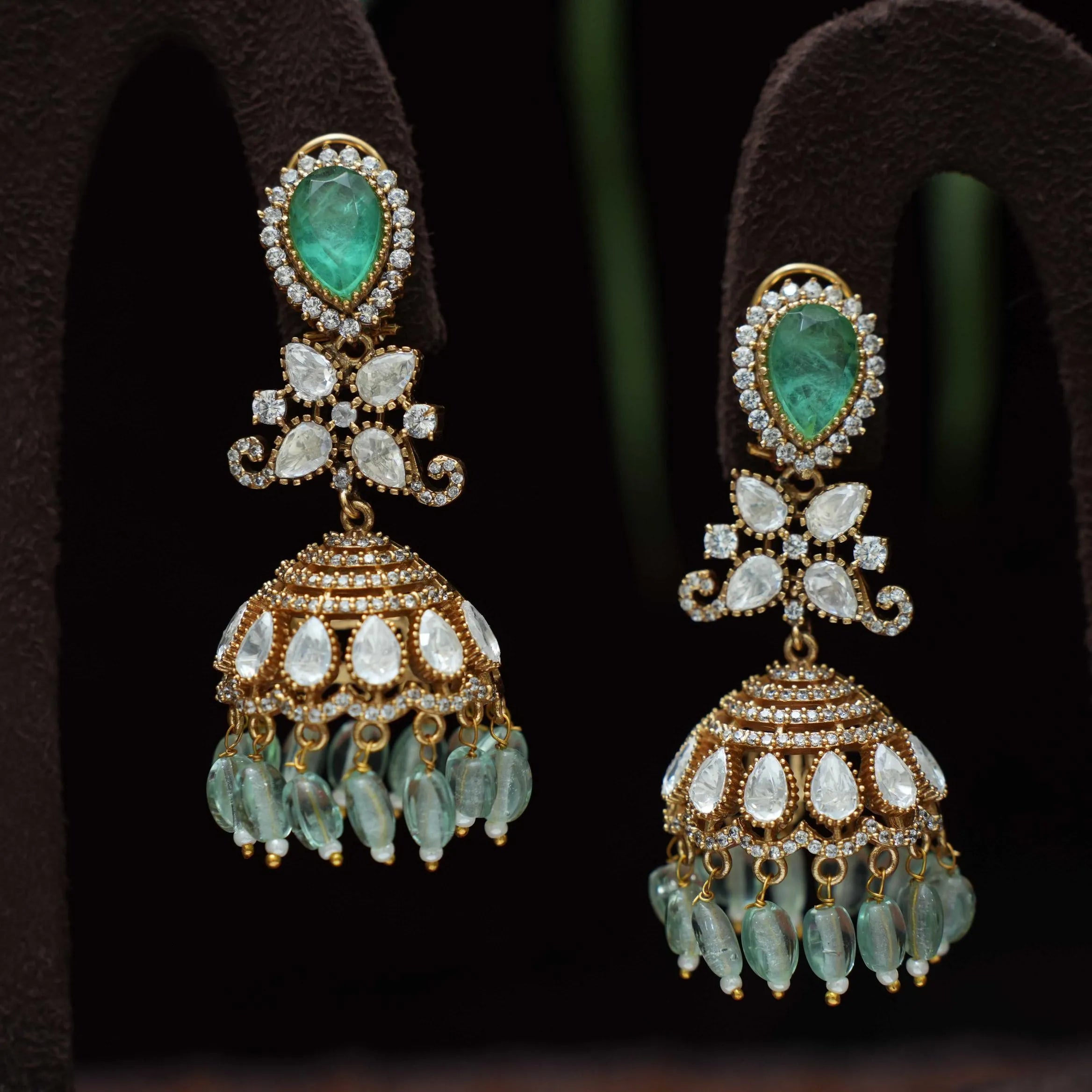 A designer jhumka earrings studded with polki stones, pastel green agate & beads finely finished in Victorian finish.