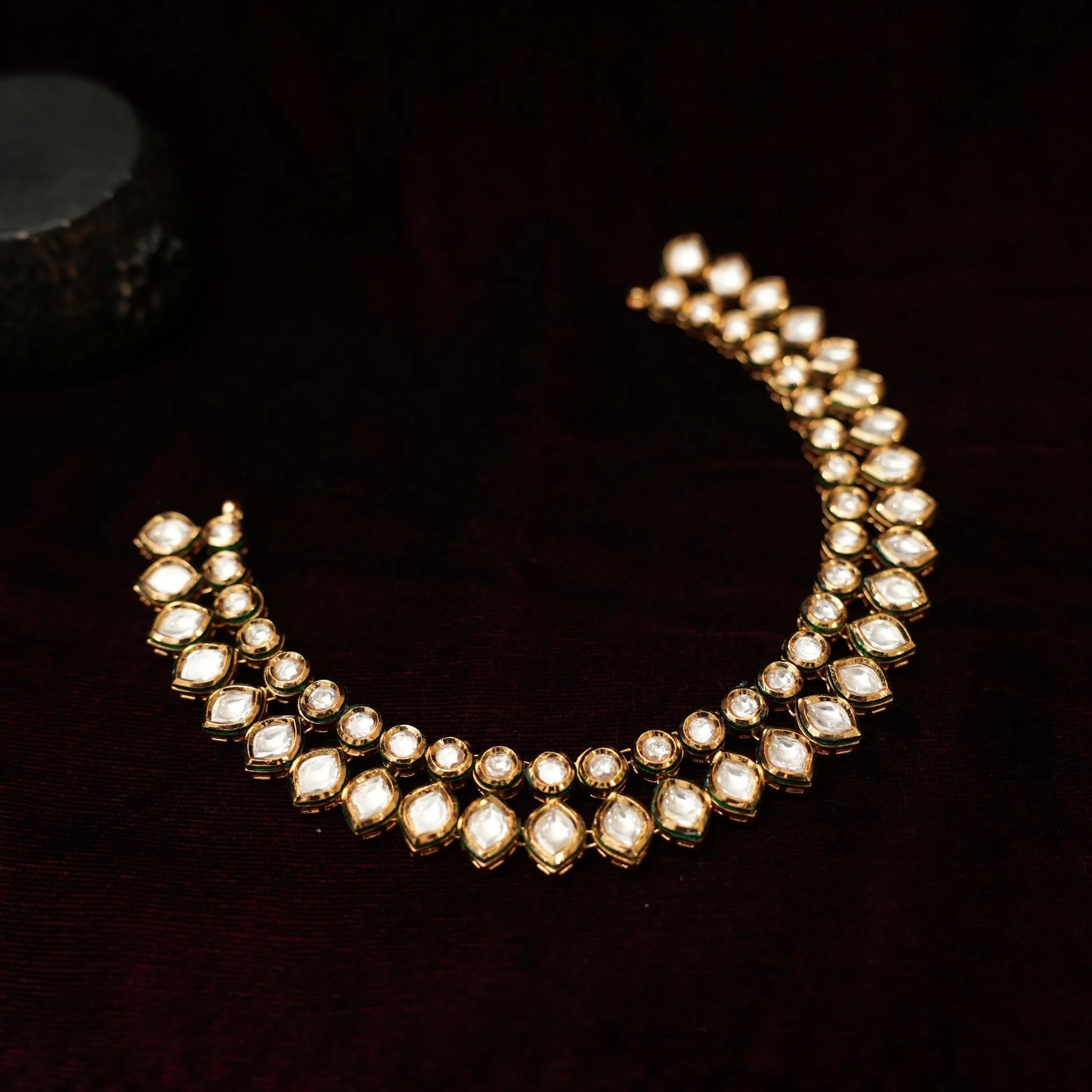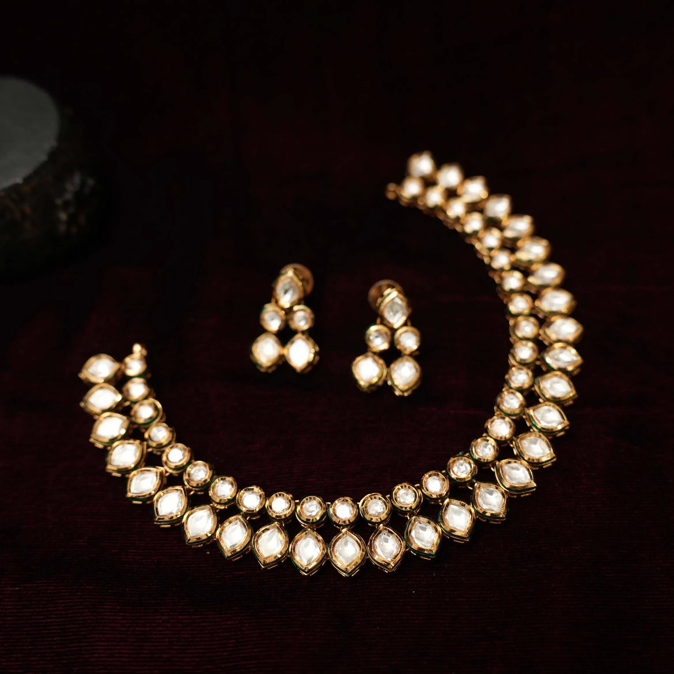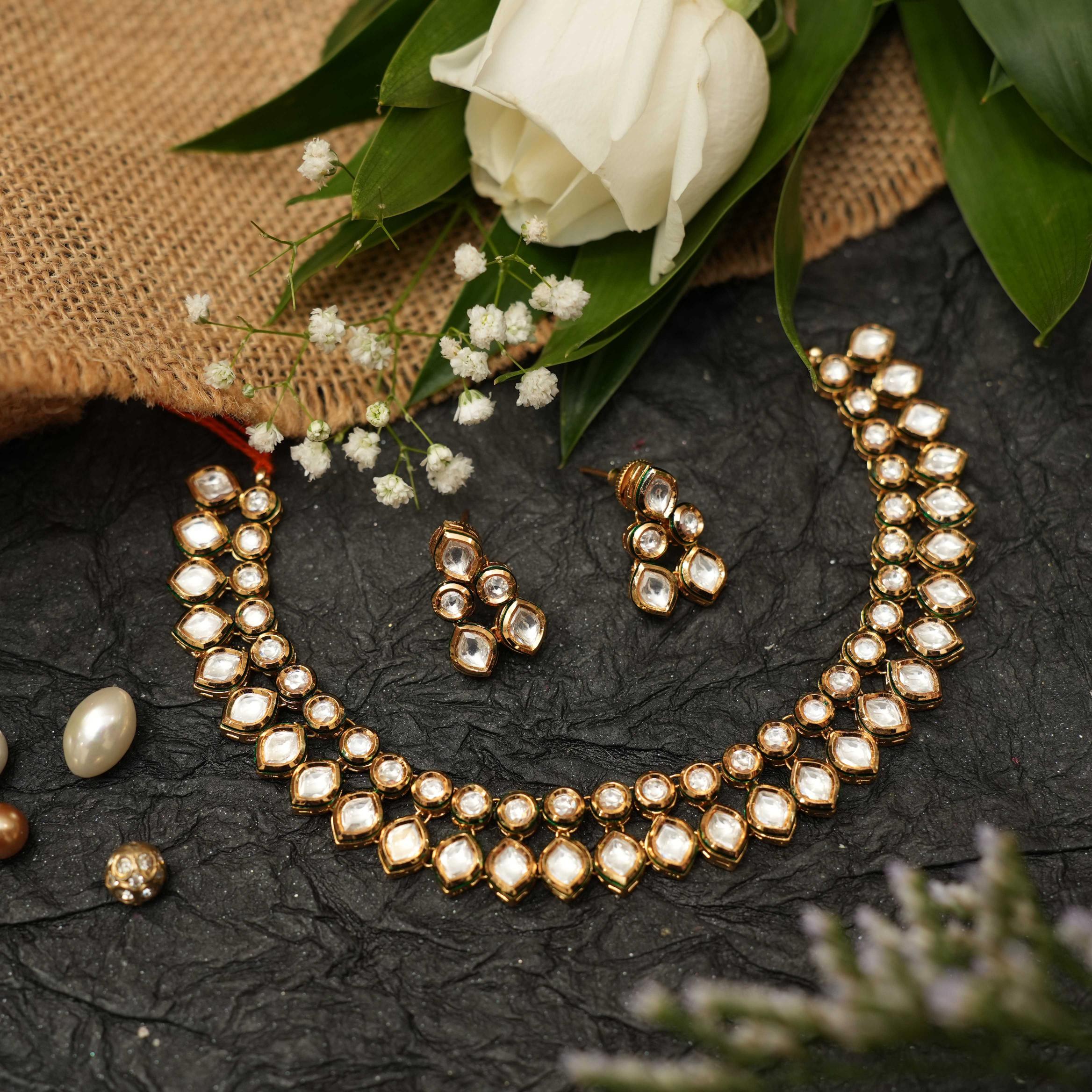 An elegant necklace handcrafted with kundan stones. This set comes with a pair of earrings.