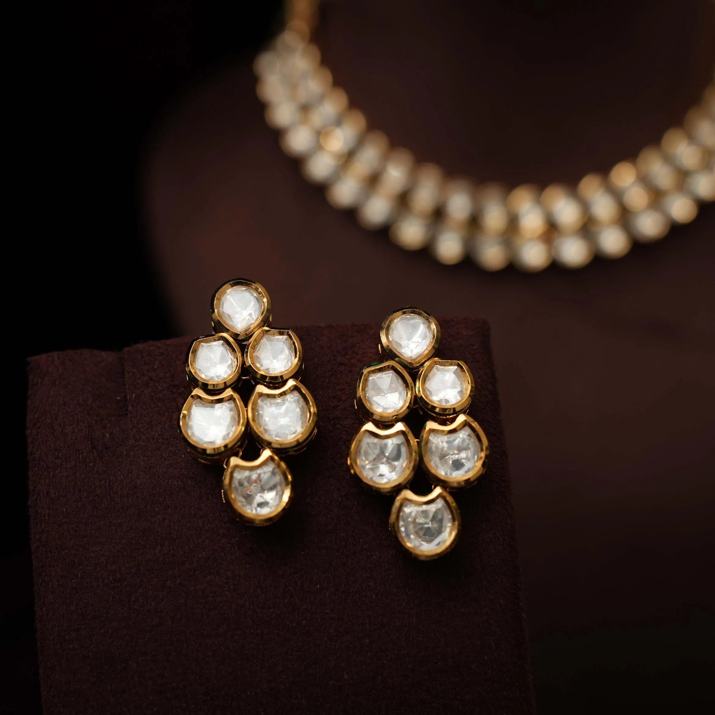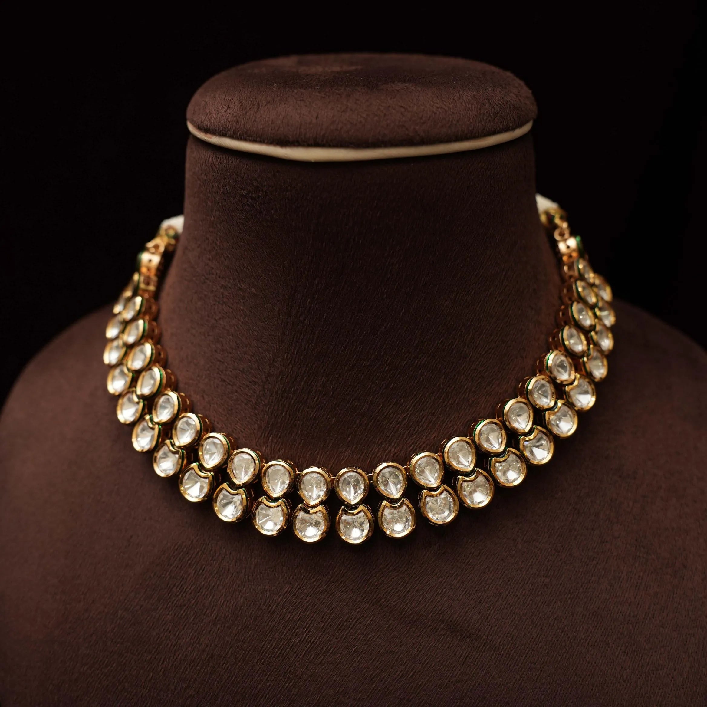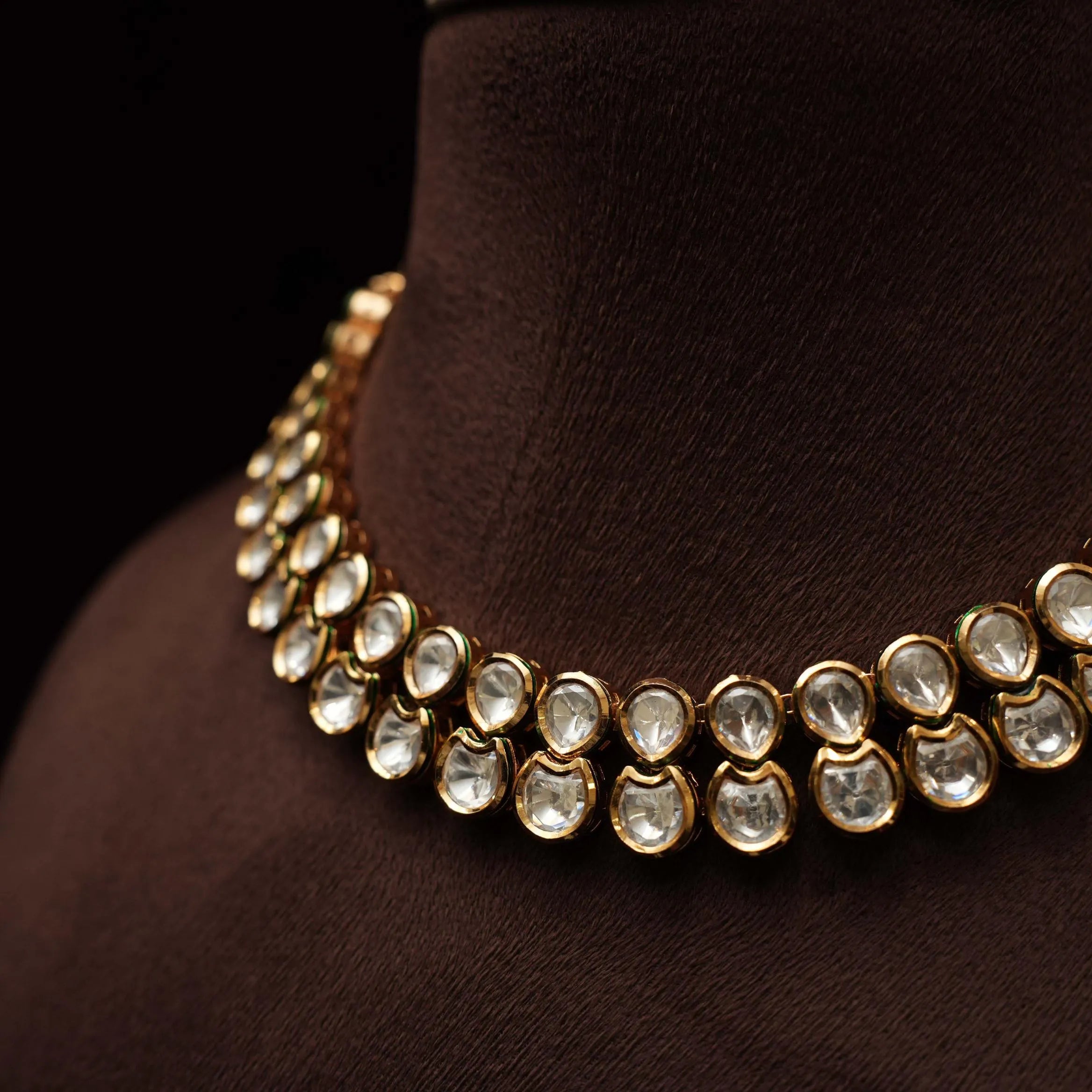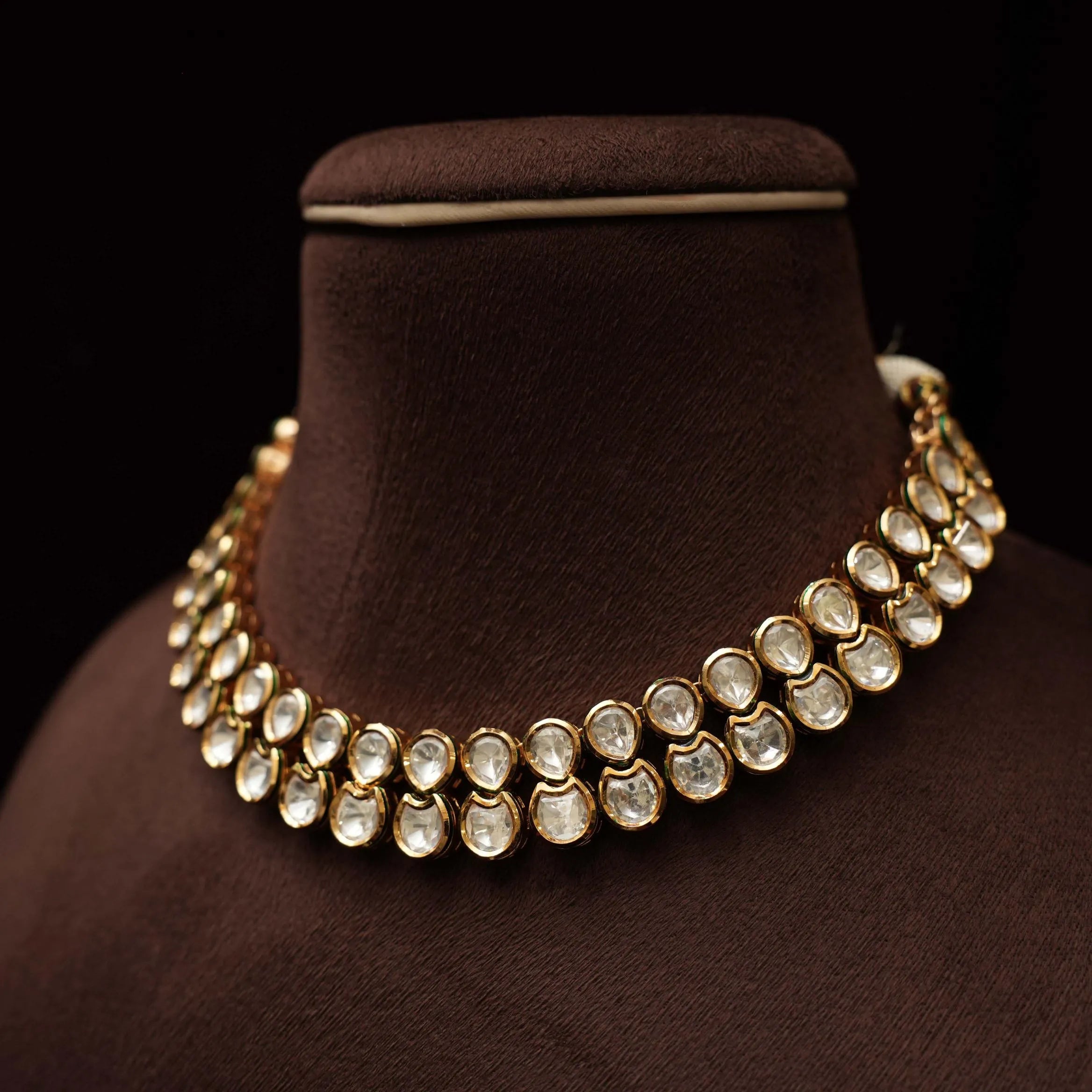 A classic layered necklace studded with kundan stones. This set comes with a pair of earrings.