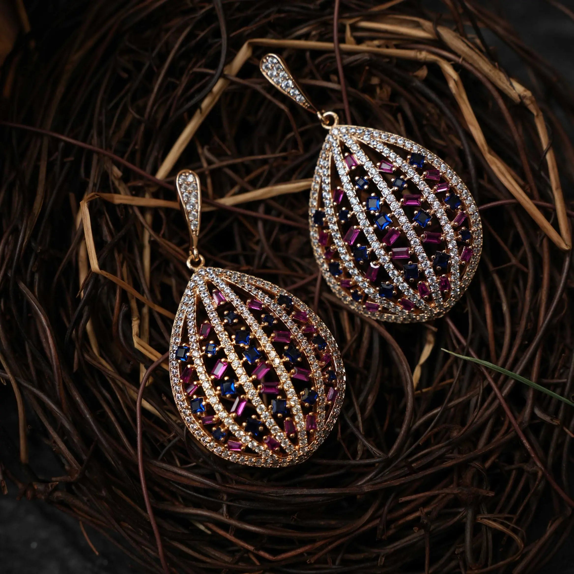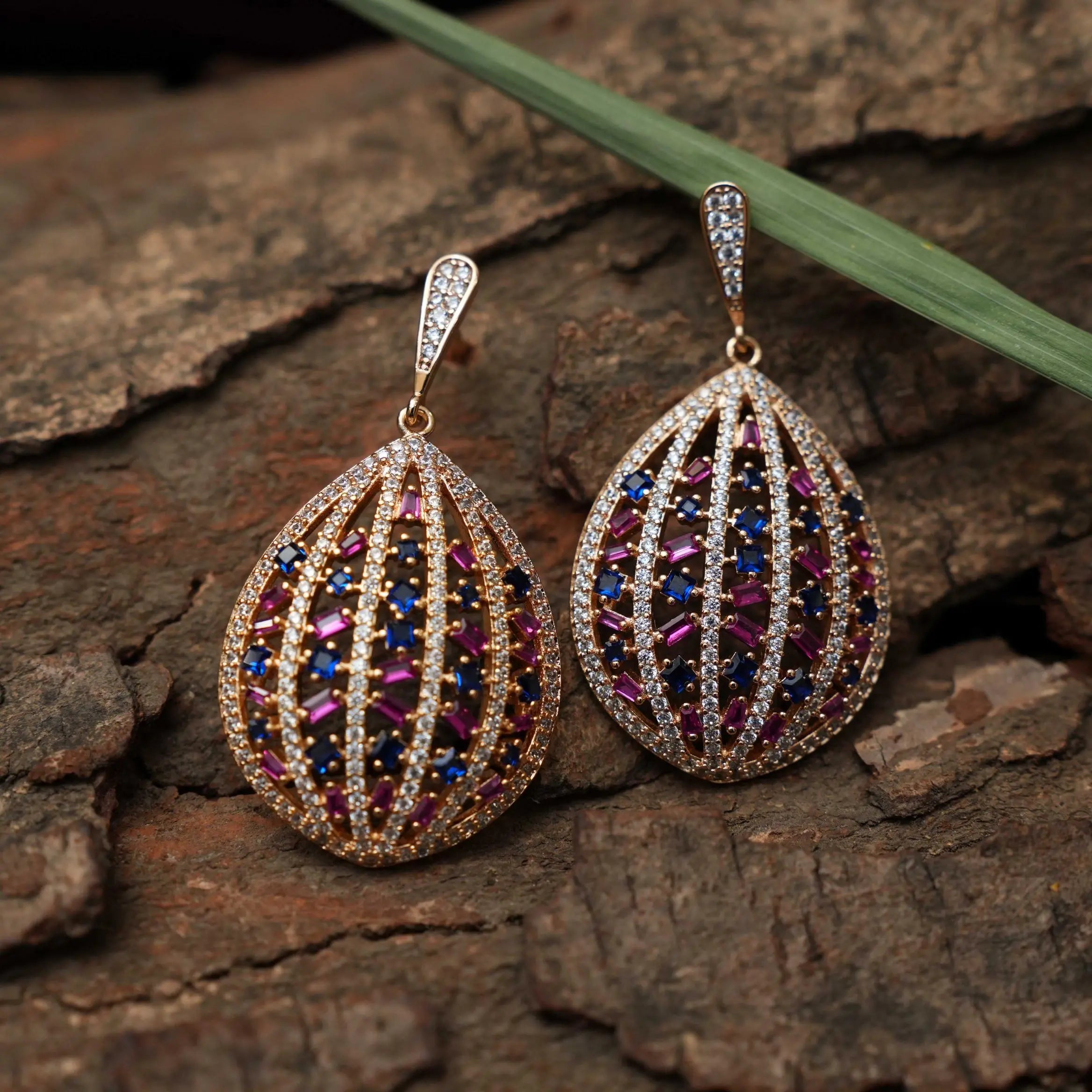 A beautiful designer earrings studded with zircon stones adorn with red and blue agate.