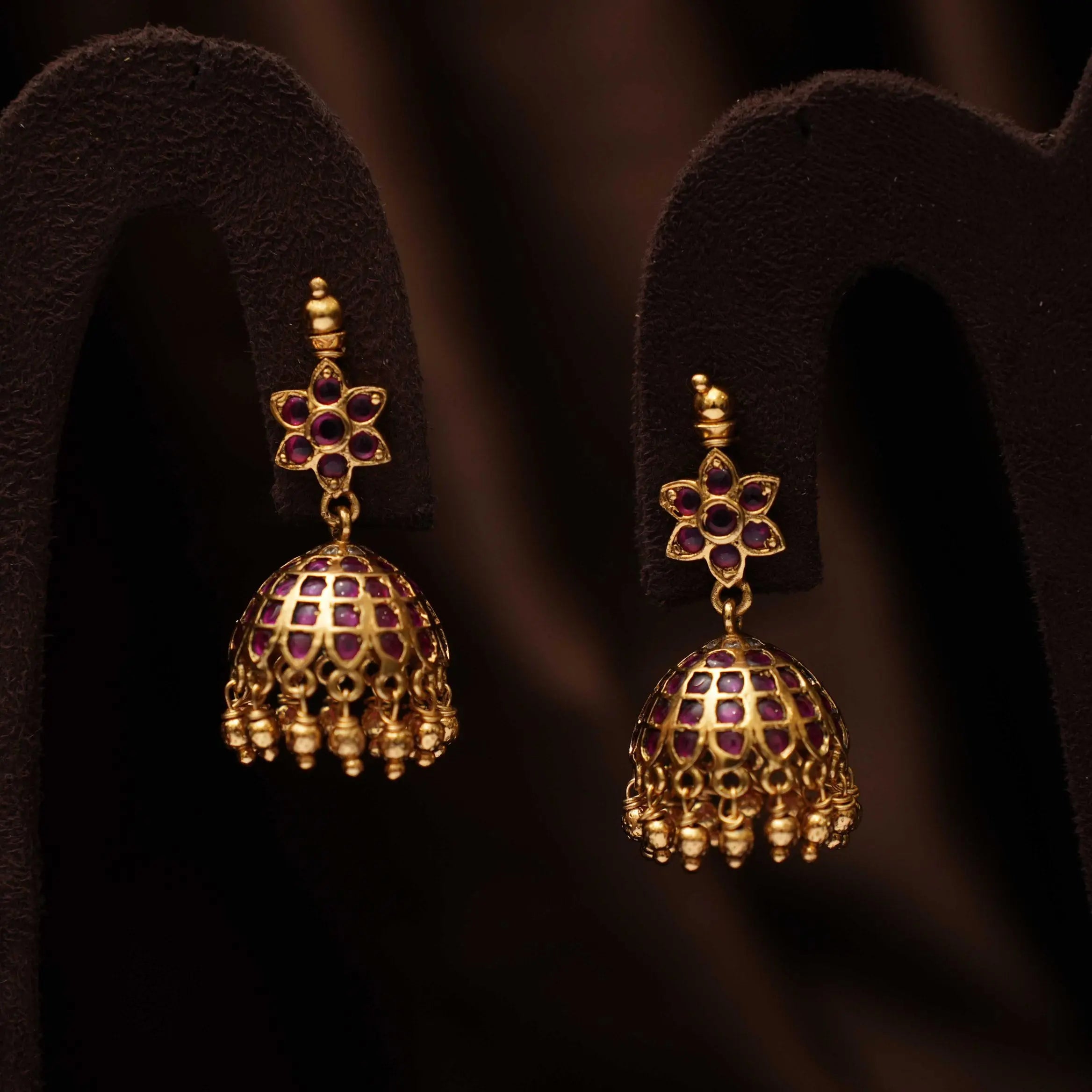 A simple mini jhumka handcrafted with kemp stones and golden balls.