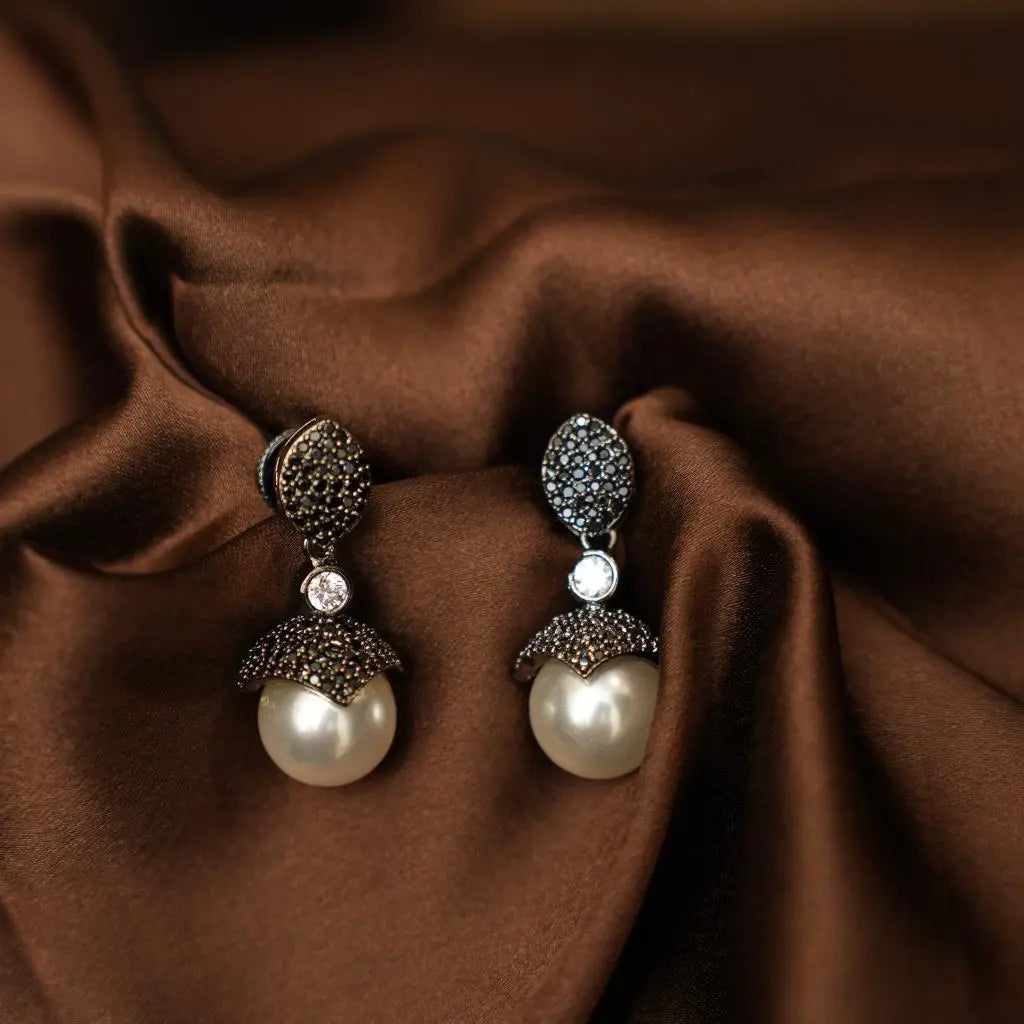 A simple and elegant designer earrings studded with zircon stones adorn with pearl.