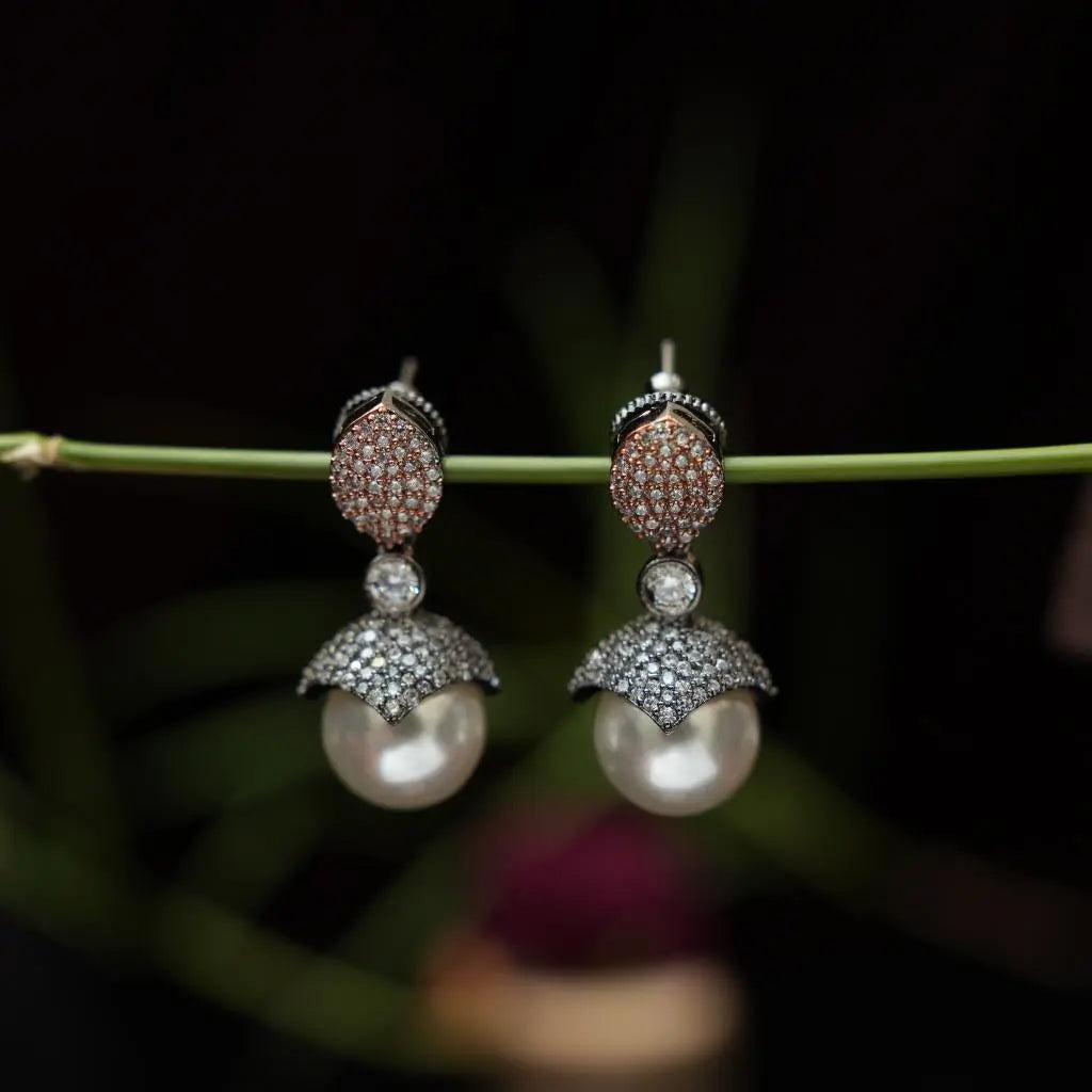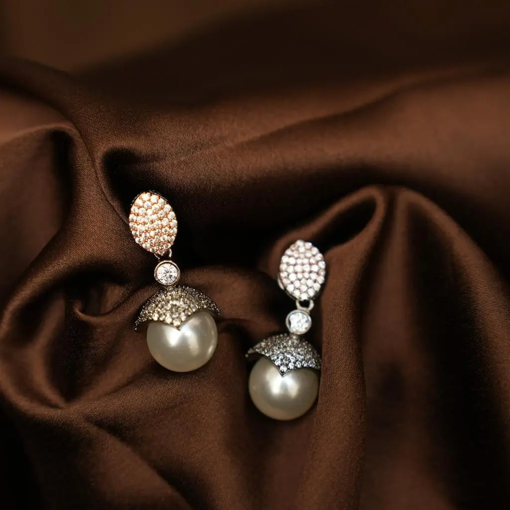 A simple and elegant designer earrings studded with zircon stones adorn with pearl.