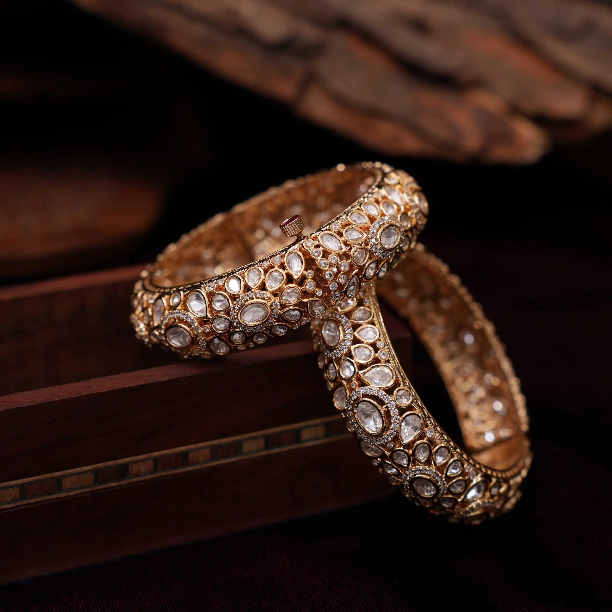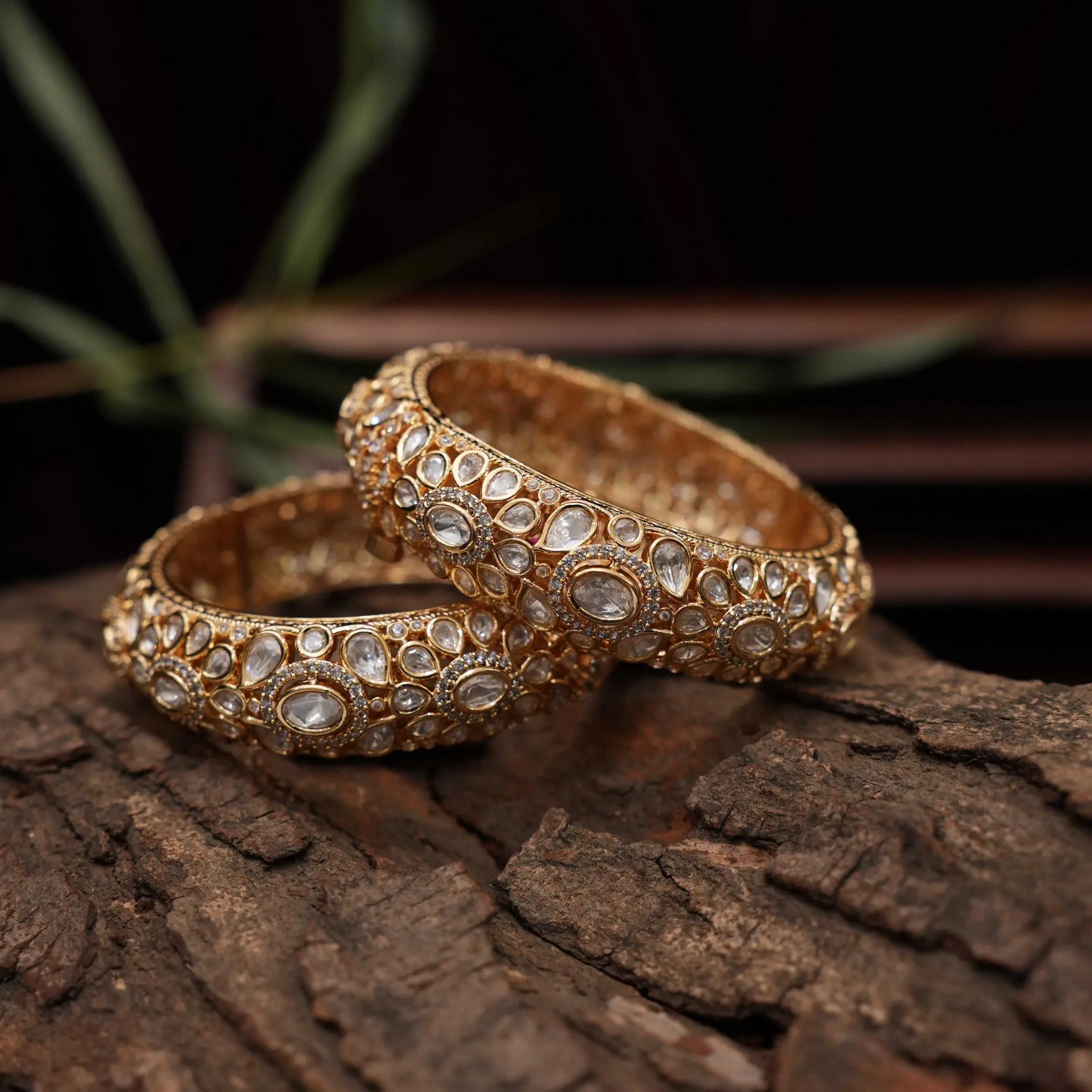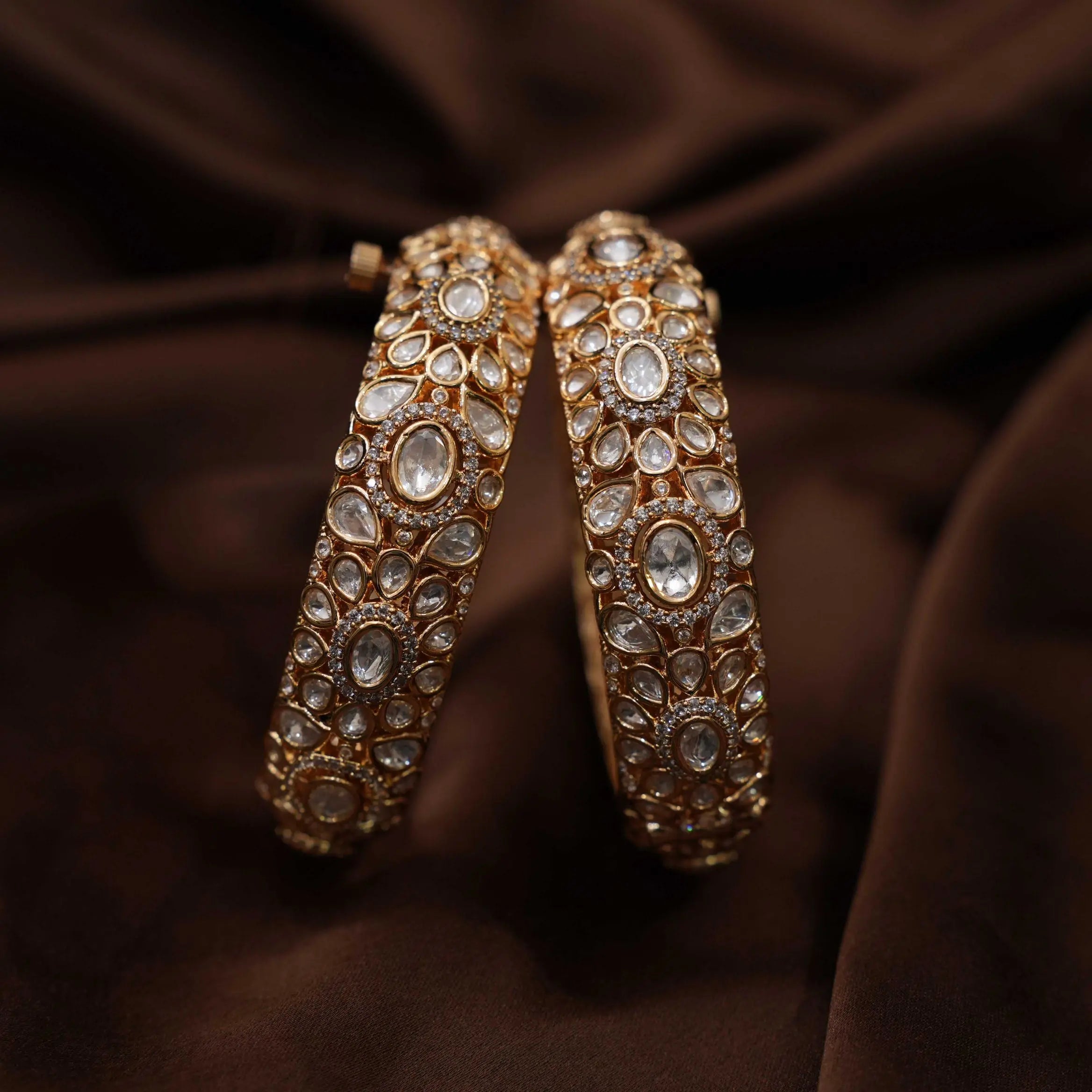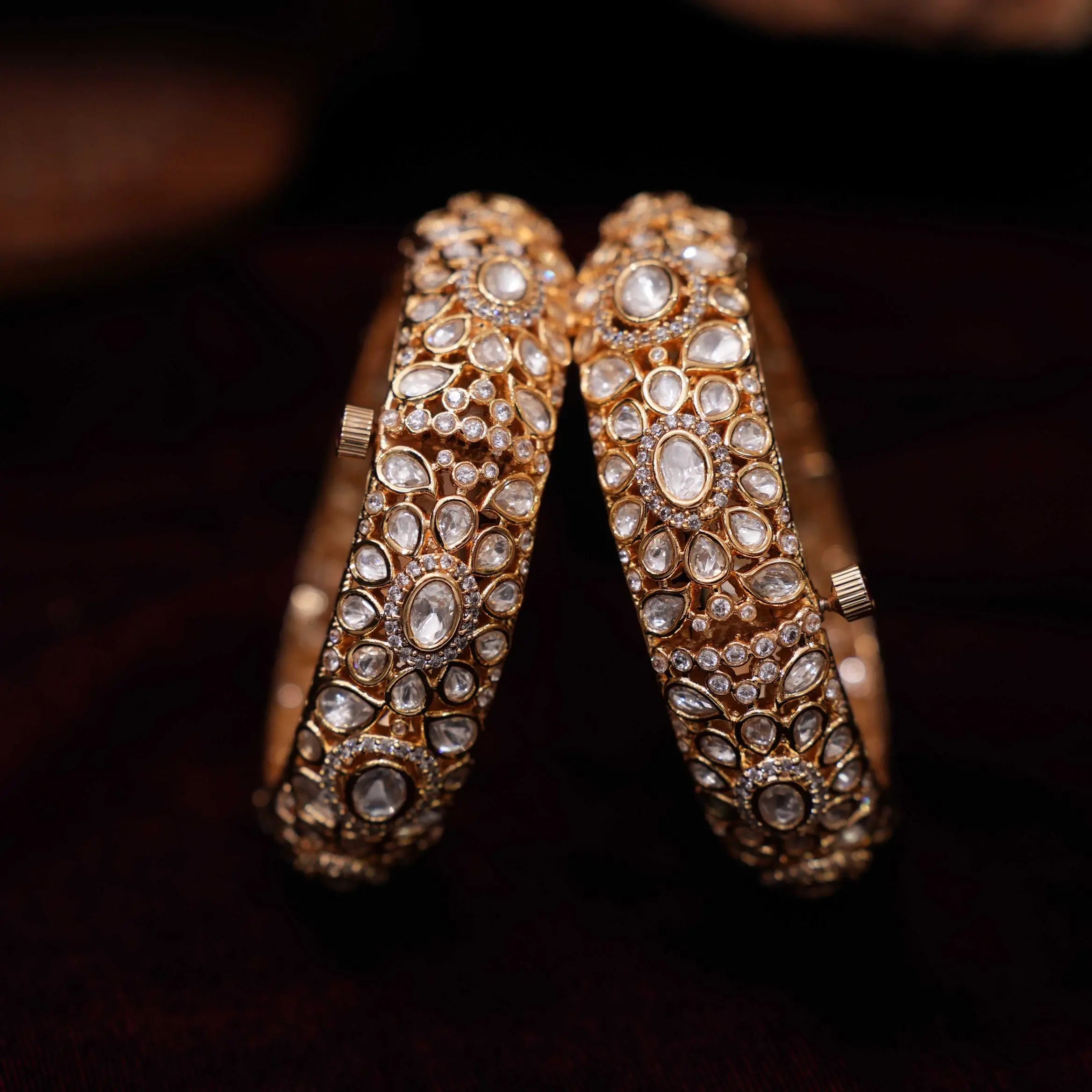 A stunning pair of handcrafted bangles, exquisitely studded with dazzling polki stones, complemented by shimmering white stones. These bangles effortlessly blend traditional elegance with timeless charm, making them a perfect accessory for festive occasions, weddings, or special celebrations. The intricate detailing and vibrant contrast of colors add a regal touch to any ensemble.