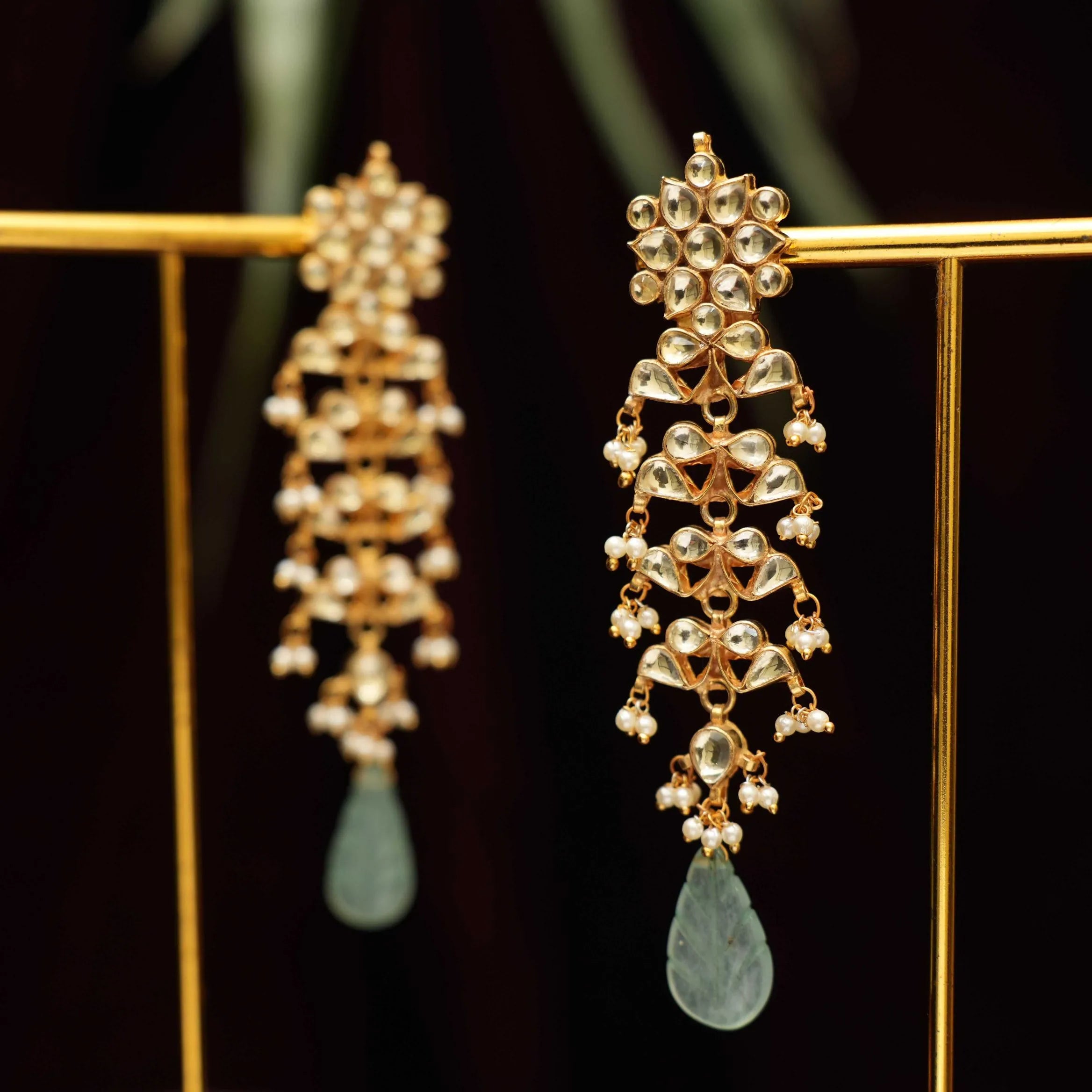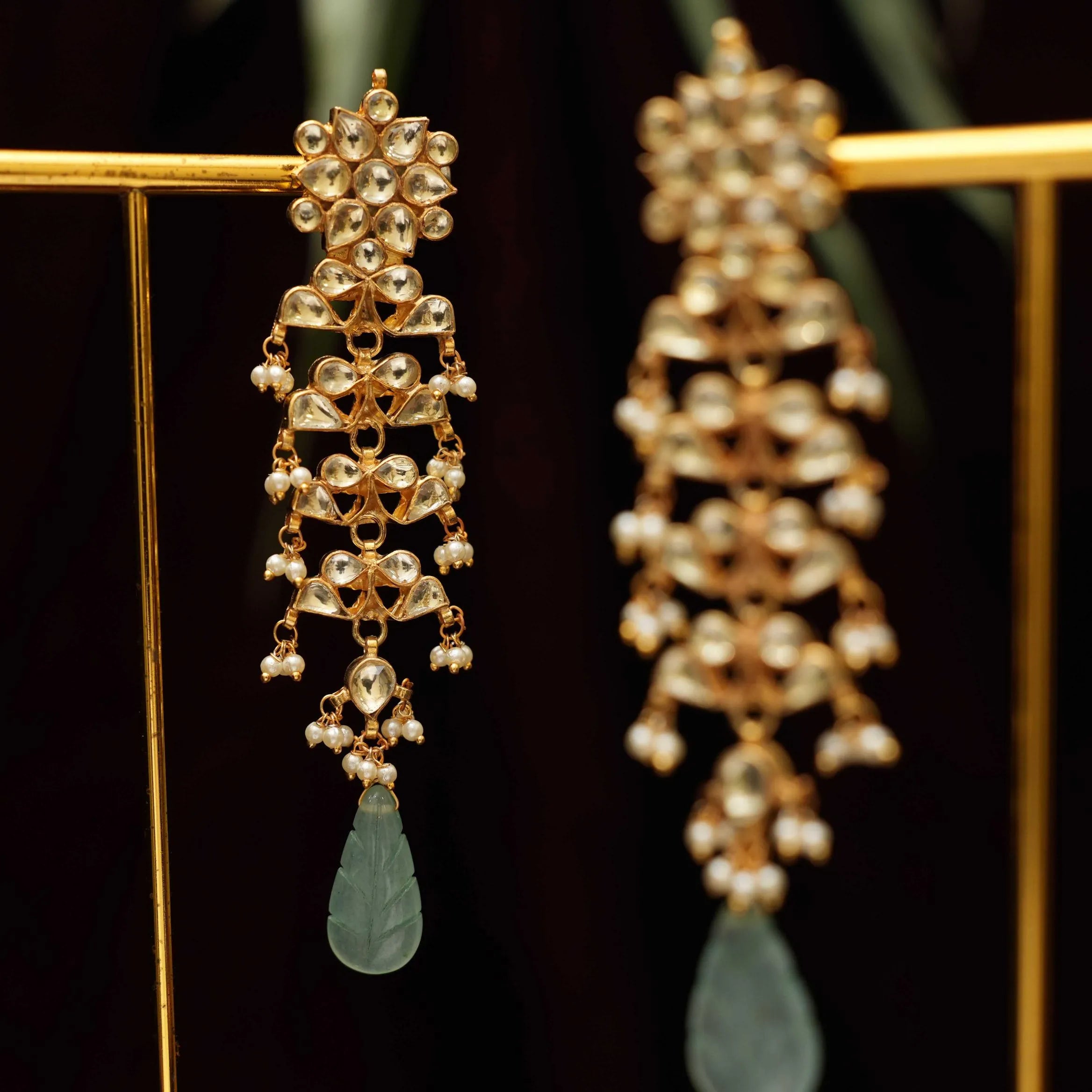 A beautiful designer earrings handcrafted with polki stones, highlighted by pearls & beads.
