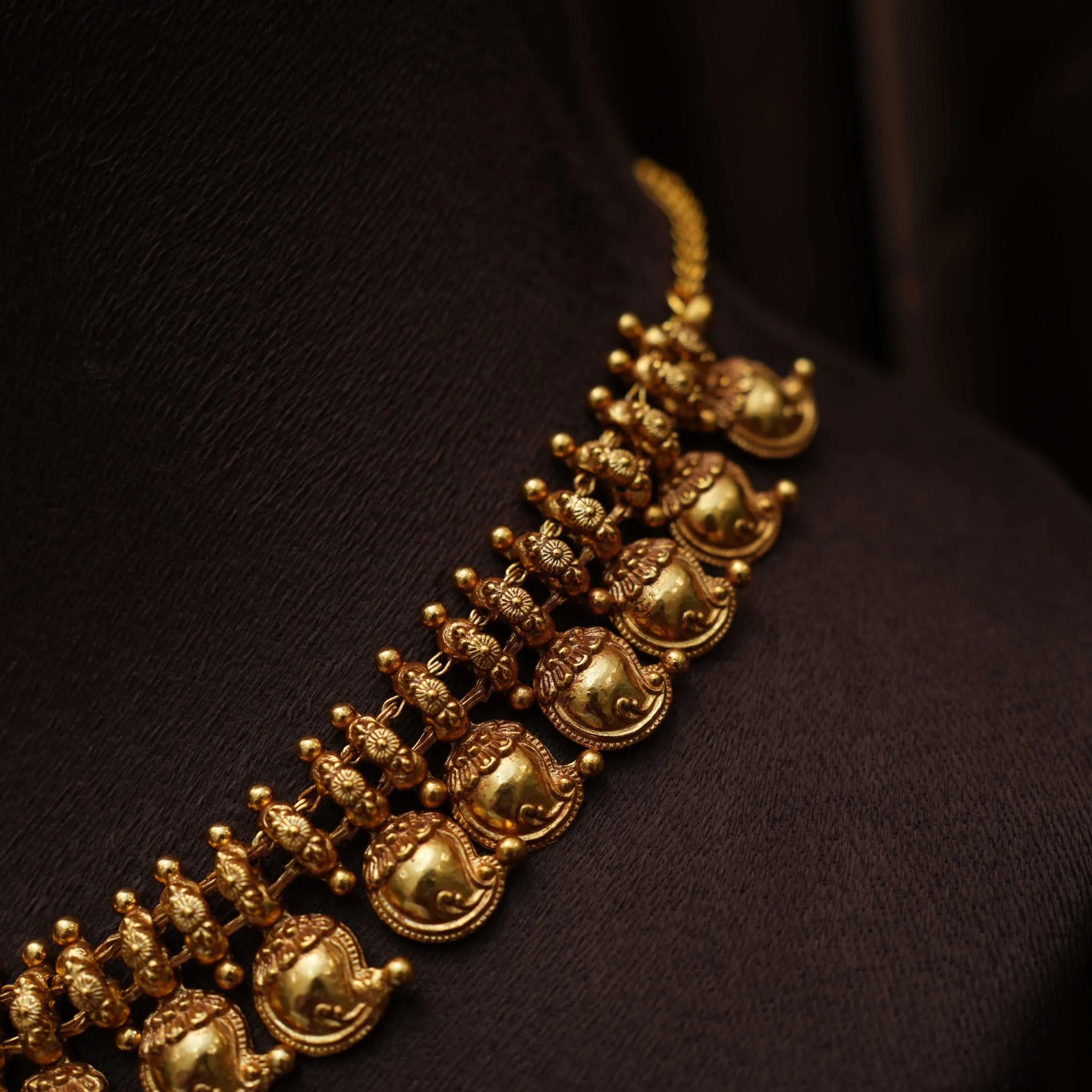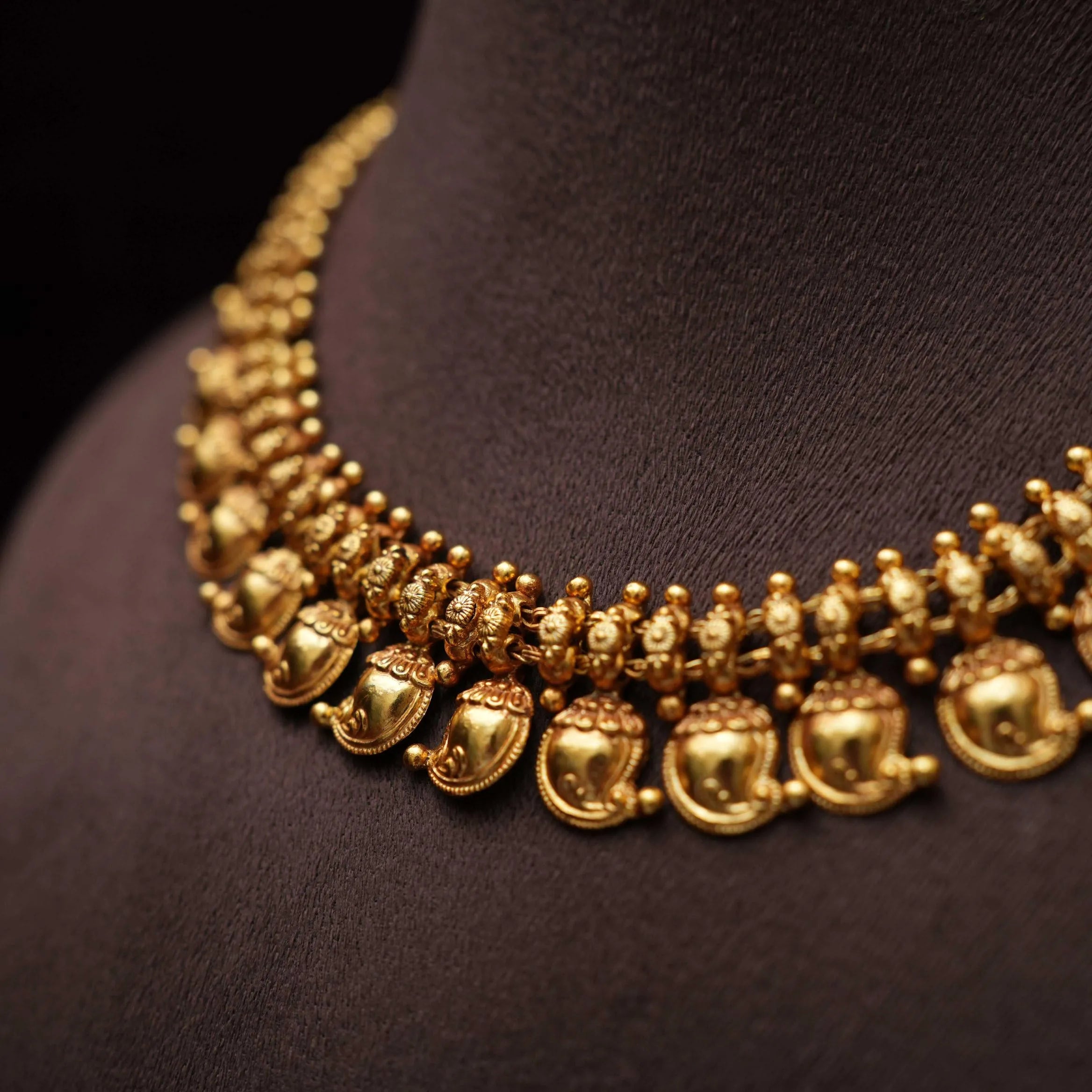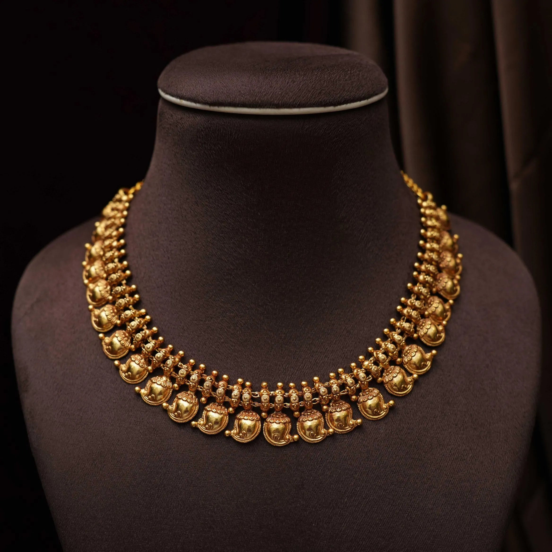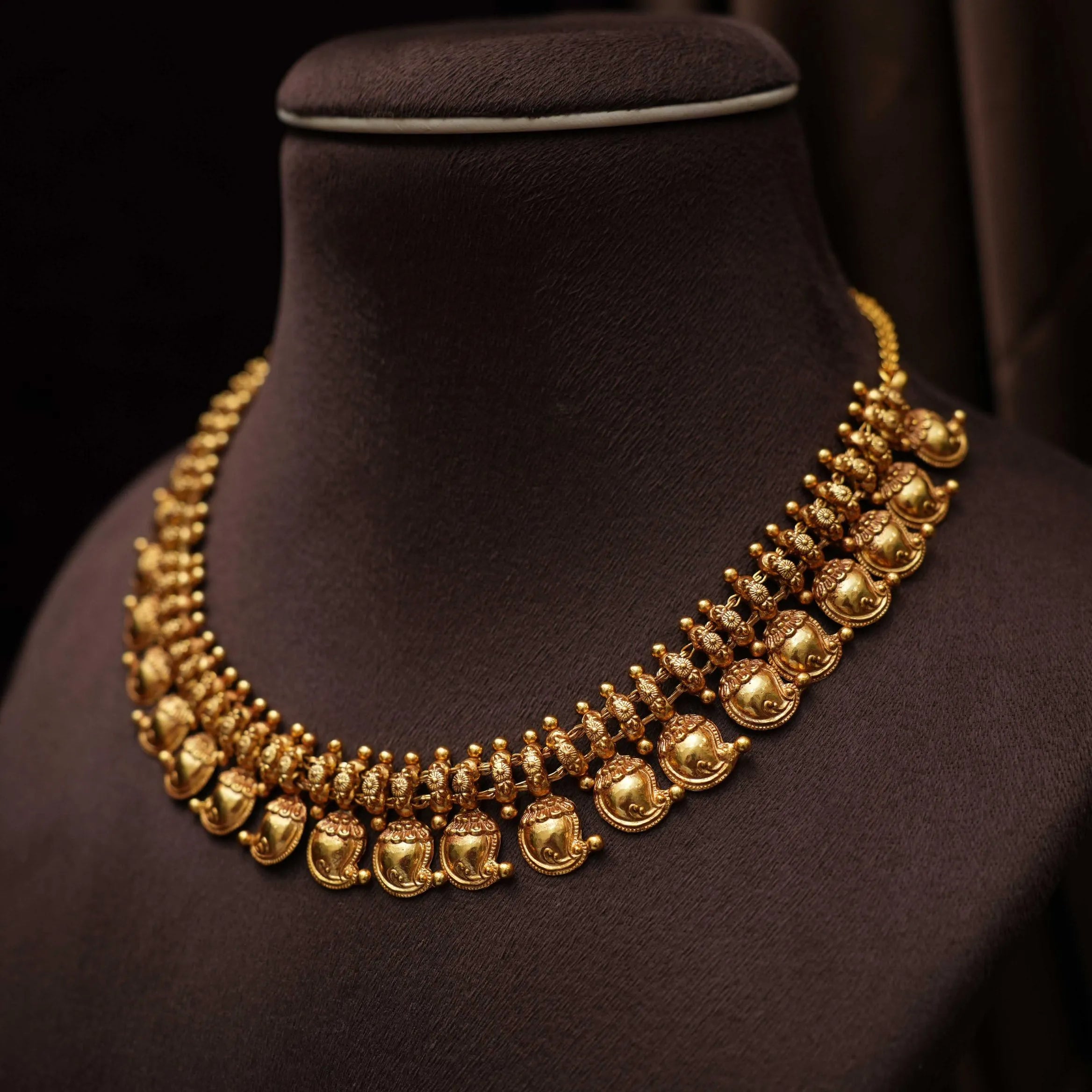 A beautifully handcrafted silver necklace in a traditional mango motif design, showcasing timeless craftsmanship and cultural elegance. This set is paired with a matching pair of ear studs, making it a perfect choice for festive occasions and traditional celebrations.