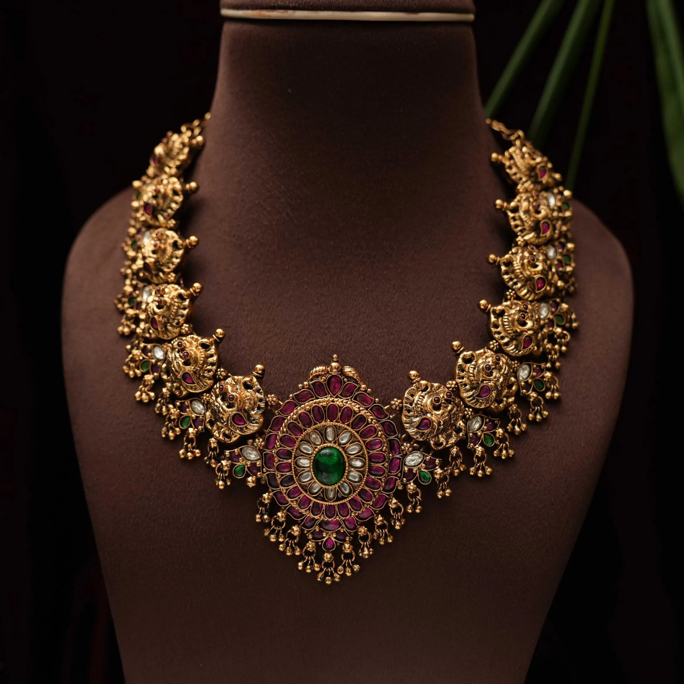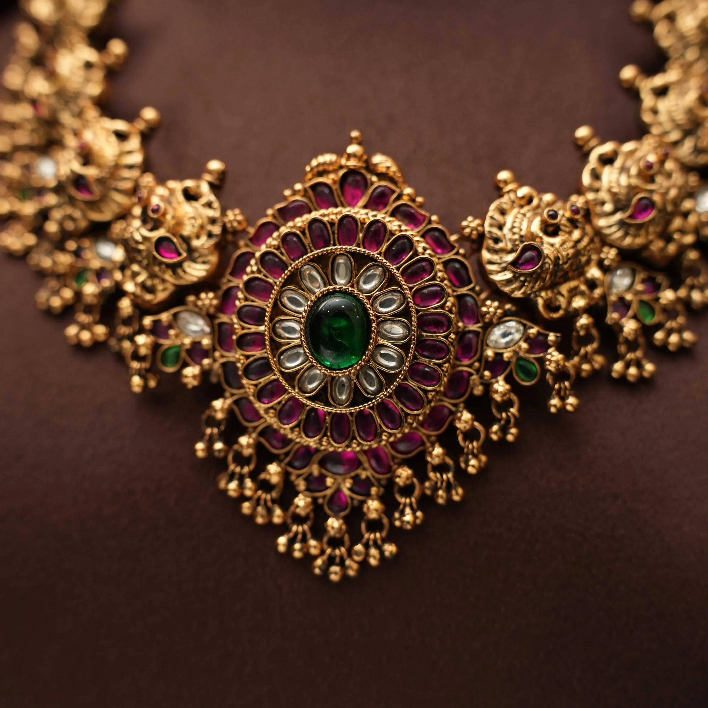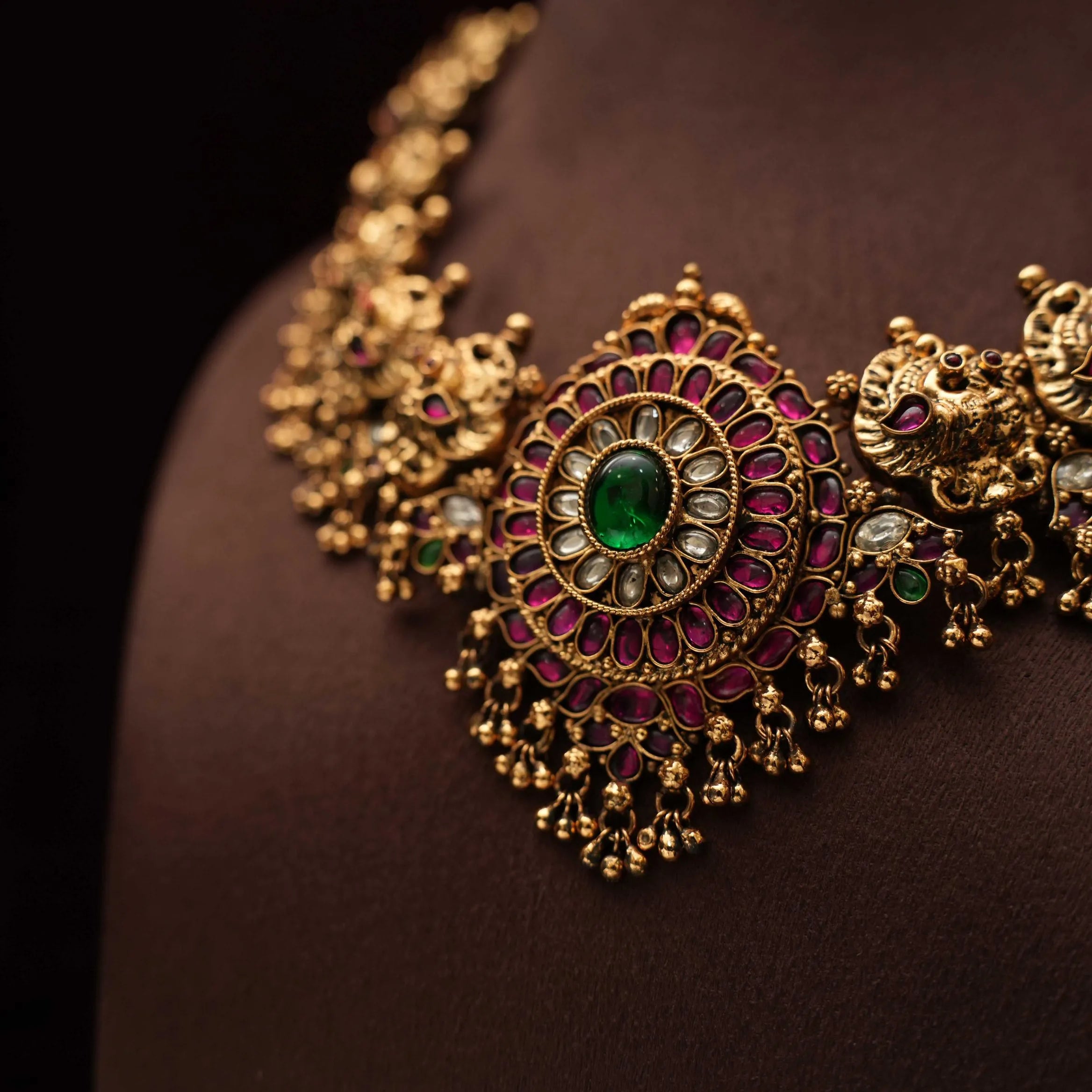 A beautiful necklace in traditional peacock motif studded with kemp stones & adorn with golden balls. This set comes with a pair of earrings and finely finished in Nagas finish.