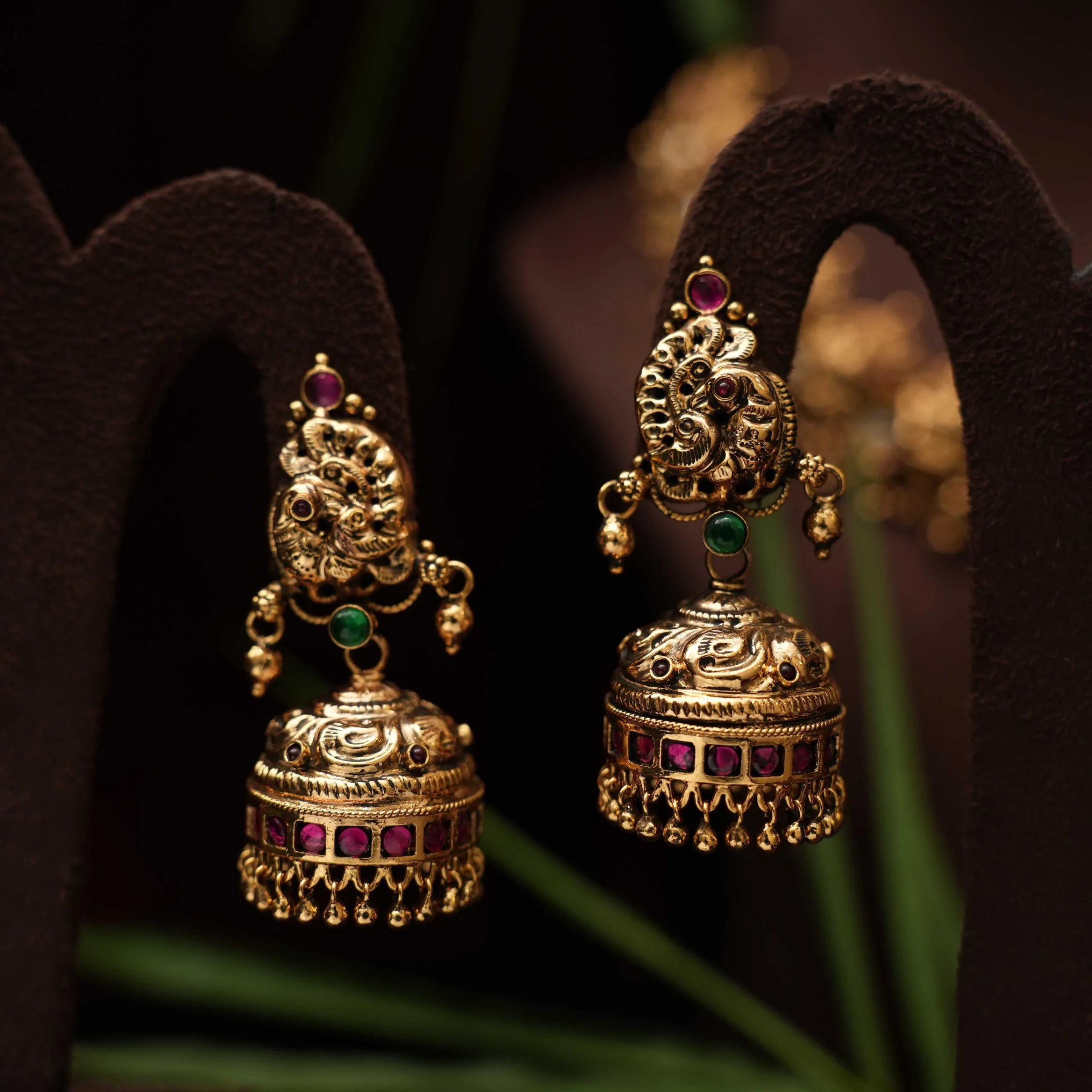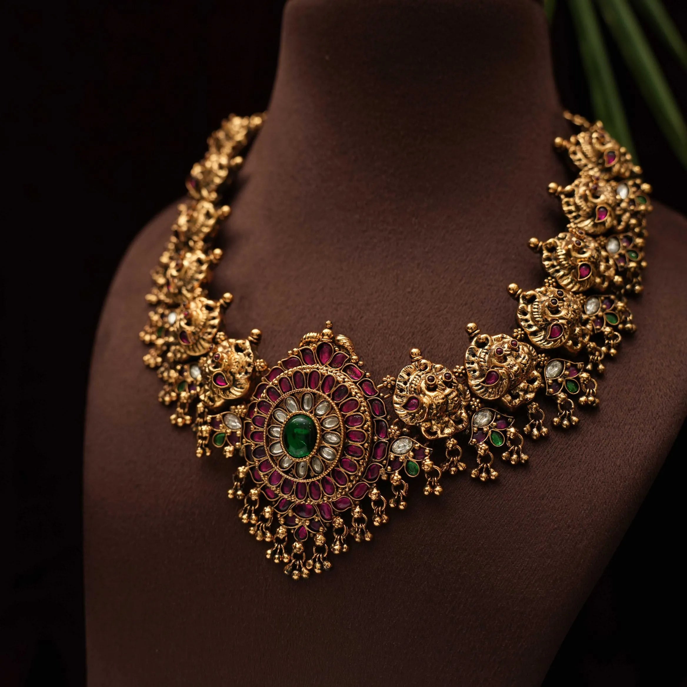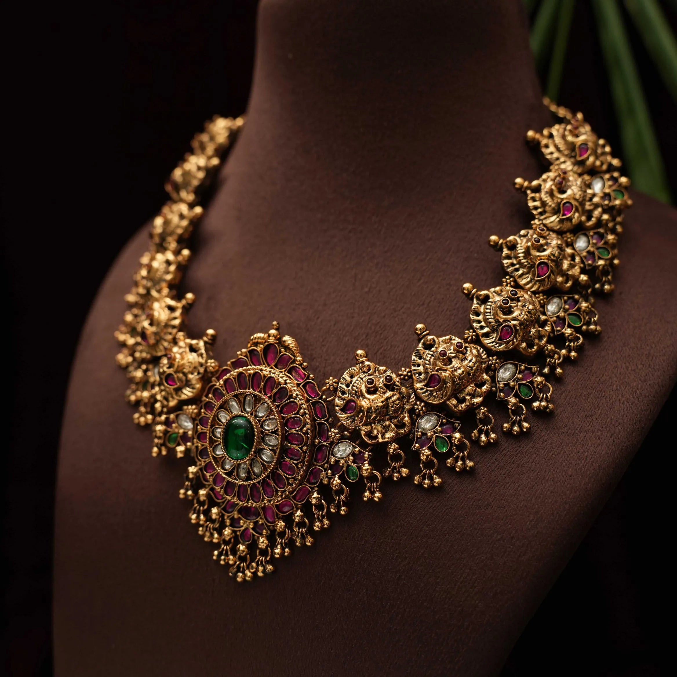 A beautiful necklace in traditional peacock motif studded with kemp stones & adorn with golden balls. This set comes with a pair of earrings and finely finished in Nagas finish.