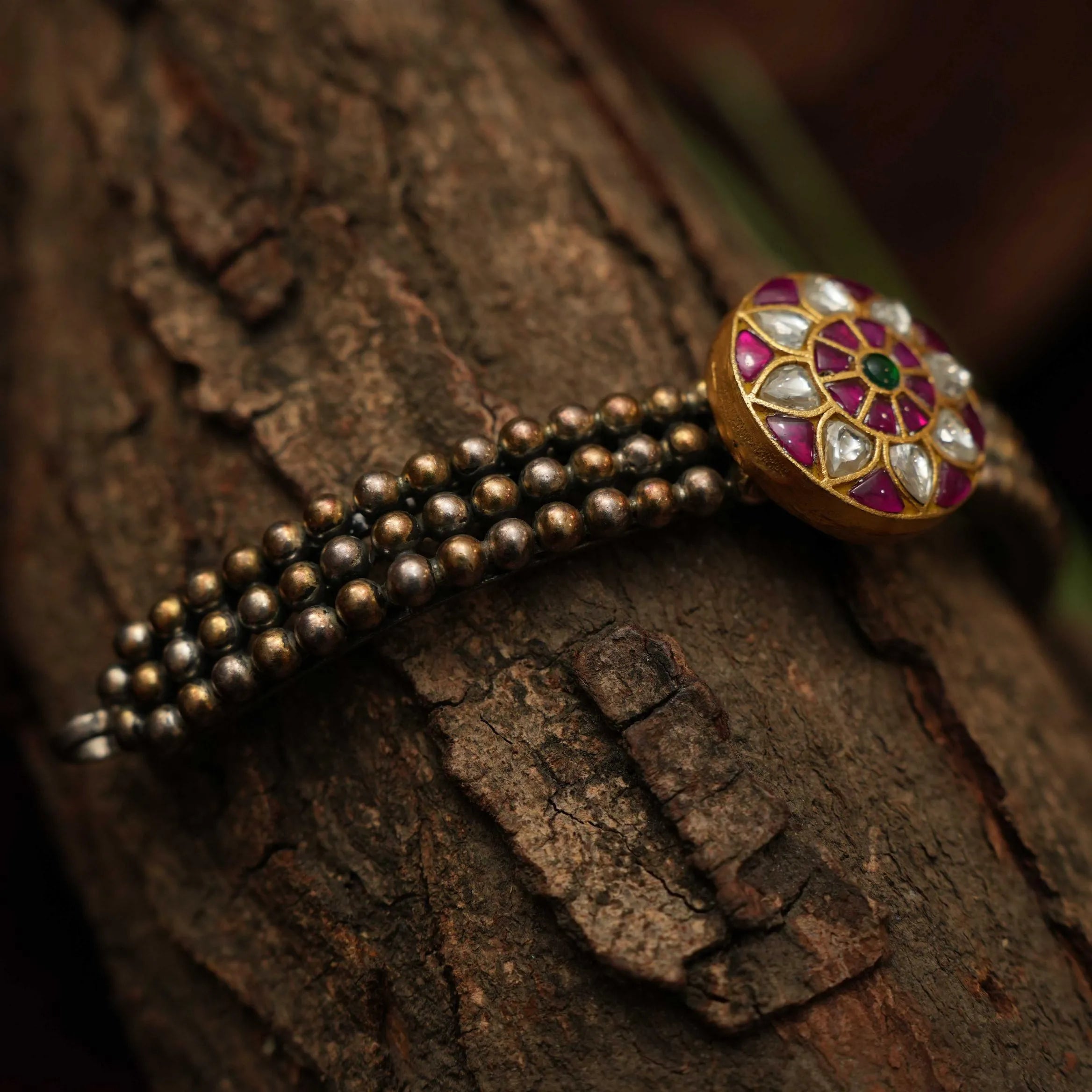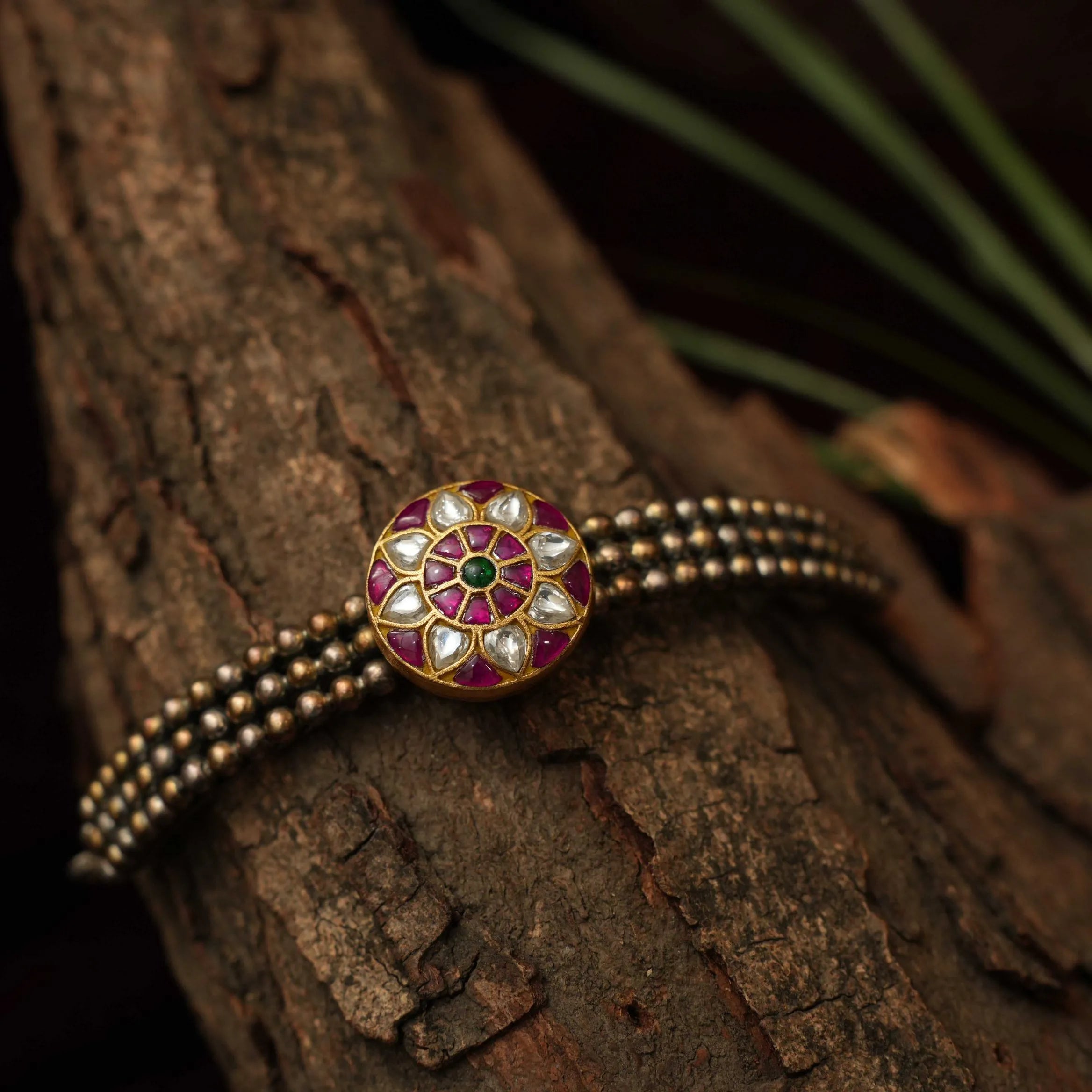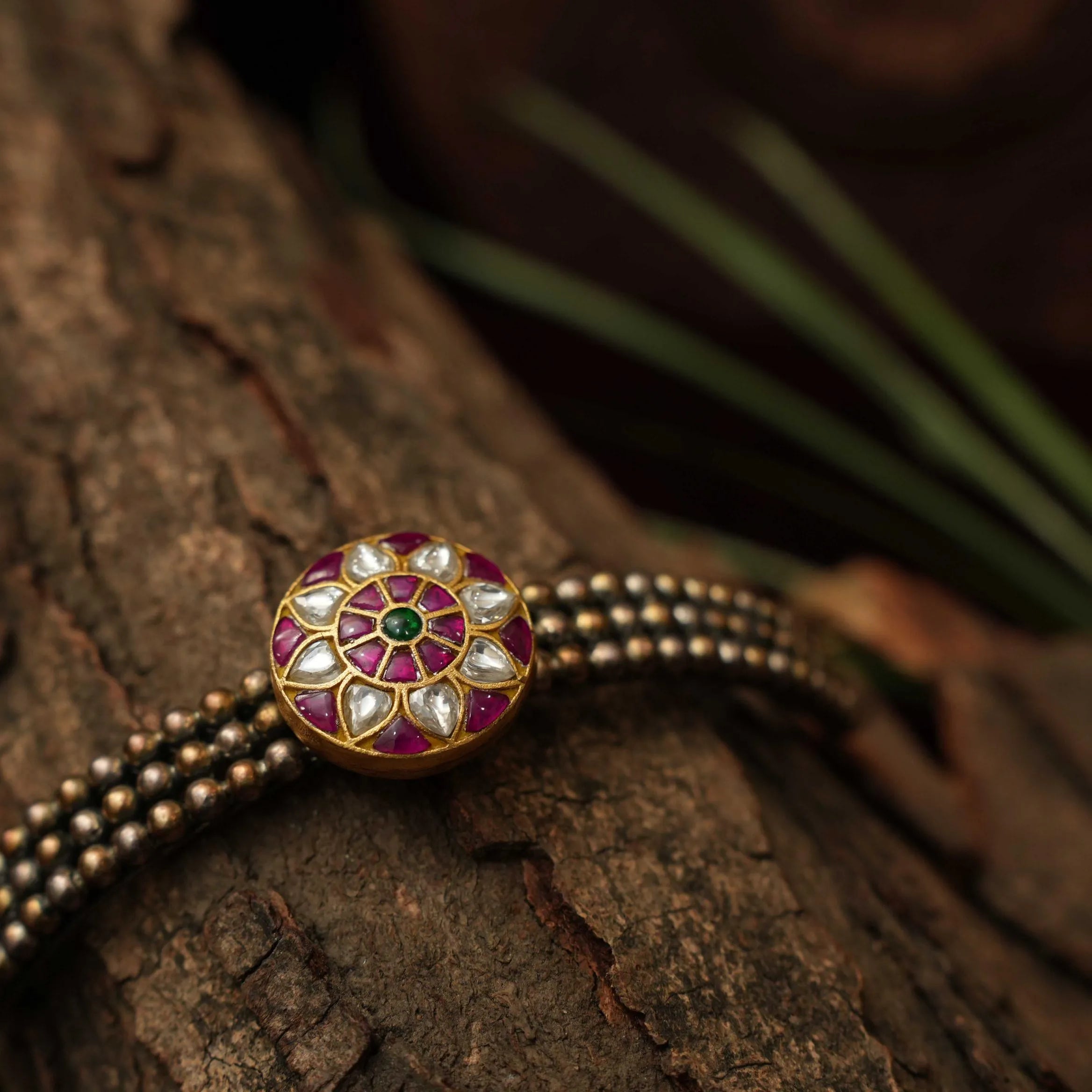 Embrace modern elegance with our contemporary 92.5 oxidized silver dual-tone choker, adorned with green and pink stones.