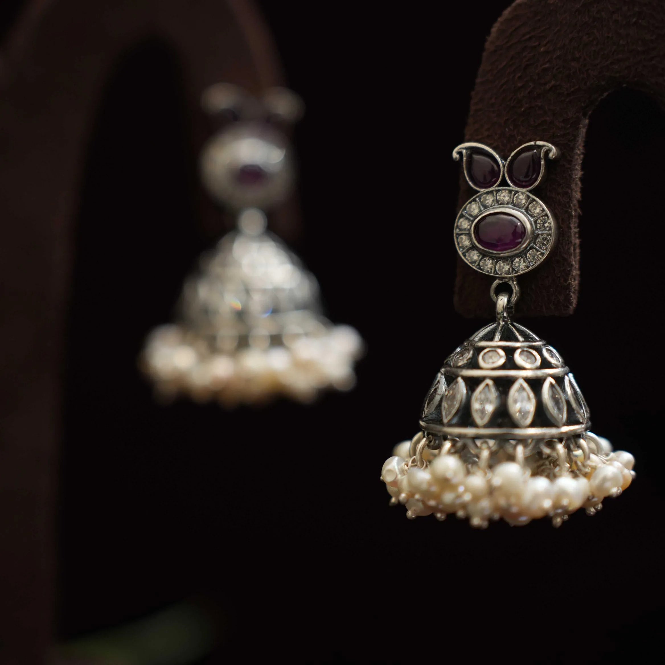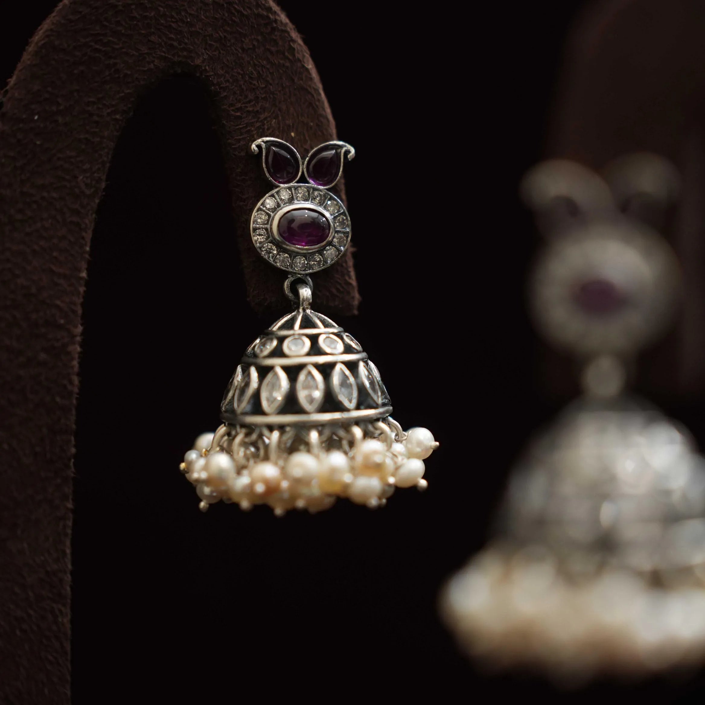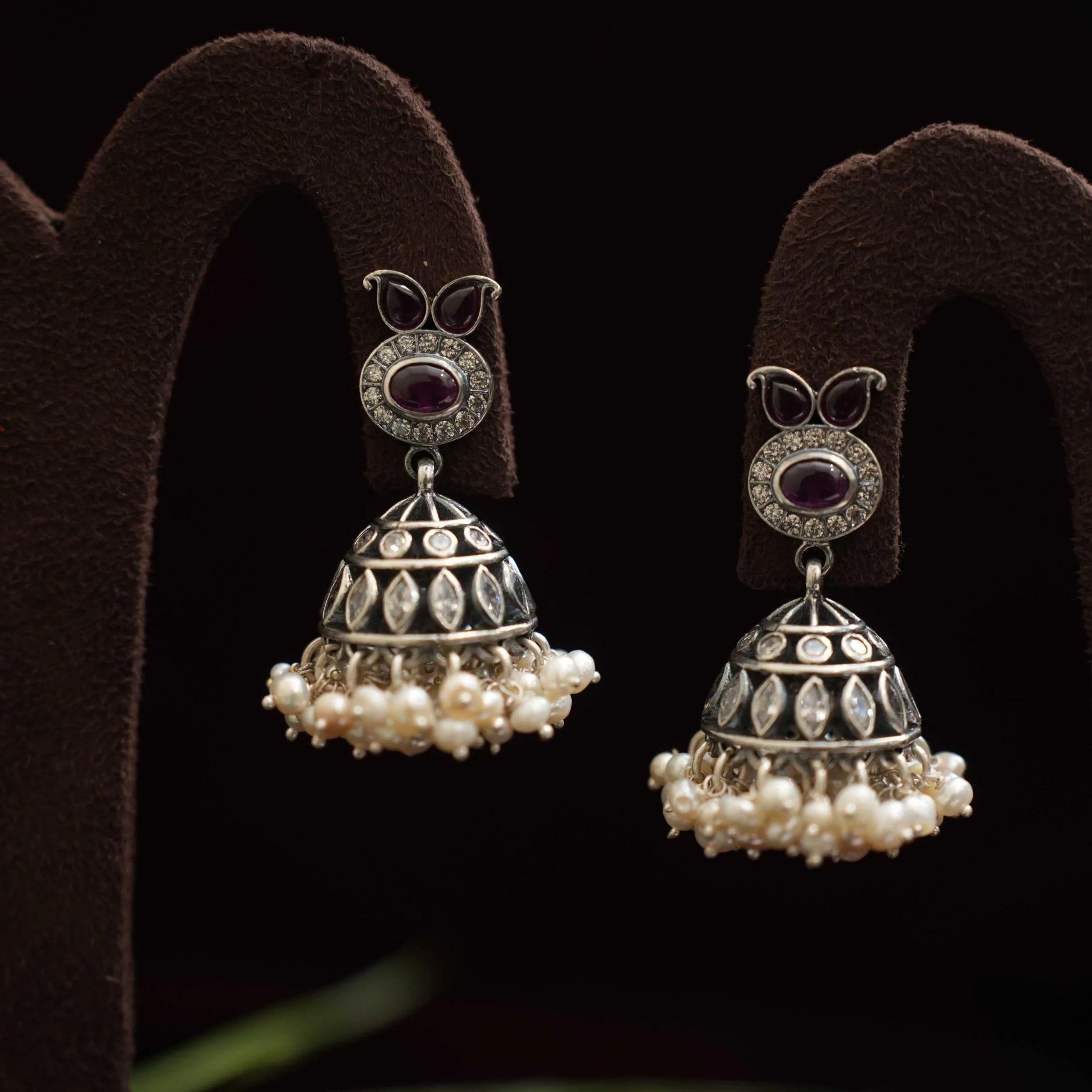 A unique silver oxidised jhumka earrings adorn with white and red kemp stones highlighted by pearls.