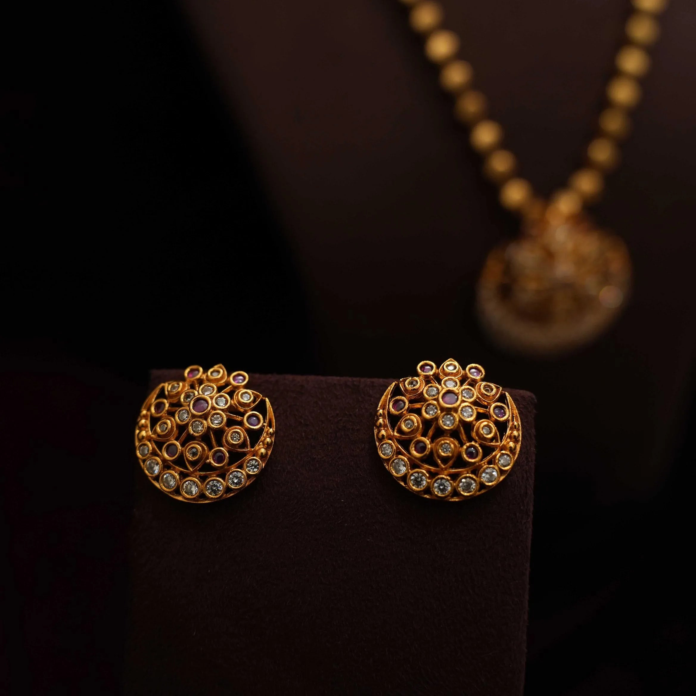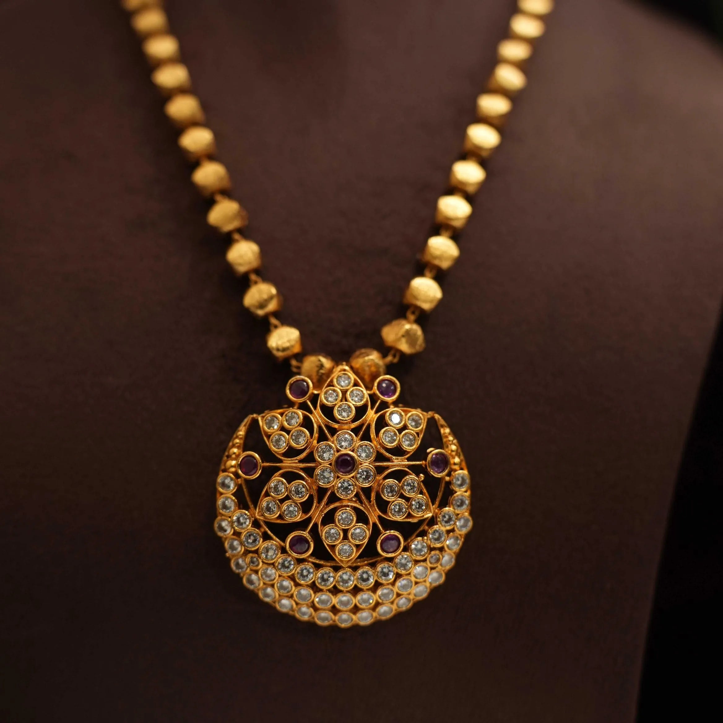 A timeless antique-finish necklace handcrafted with intricate filigree artistry, paired with matching earrings. The pendant features delicate floral detailing highlighted with ruby-toned stones, finished with clusters of emerald green beads and pearls for a regal touch. The chain is adorned with beautifully carved spherical beads that add texture, elegance, and traditional charm. This set comes with a pair of coordinating earrings, designed to beautifully complement the pendant with matching motifs and stones — perfect for weddings, festive occasions, and heritage-inspired looks.
