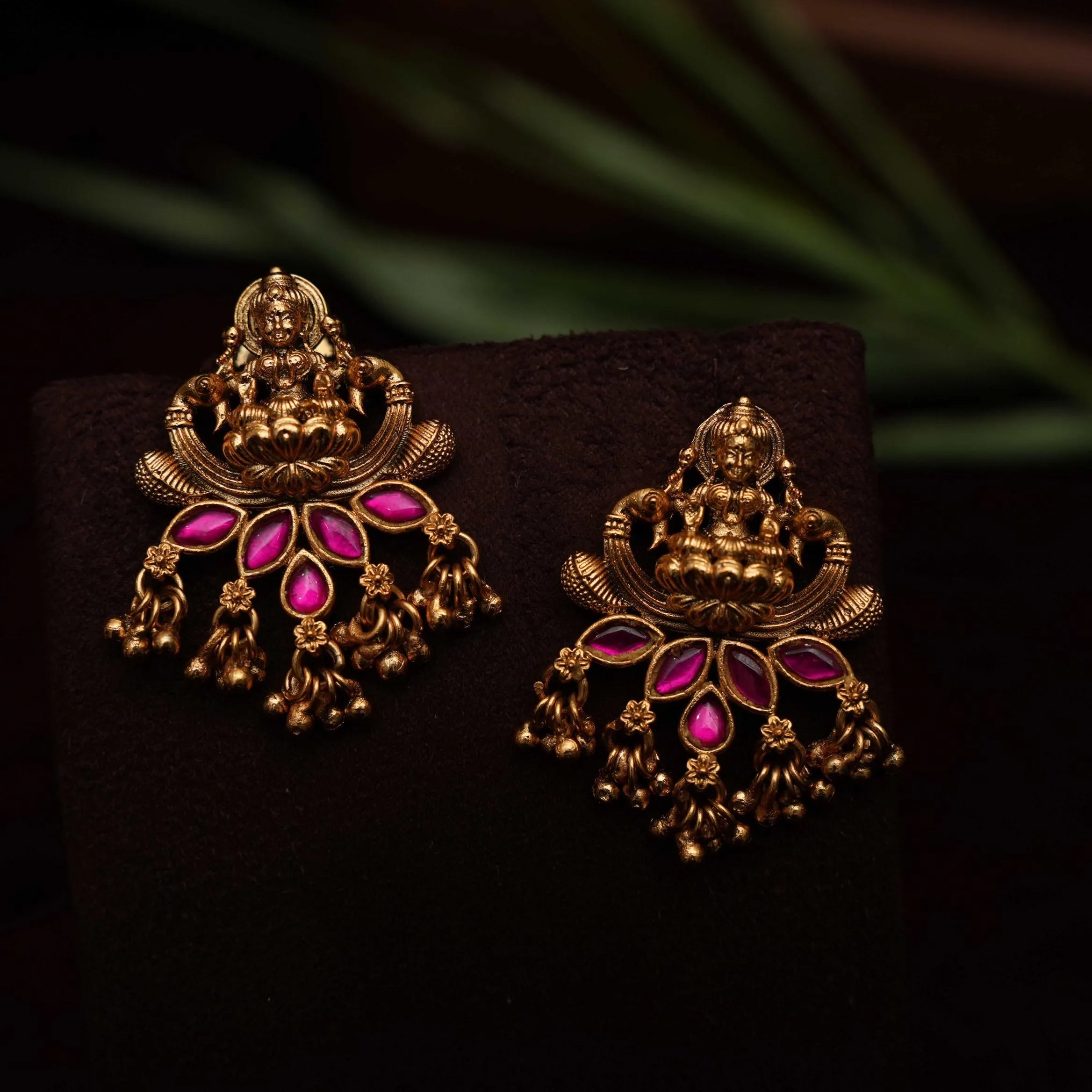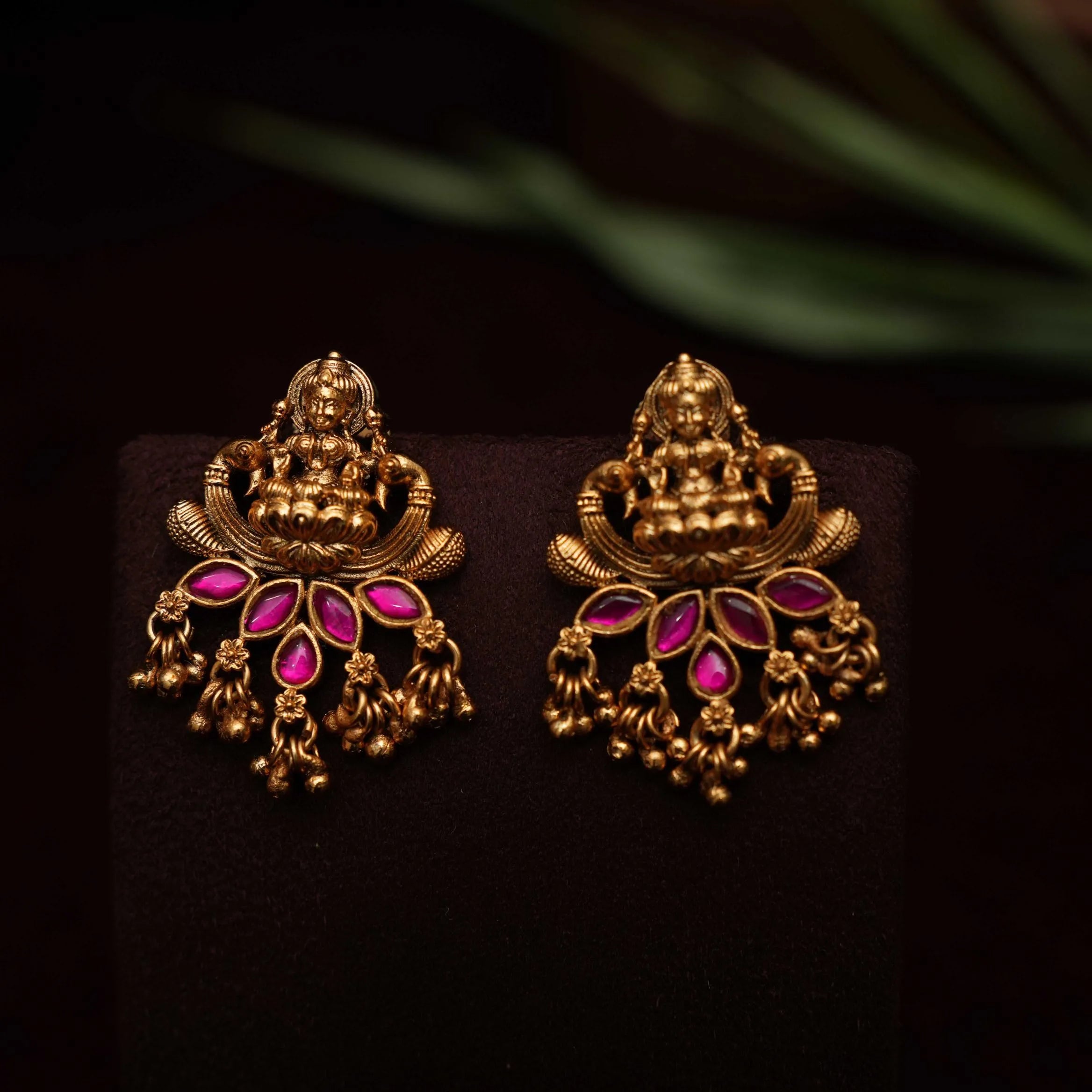 A simple & elegant ear stud in Goddess motif studded with kemp stones & cluster golden balls.