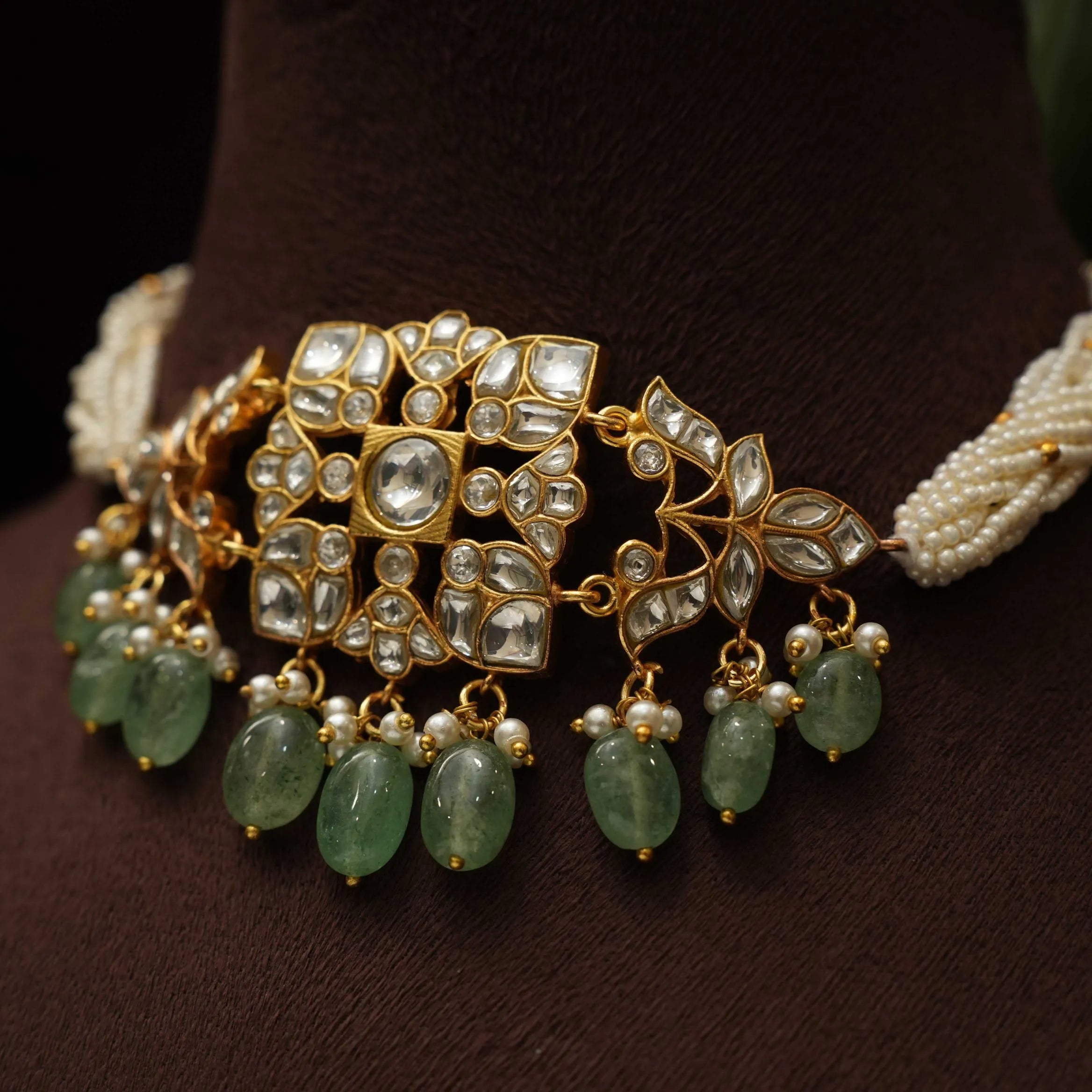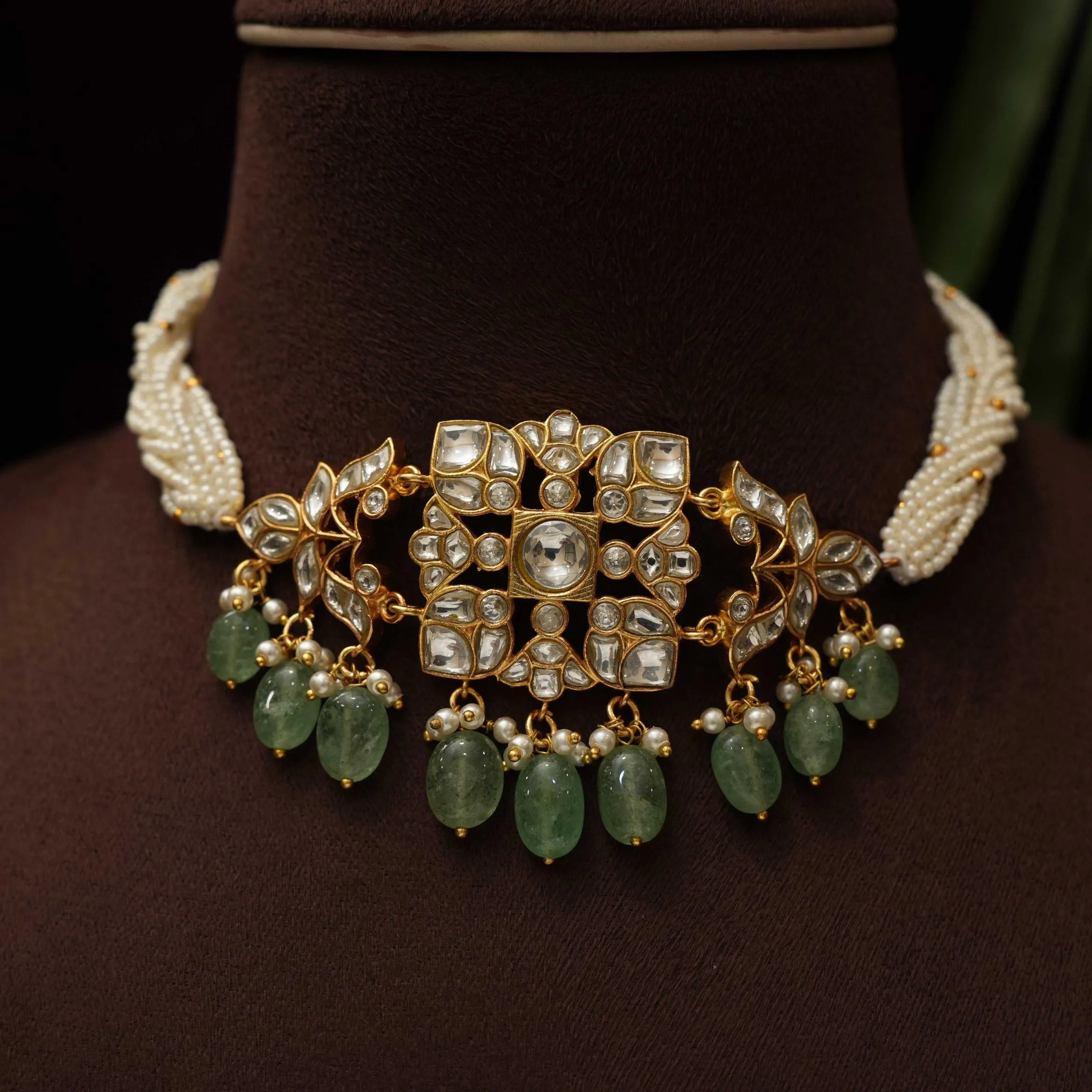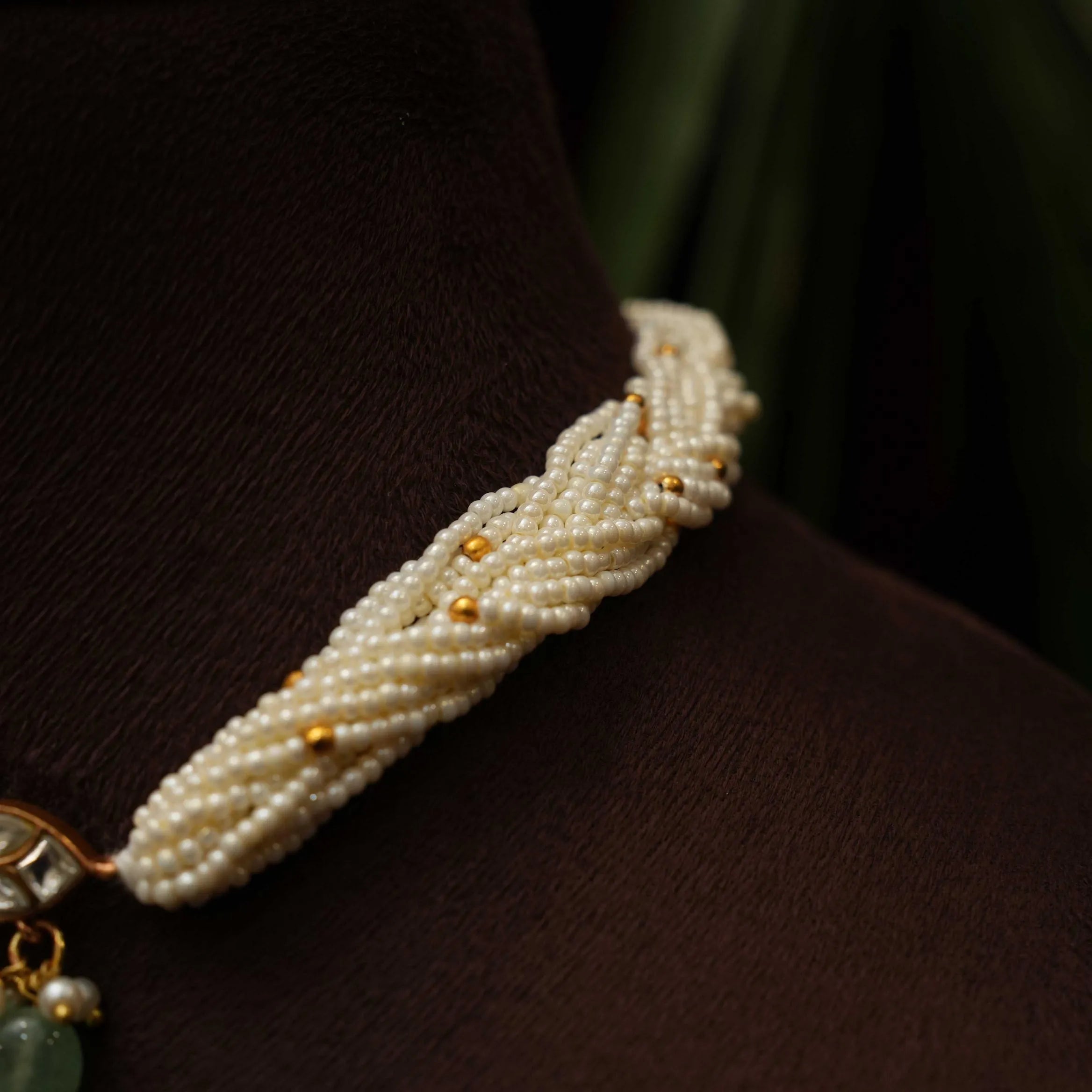 A beautiful choker handcrafted in pearls paired to polki pendant adorn with pearls and beads. This set comes with a pair of earrings.