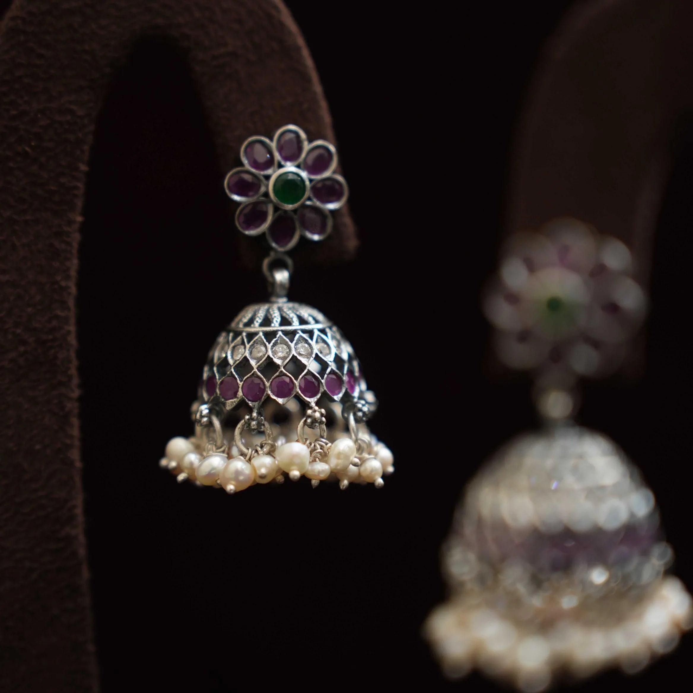 A beautiful silver oxidised jhumka earrings in floral motif studded with red and green stones finished with cluster of pearls.