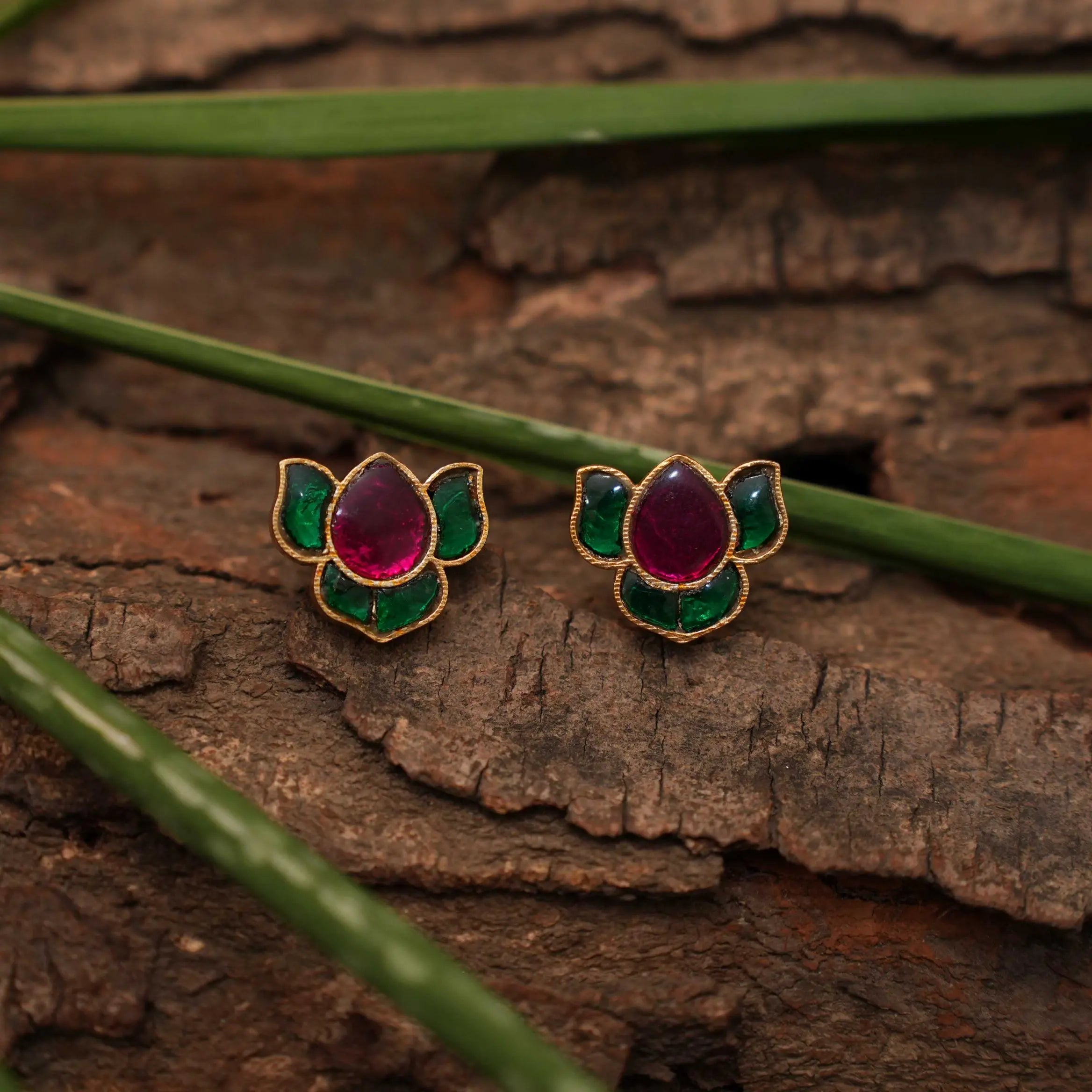 A beautiful silver ear stud in lotus motif adorn with red and green stones.