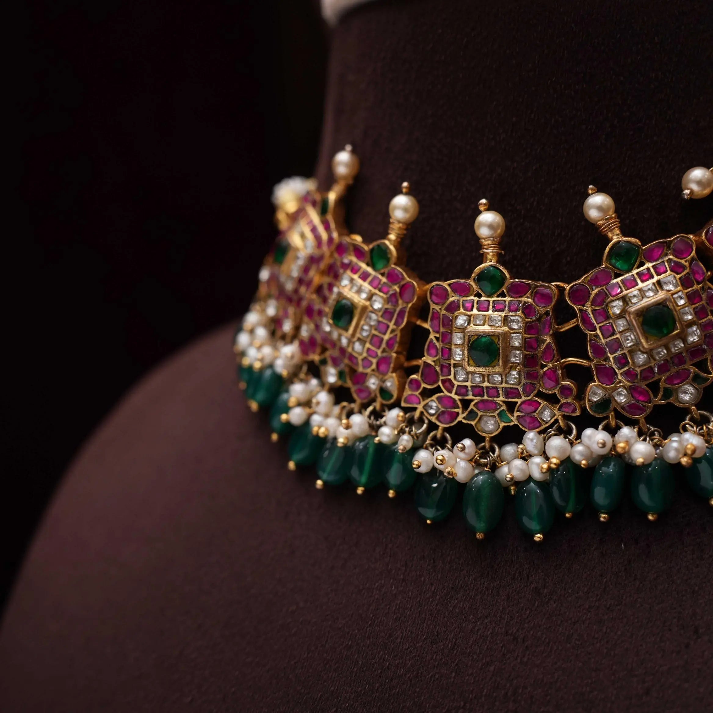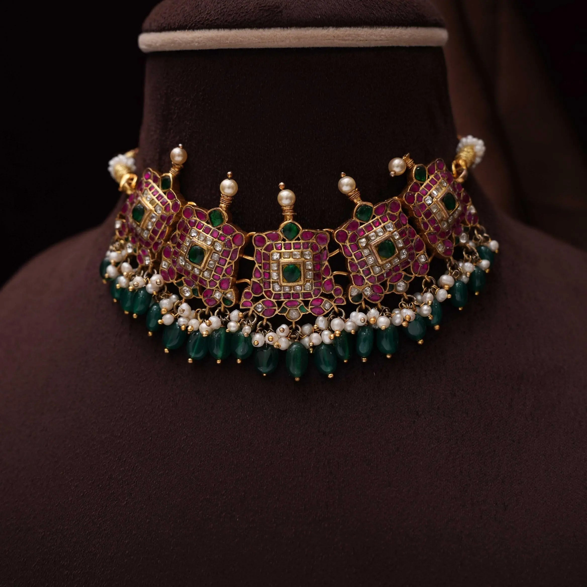 Adorn yourself in tradition with our 92.5 gold-plated silver choker necklace, a striking piece that beautifully blends cultural heritage with modern opulence. Featuring vibrant and bright stones, this choker radiates elegance and charm, making it an ideal accessory for festive occasions and special celebrations.